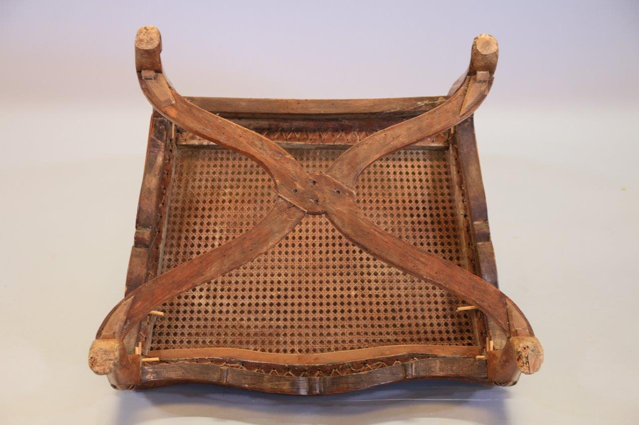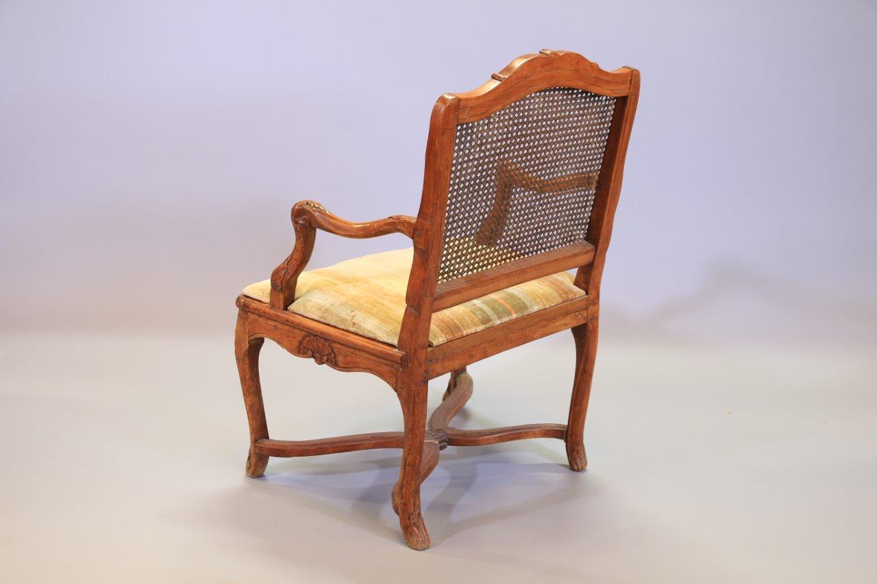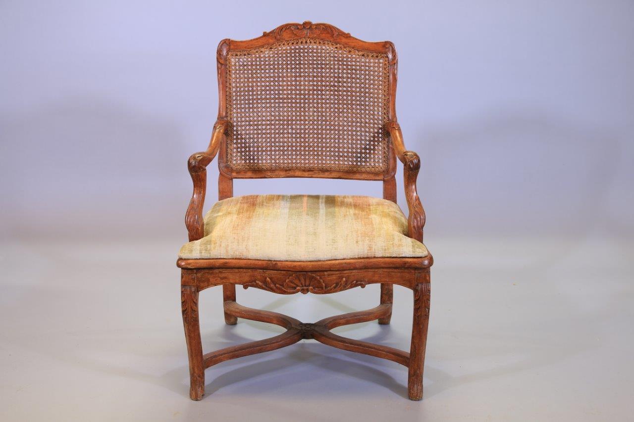 en hêtre mouluré et sculpté. L'amortissement du dossier à décor d'une coquille dans un entourage de feuilles d'acanthe, les accotoirs sculptés de feuillages reposant sur des supports mouvementés. La ceinture est ornée d'une coquille dans un entourage feuillagé. Quatre pieds cambrés réunis par une entretoise en X dont la partie centrale est décorée d'une fleurette.