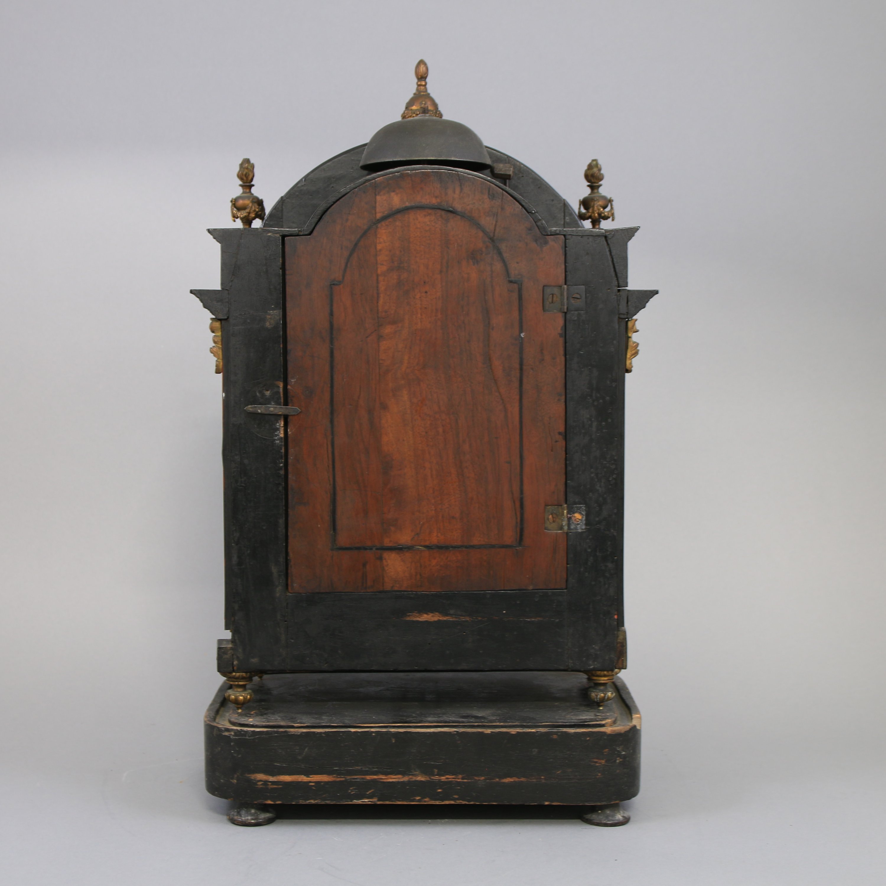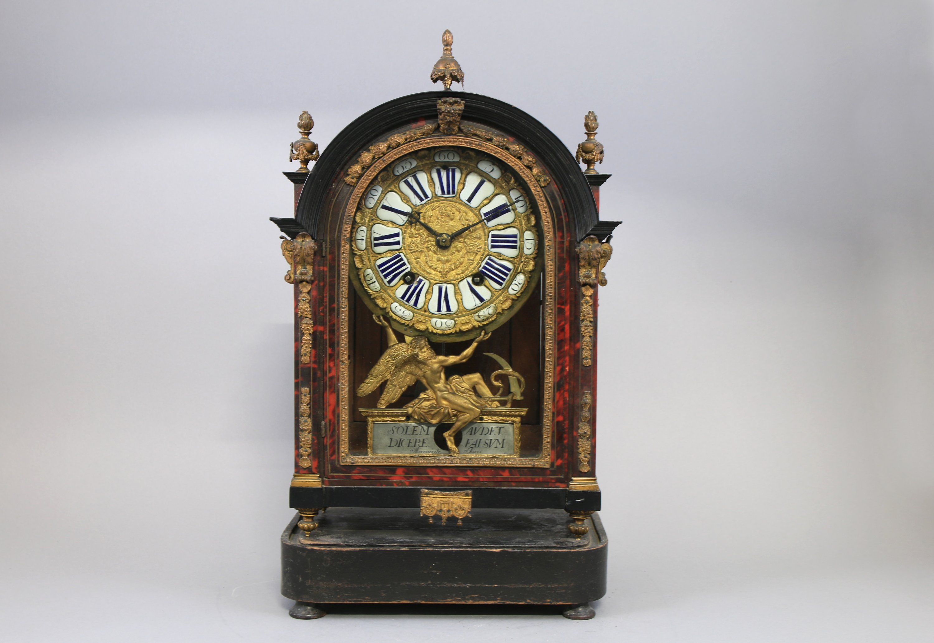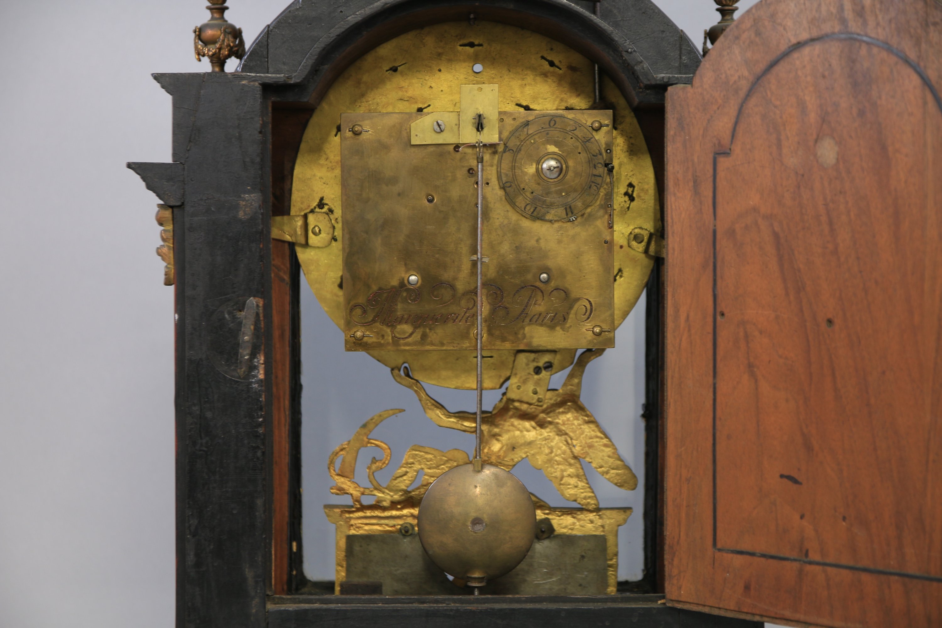 en ébène, placage d'ébène et écaille. Le cadran en laiton à décor en repoussé d'un profil entouré de deux dauphins indique les heures par des chiffres romains et les minutes par des chiffres arabes dans des cartouches en émail. Il est soutenu par Chronos avec la mention "Solem Avdet / Dicere Falsum". Signé "Marguerite Paris". La partie supérieure à décor de pots à feu prolongés par des pilastres. Elle repose sur quatre pieds toupies. La platine signée "Marguerite Paris". Suspension à Brocot.