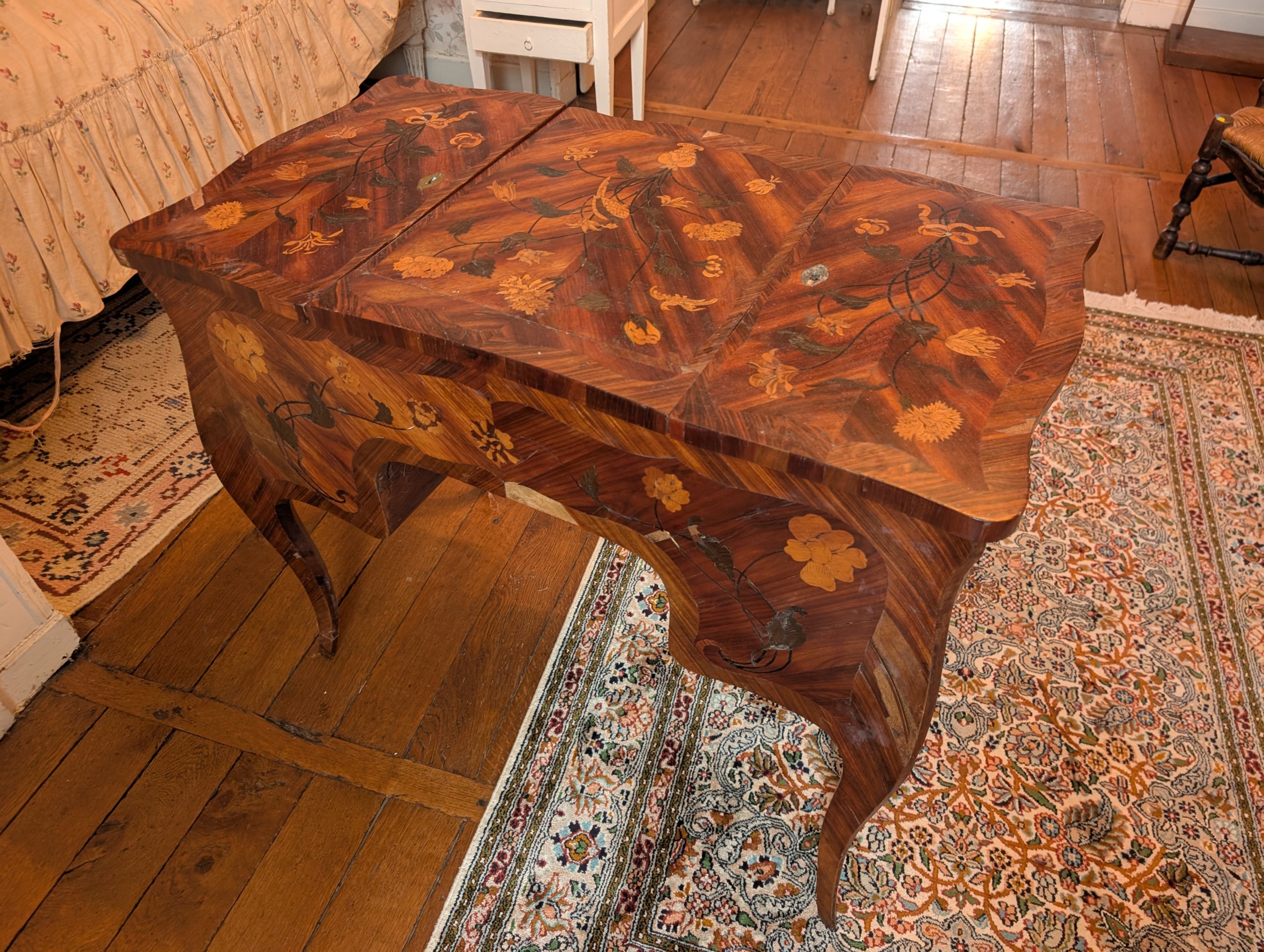 en marqueterie, ouvrant sur le dessus à trois abattants, découvrant un miroir et des casiers garnis en partie de pots à crème en porcelaine. La façade ouvre à une tablette et quatre tiroirs.