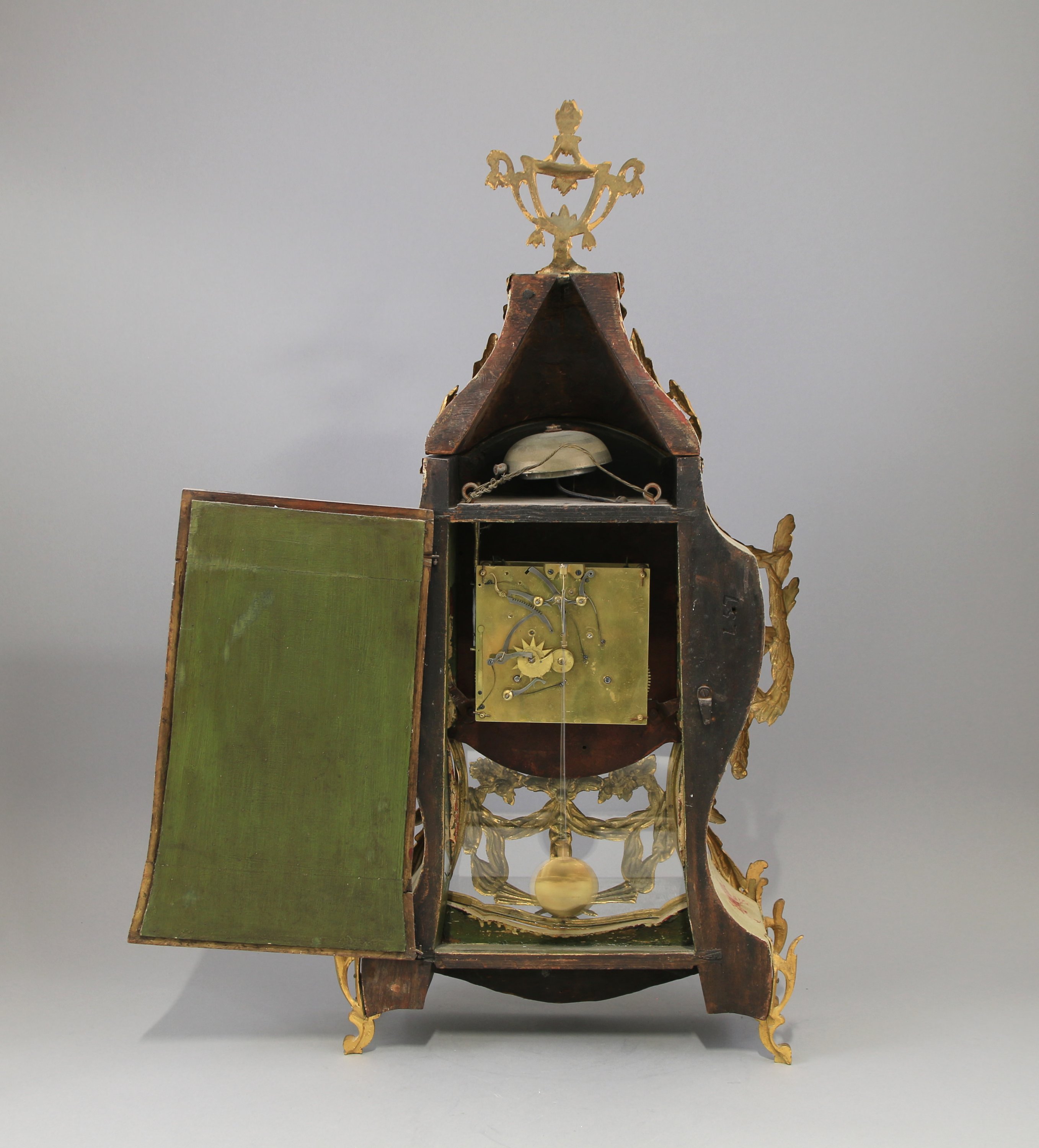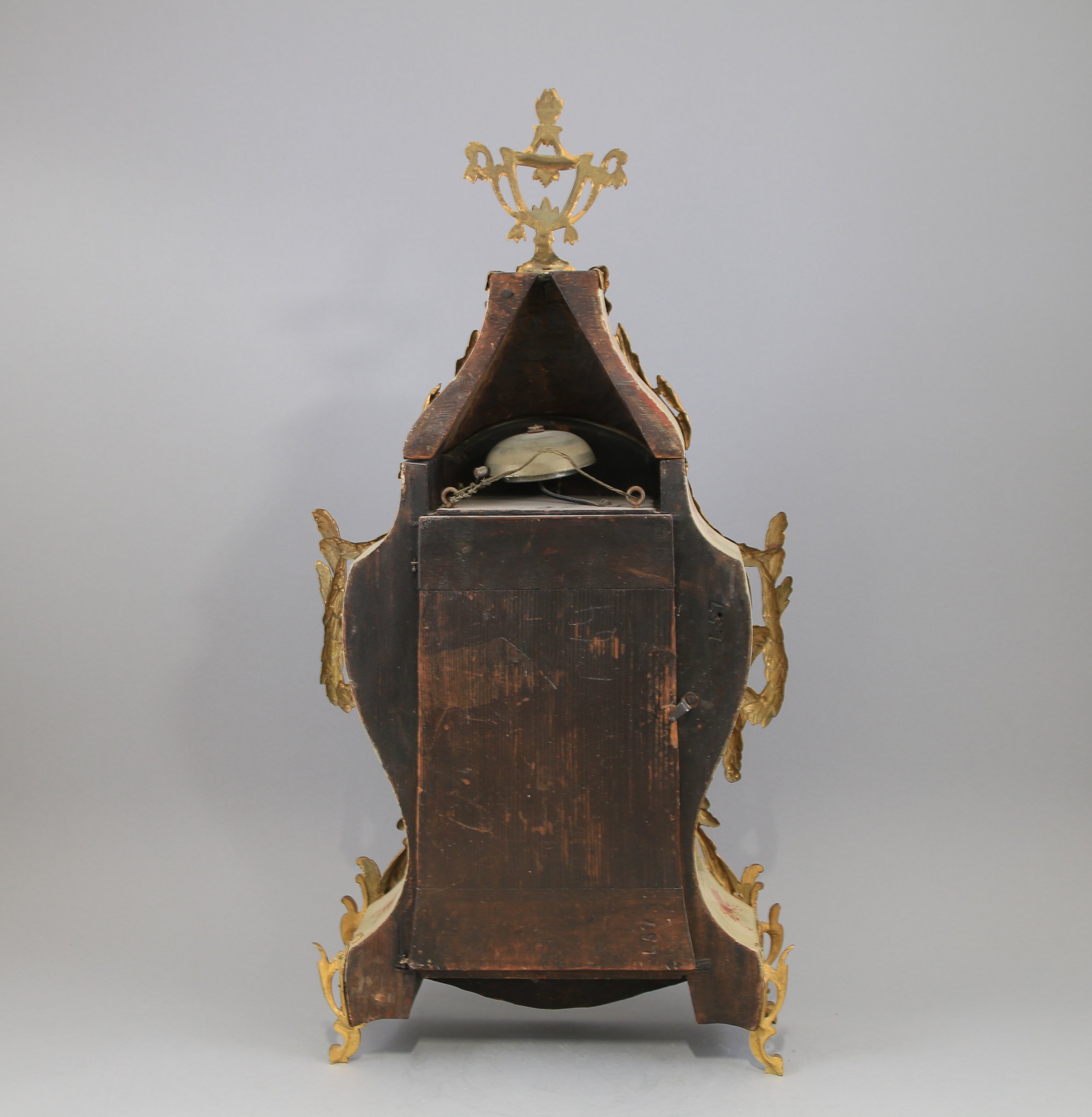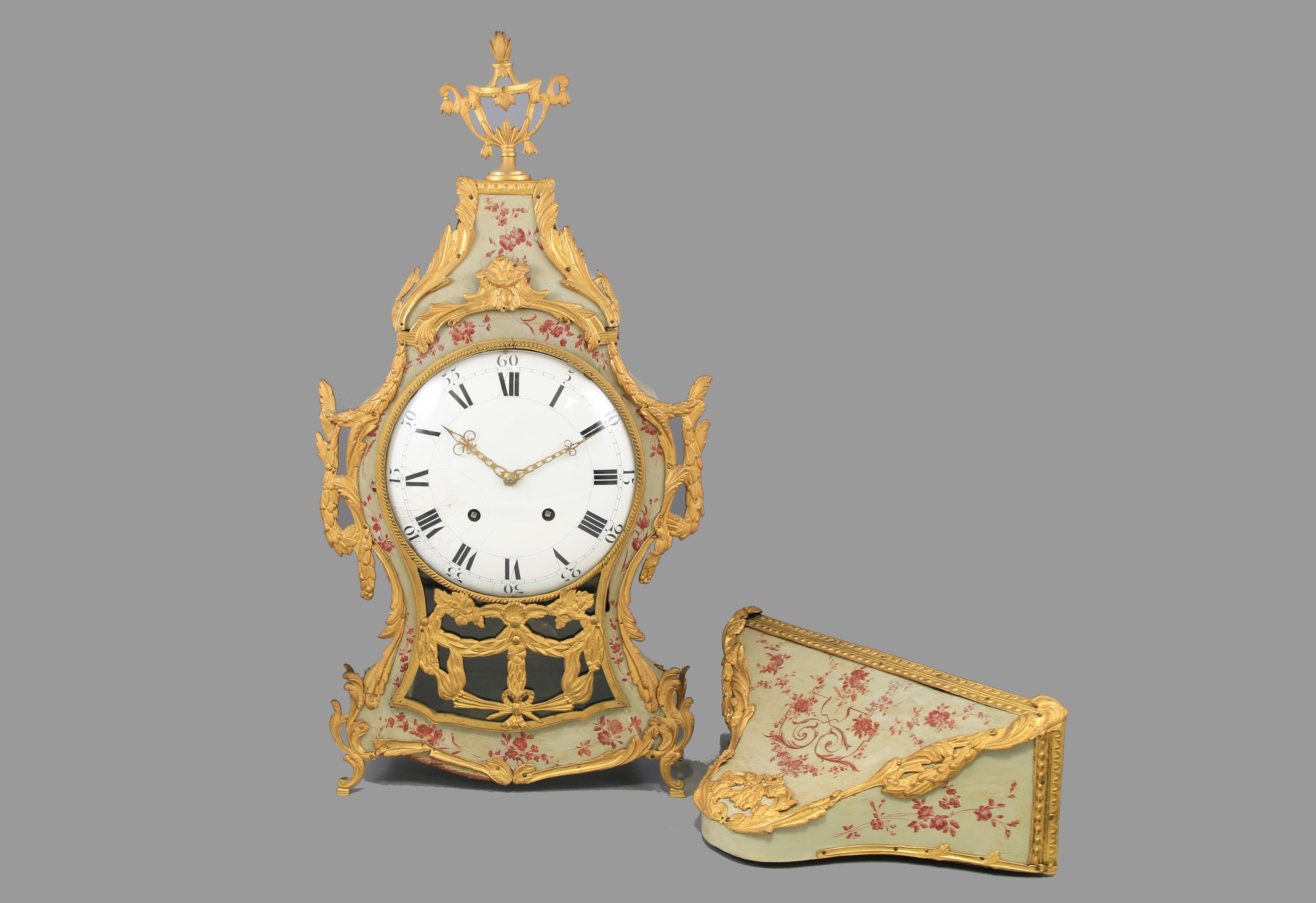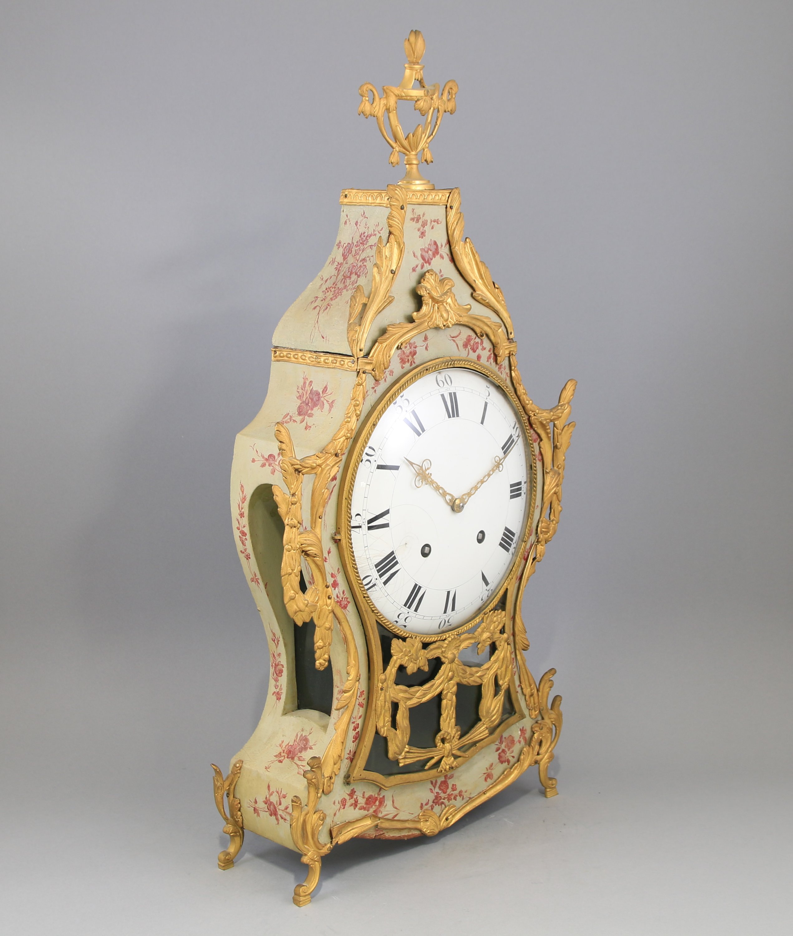 en vernis Martin coiffé en partie supérieure d'un vase. Le cadran émaillé blanc indiquant les heures en chiffres romains, les minutes par un chemin de fer.