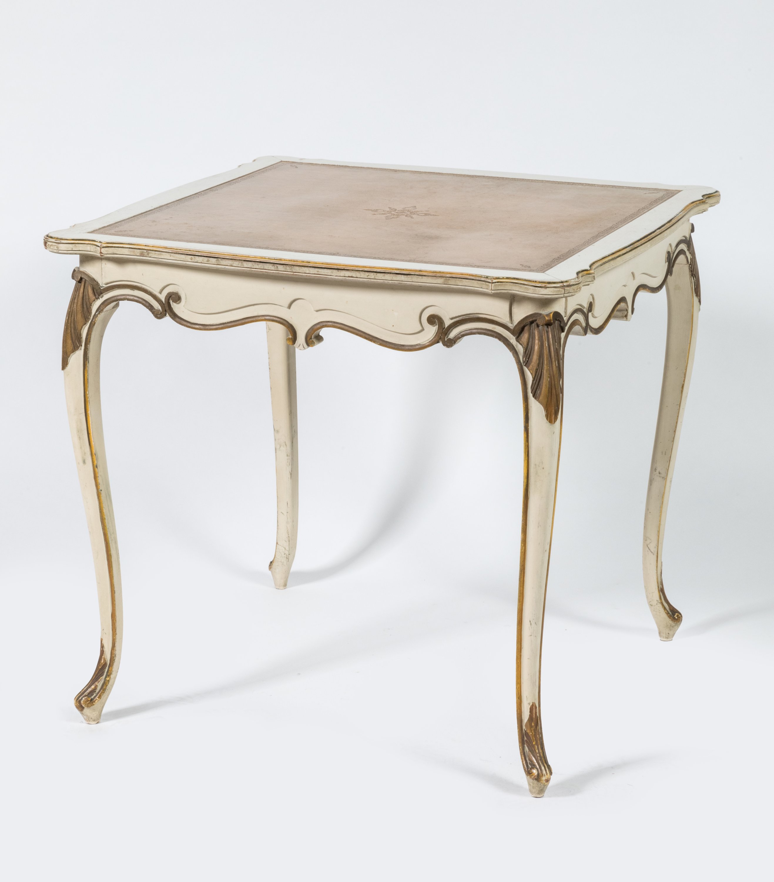 La table de forme carrée aux angles arrondis présente un plateau gainé d'un cuir beige décoré aux petits fers. La ceinture chantournée reposant sur quatre pieds cambrés terminés en enroulements est surmontée d'une feuille.