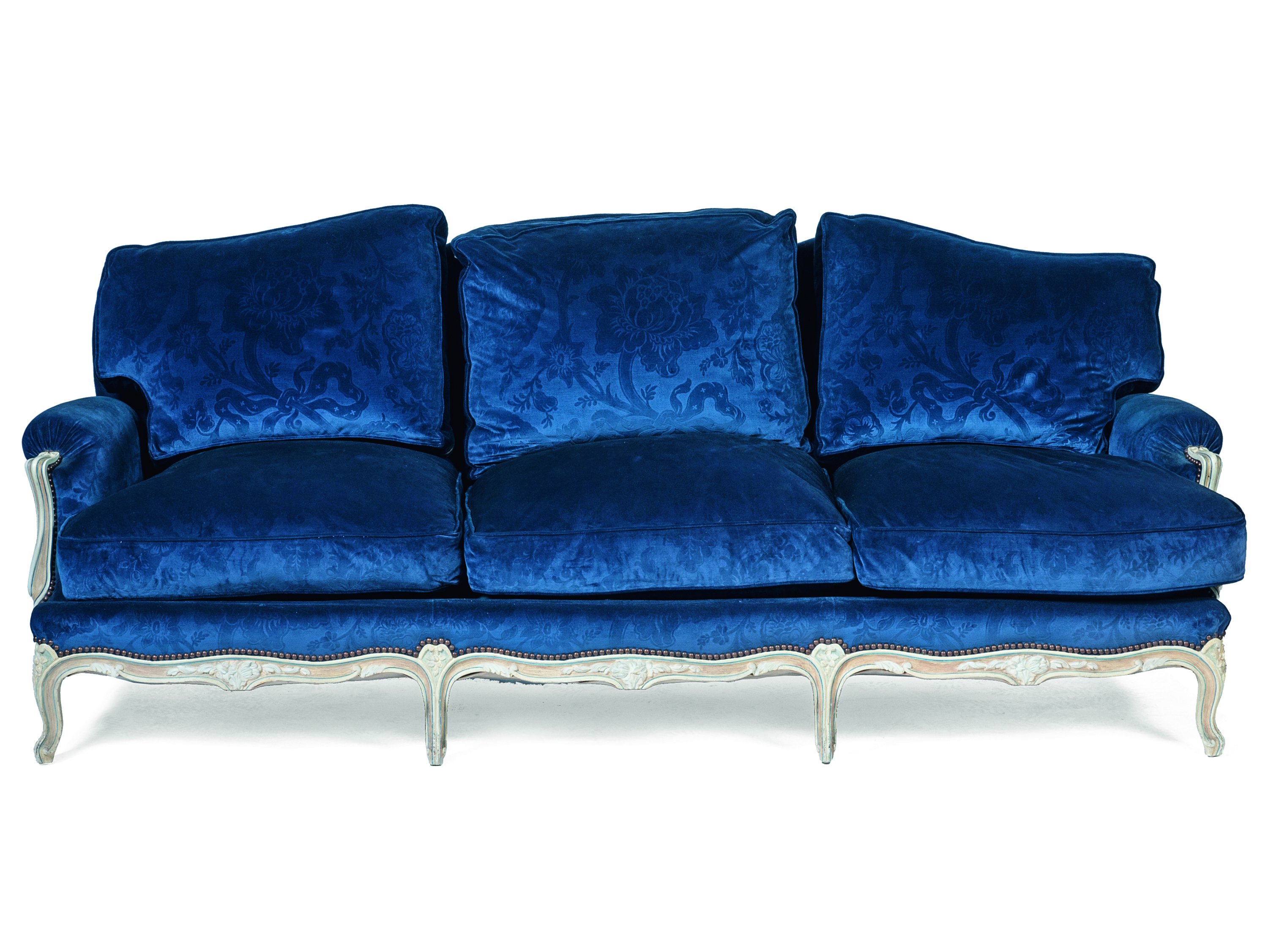 en bois mouluré, sculpté et laqué crème et bleu. Les accotoirs de forme mouvementée reposent sur une ceinture chantournée à décor de motifs floraux. Huit pieds cambrés.