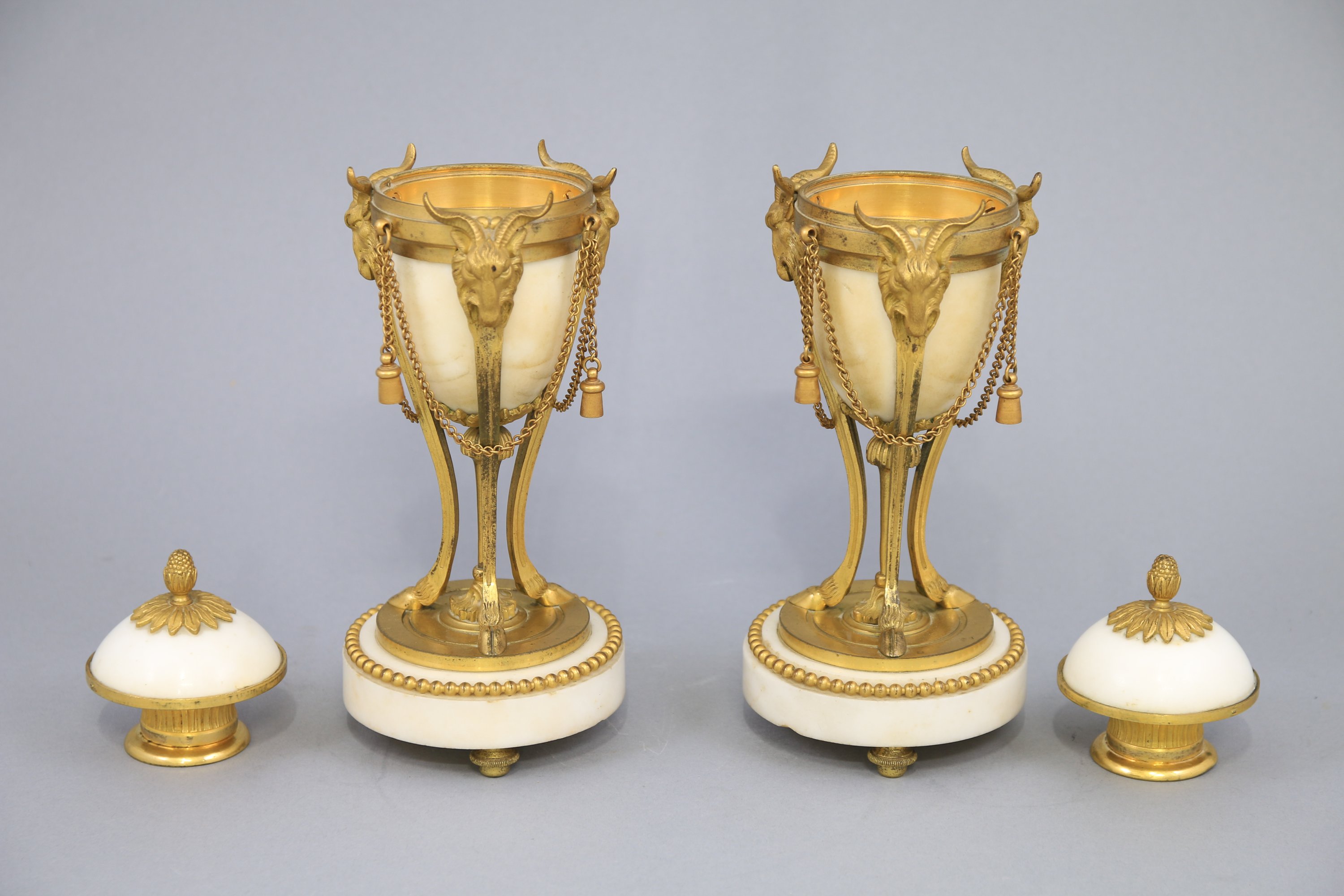 en marbre blanc, de forme ovoïde sur un piétement tripode en bronze doré et ciselé. La partie supérieure en dôme présente un fretel en forme de grenade sur une terrasse de feuilles se renversant pour former bougeoirs. Le piétement tripode en Athénienne à décor de têtes de bélier se terminant par des sabots. Un fût central fuselé terminé par une terrasse végétale. La base circulaire moulurée est soulignée par une frise de perles et soutenue par trois pieds à patins.