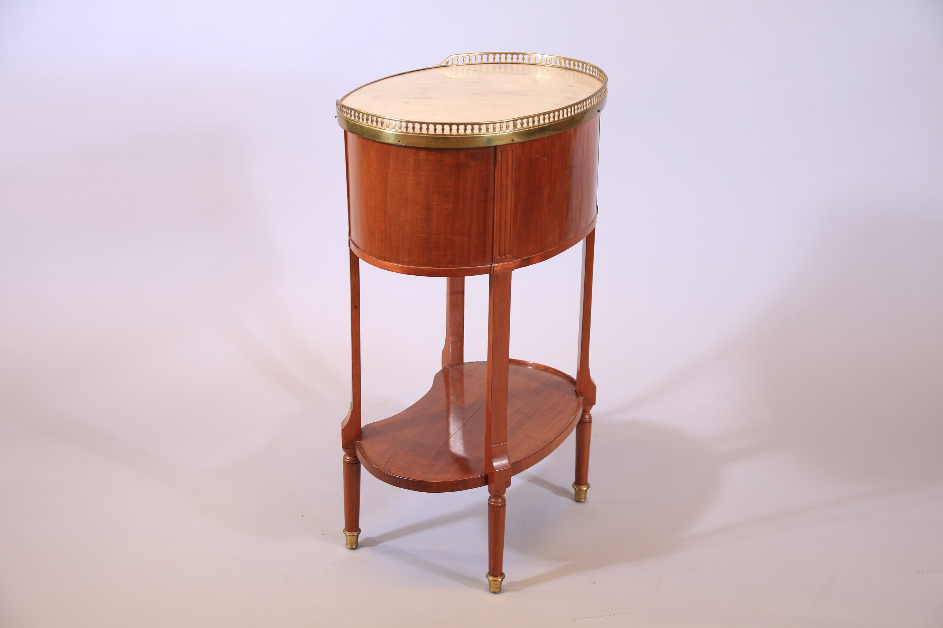 en acajou et placage d'acajou, surmontée d'un plateau de marbre blanc cerclé d'une galerie de laiton ajouré, elle ouvre par un rideau en façade dévoilant un second plateau de marbre blanc. Elle repose sur quatre pieds droits terminés en gaine et sabotés de laiton, réunis par une tablette d'entretoise.