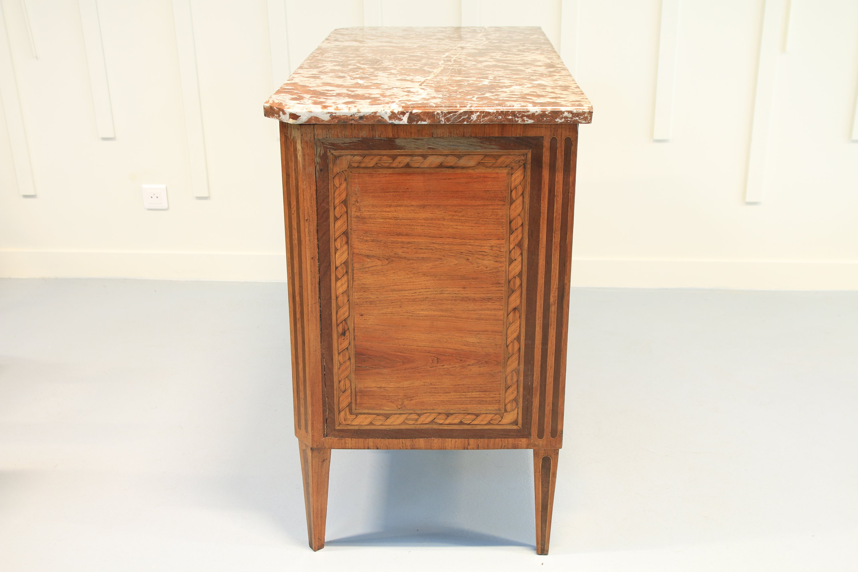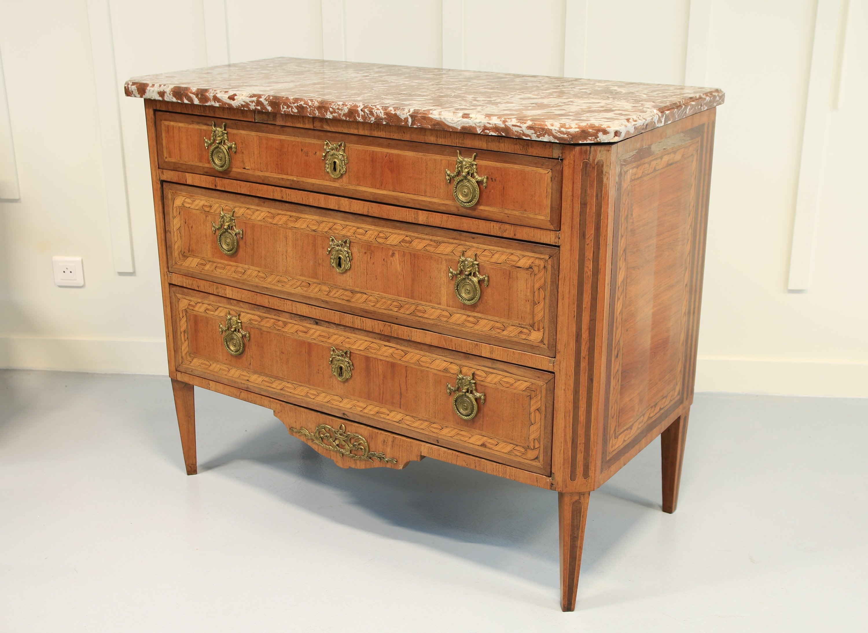 en placage de bois de rose et palissandre de forme rectangulaire, ouvrant par trois tiroirs sur trois rangs. Le tiroir supérieur est décoré de filets de bois clair, les deux autres d'enroulements entre deux rangs de filets. Les montants à pans coupés sont ornés de cannelures simulées et le tablier offre un cul de lampe en son centre. Elle repose sur quatre pieds en gaine à cannelure simulée.