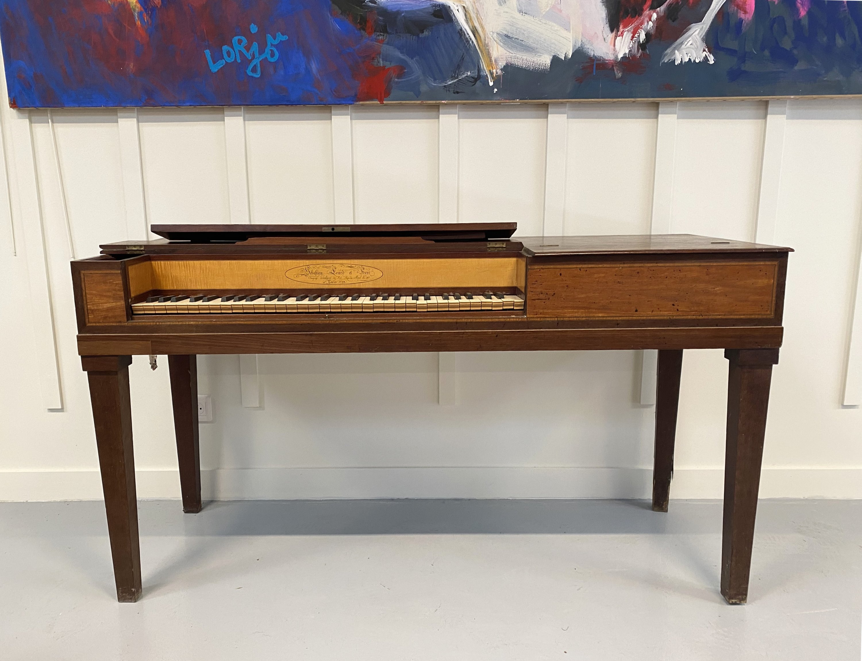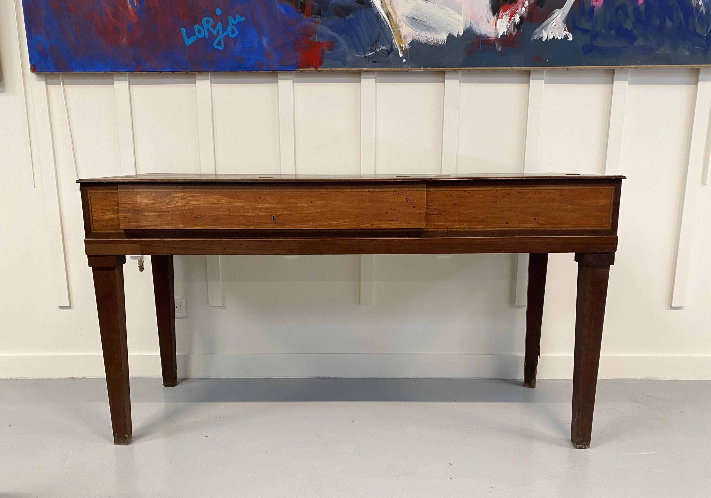 en acajou, placage d'acajou et bois de rose de forme rectangulaire à un abattant découvrant le clavier. Au dessus, l'inscription "Sébastien Erard et Frères / Compag. Privilégiée du Roi Rue du Mail n°37 / à Paris 1789". Il repose sur quatre pieds gaines.