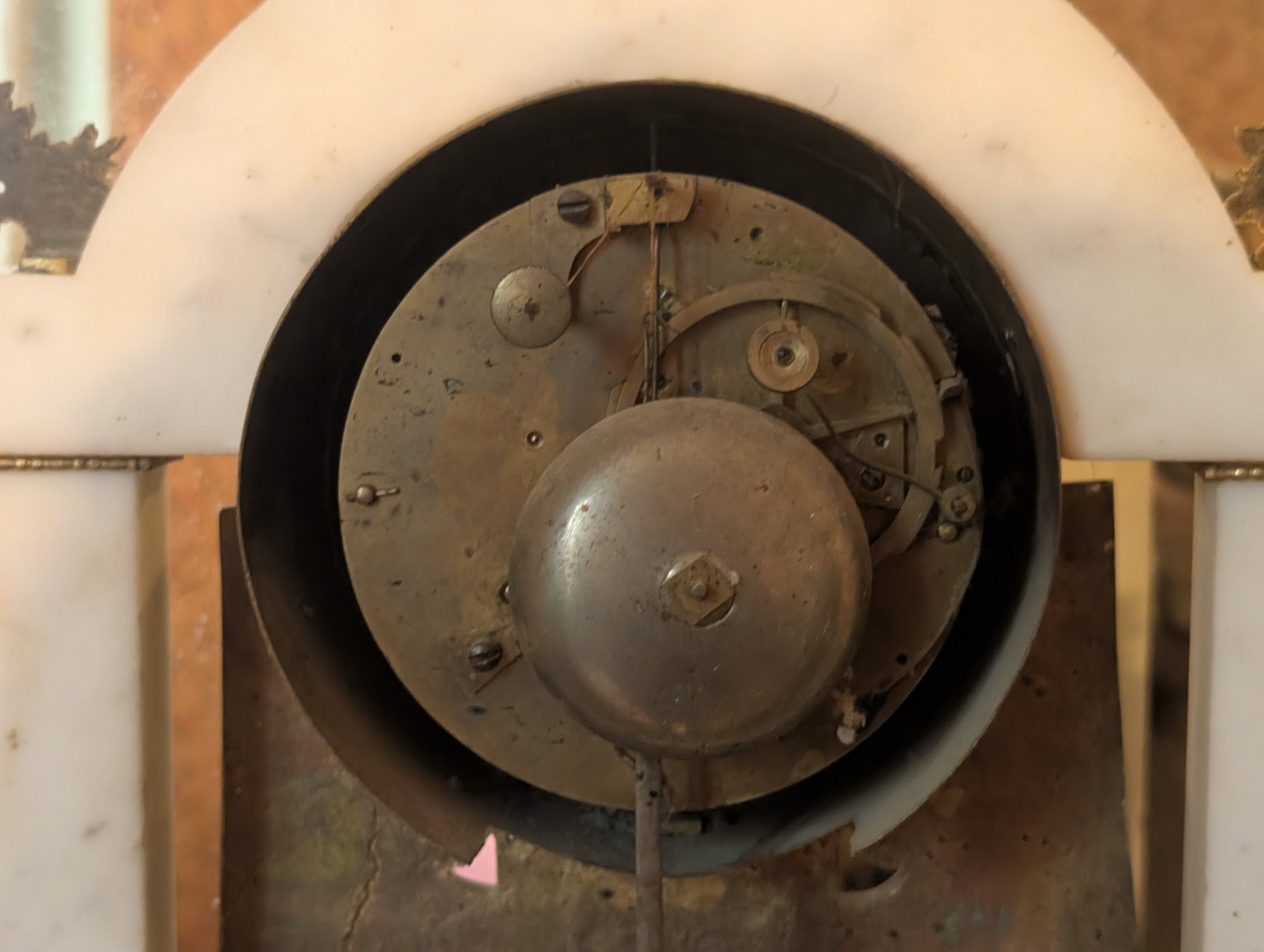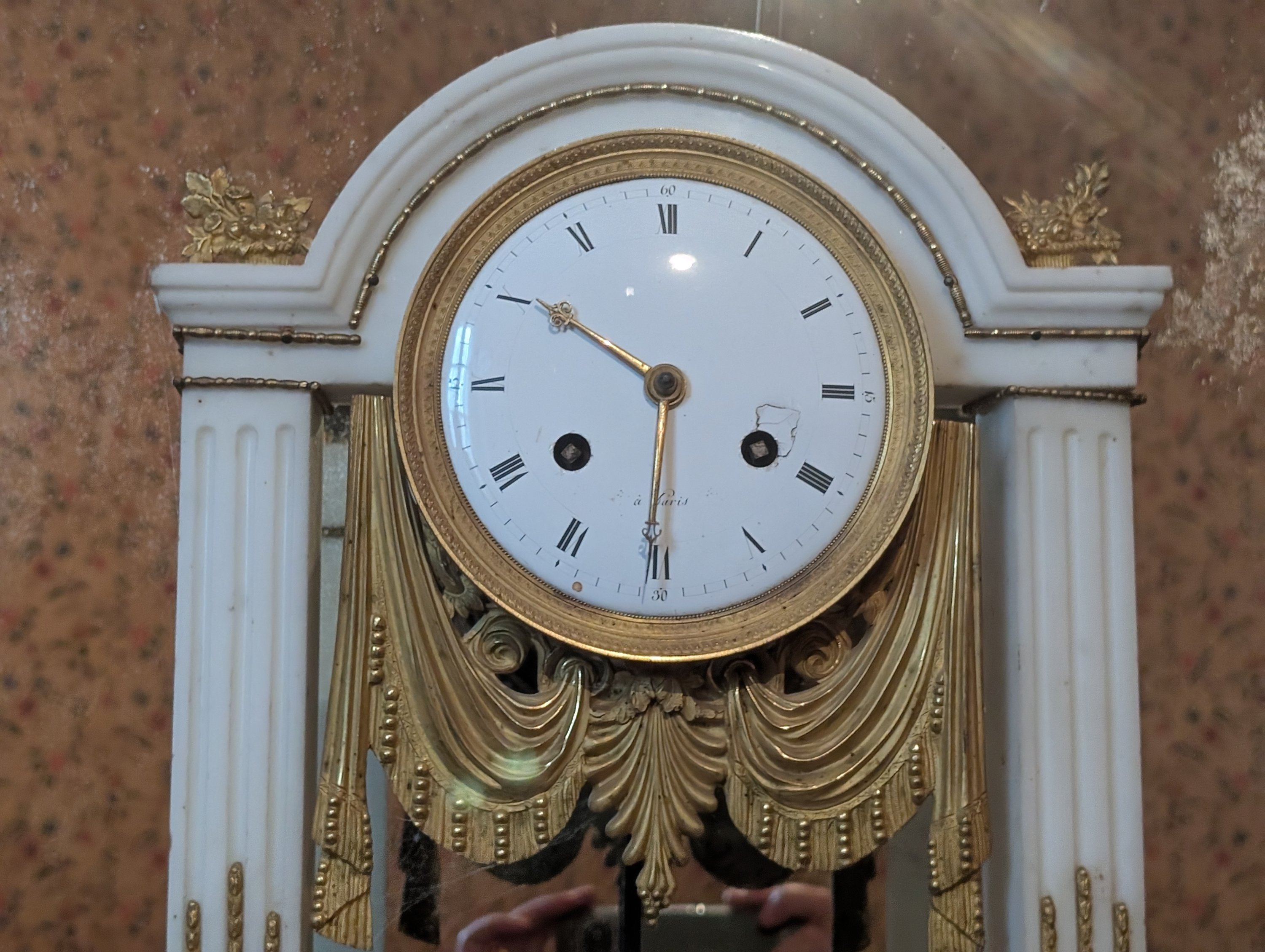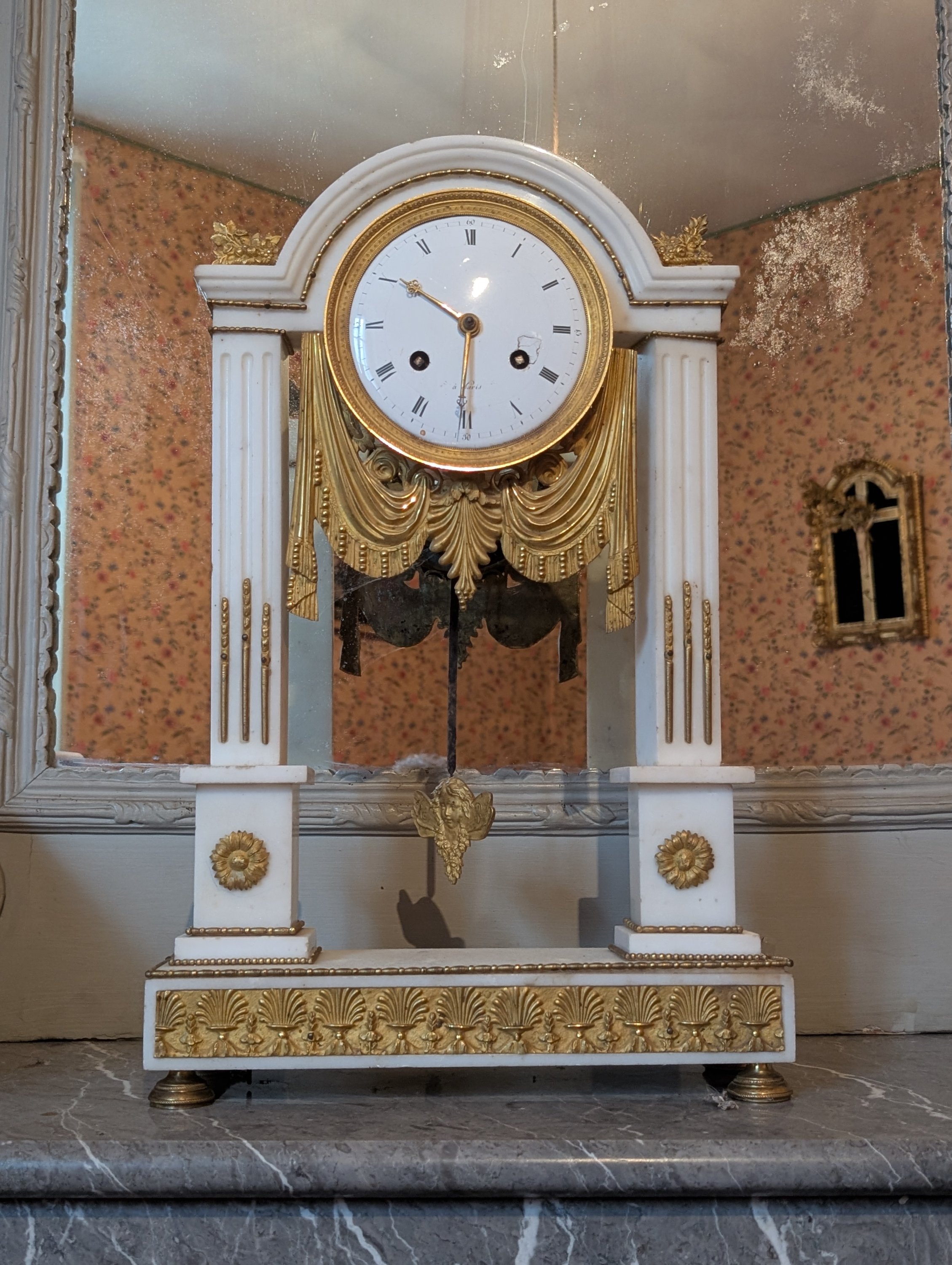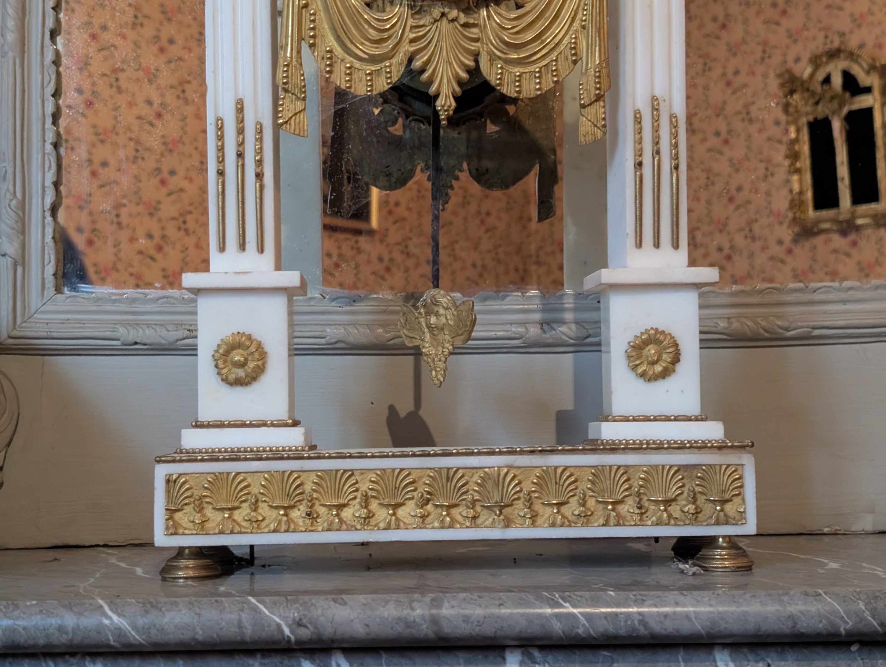 en marbre blanc et bronzes ciselés et dorés. En forme de temple, elle repose sur une base rectangulaire ornée d'une frise à palmettes. Décor de bouquets, asperges, tournesols et d'un drapé.