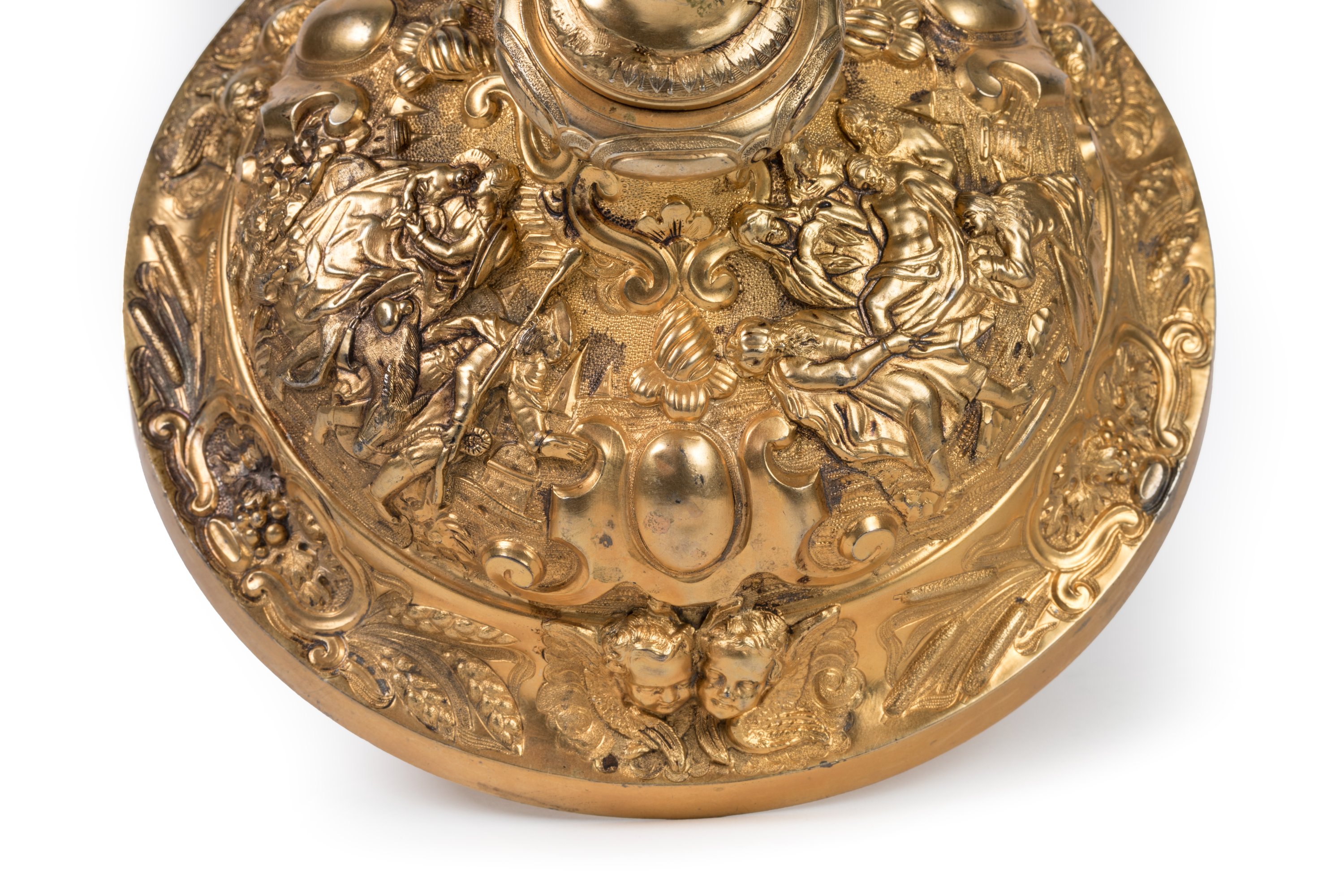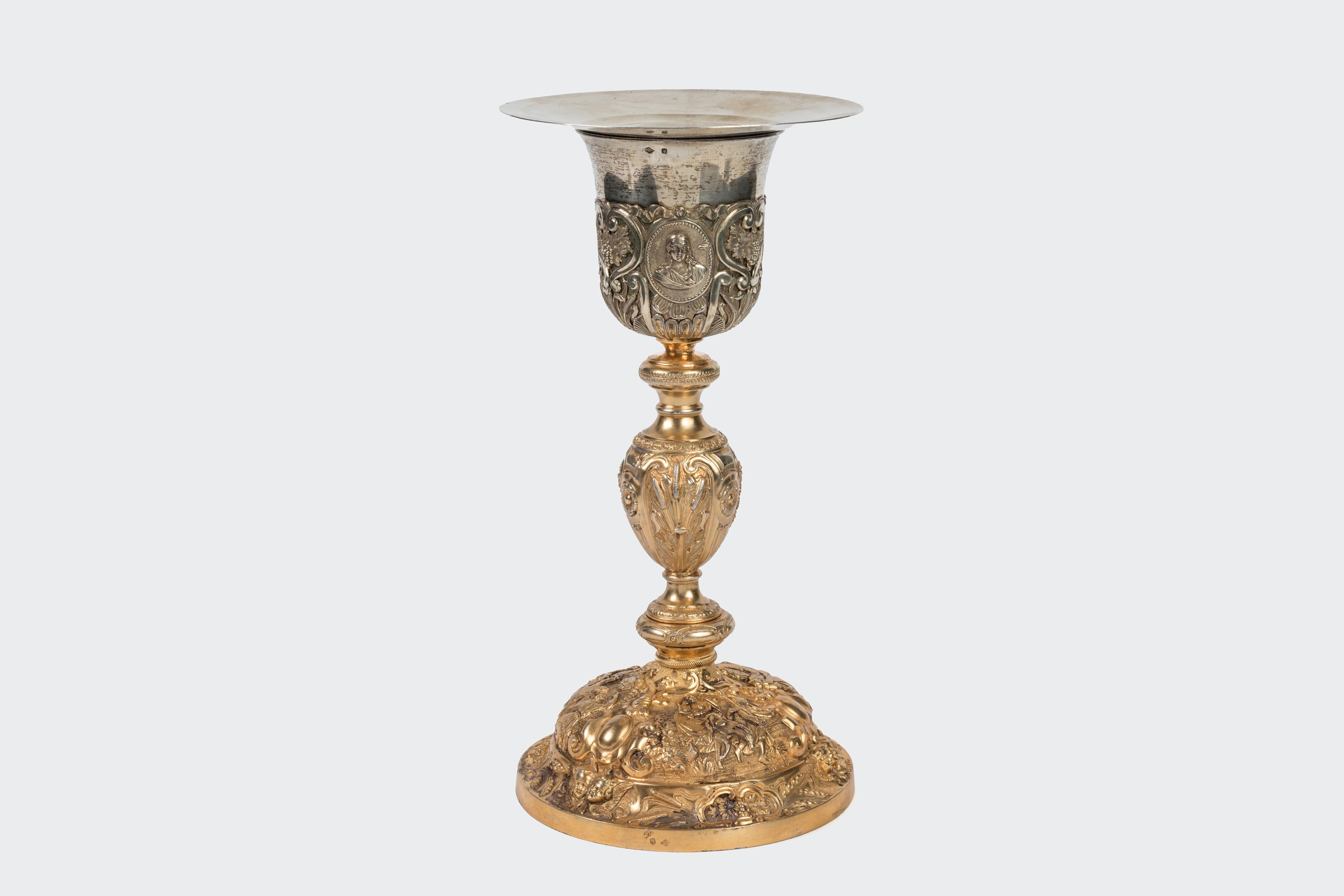 en vermeil. Le calice à lèvre évasée, à décor sur la fausse coupe de trois médaillons figurant le Christ, la Vierge Marie et saint Jean dans un entourage de rinceaux et pampres de vigne. Le fût balustre est orné de roseaux, épis de blé et pampres en alternance de rosettes. Le pied circulaire décoré de la Fuite en Egypte, la Déploration et l'Ascension, se termine par une doucine soulignée de têtes de putti, cartouches et motifs végétaux. La patène gravée au revers d'une couronne d'épines entourant le monogramme du Christ "IHS".
