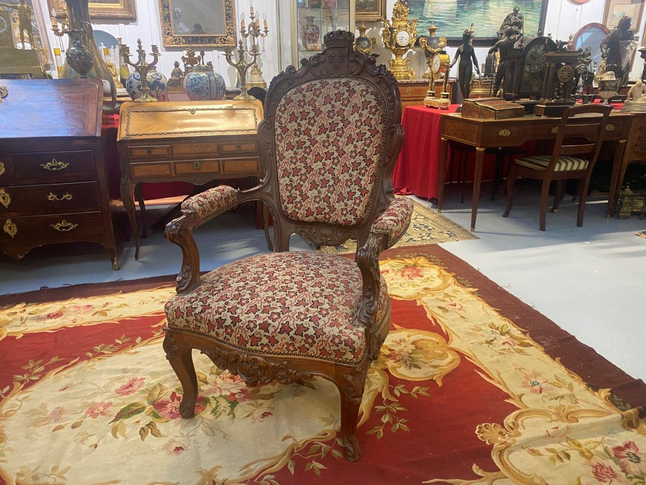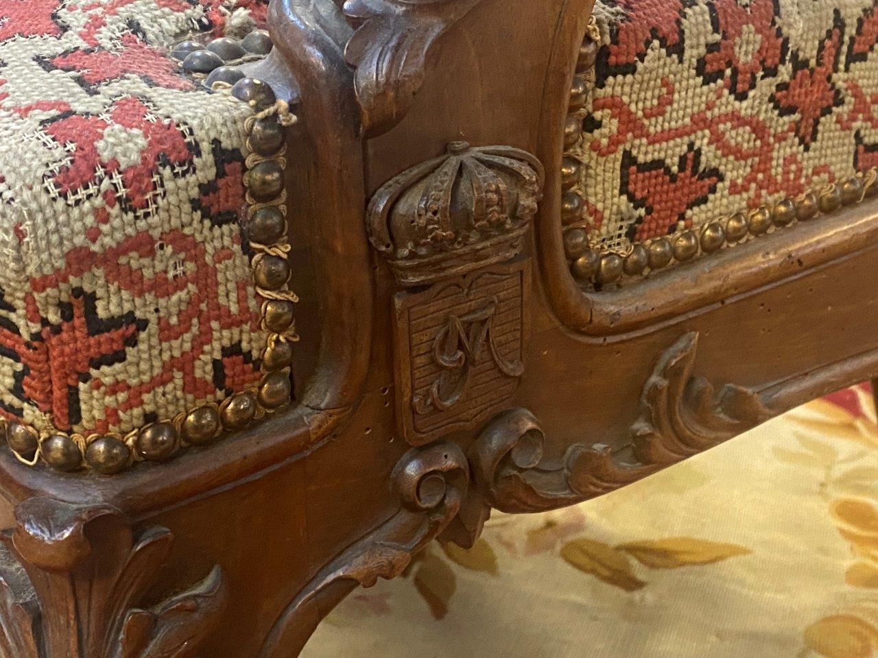 en bois sculpté. Le dossier en cabriolet, accotoirs à manchettes, aux chiffres de Marie Thérèse de France d'une part et du Marquis de Vilette d'autre part.