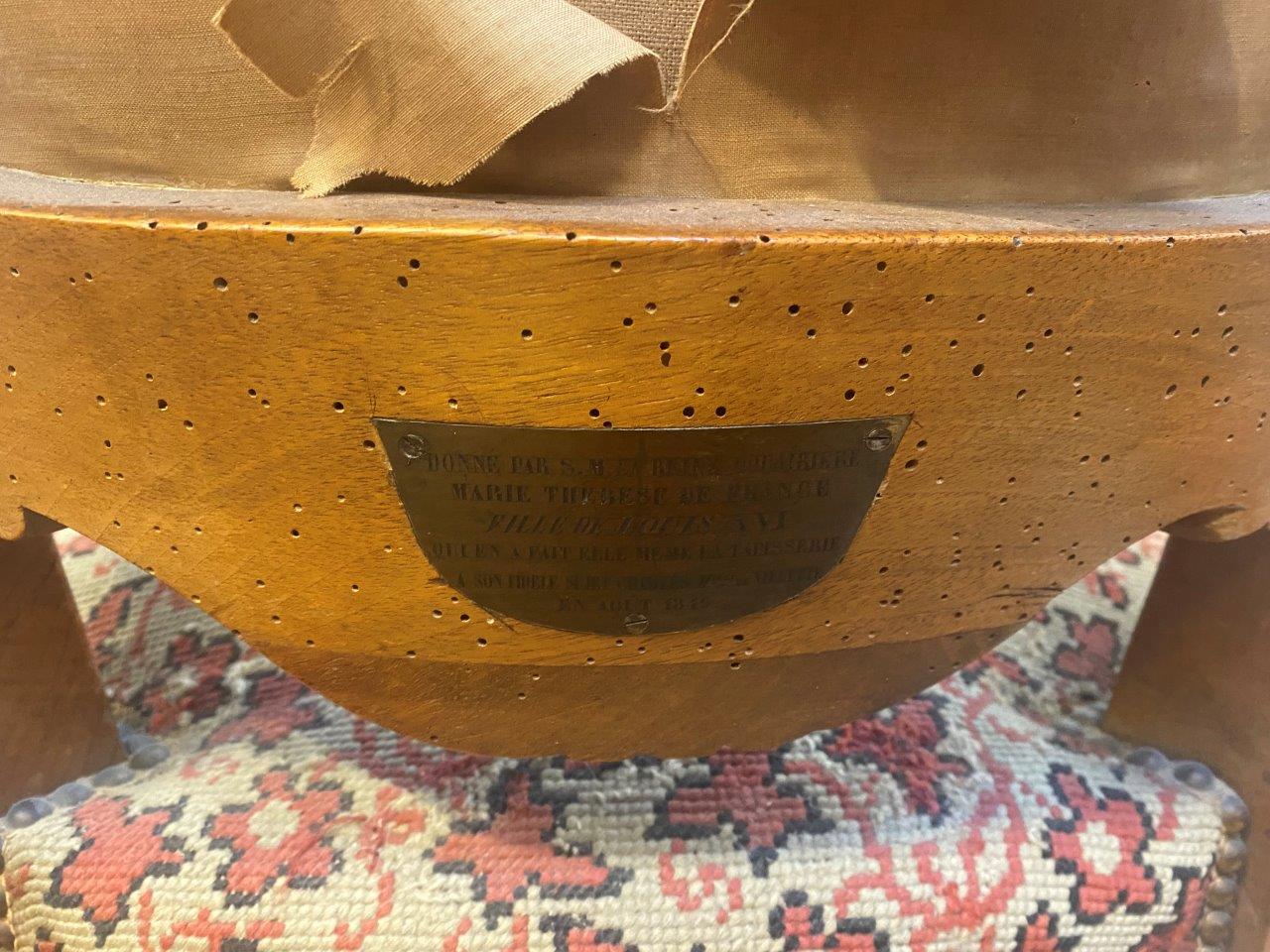 Plaque en cuivre gravée: « Donné par S. M. La Reine douairière / Marie-Thérèse de France / Fille de Louis XVI / qui en a fait elle-même la tapisserie / à son fidèle sujet Charles M(arqu)is de Villette / en août 1849 ».