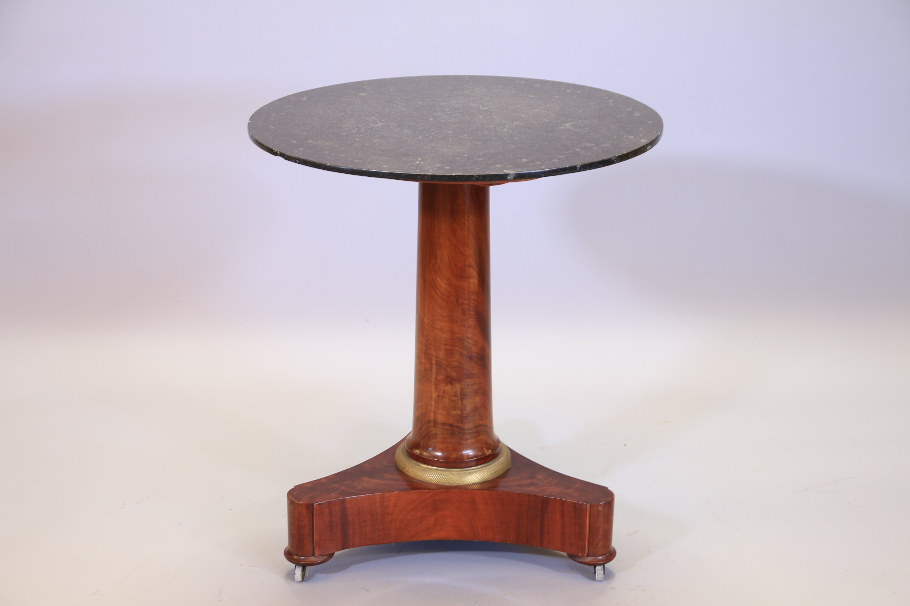 en placage d'acajou, à fût terminé par une bague en bronze sur un piétement tripode à roulettes.