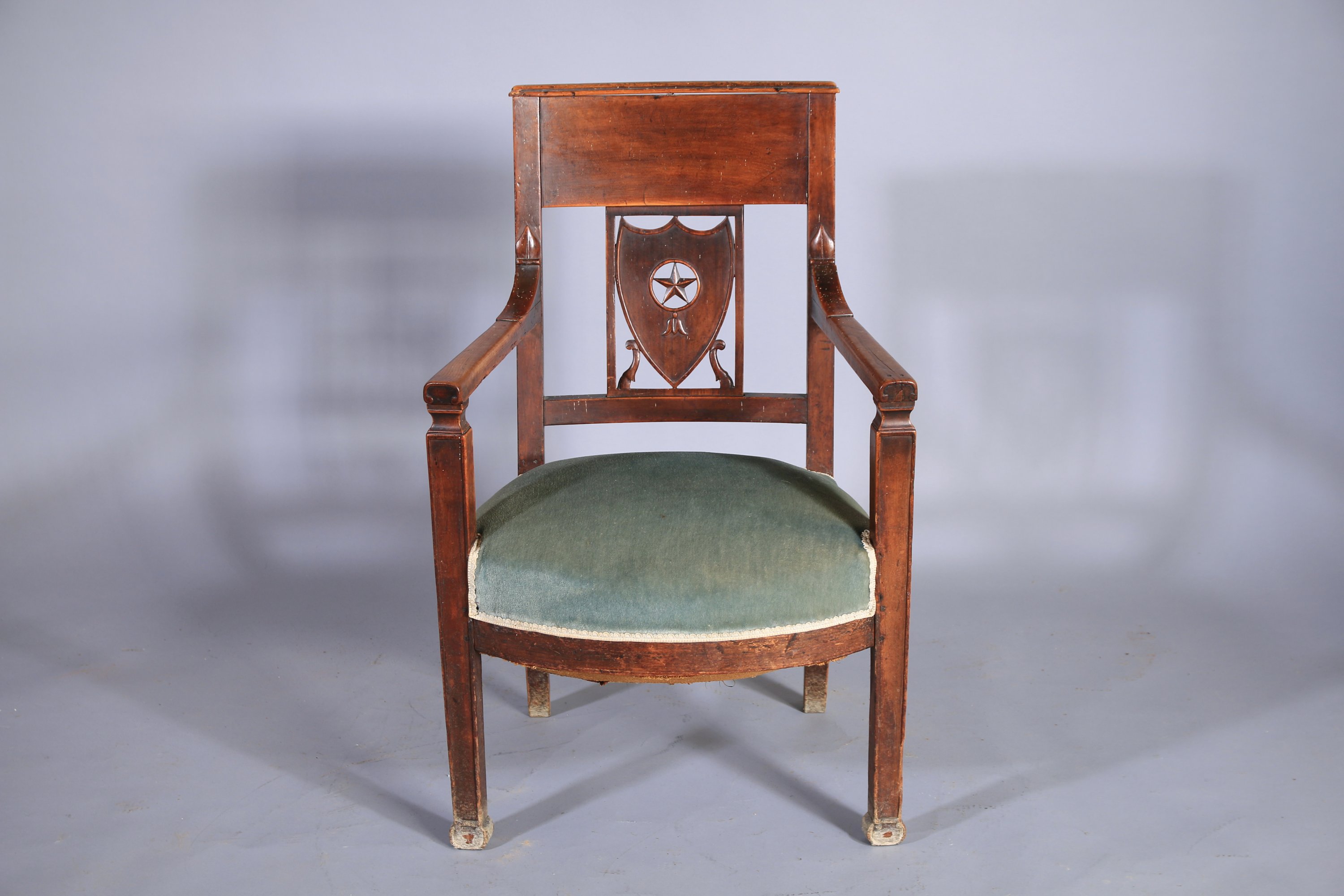 en acajou et placage d'acajou. Dossier légèrement cambré à décor ajouré d'un écu centré d'une étoile, feuilles d'eau à la naissance des accotoirs, ceinture cambrée. Il repose sur quatre pieds, les antérieurs en légère gaine, les postérieurs en sabre.