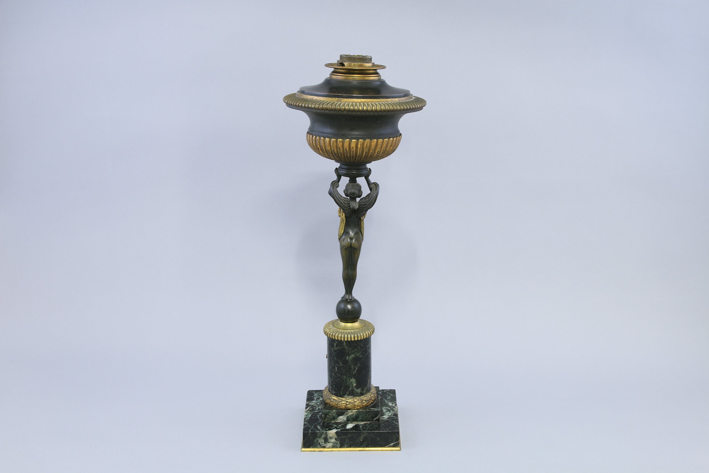 en bronze et marbre, à décor d'une femme ailée reposant sur une sphère. La base carrée.
