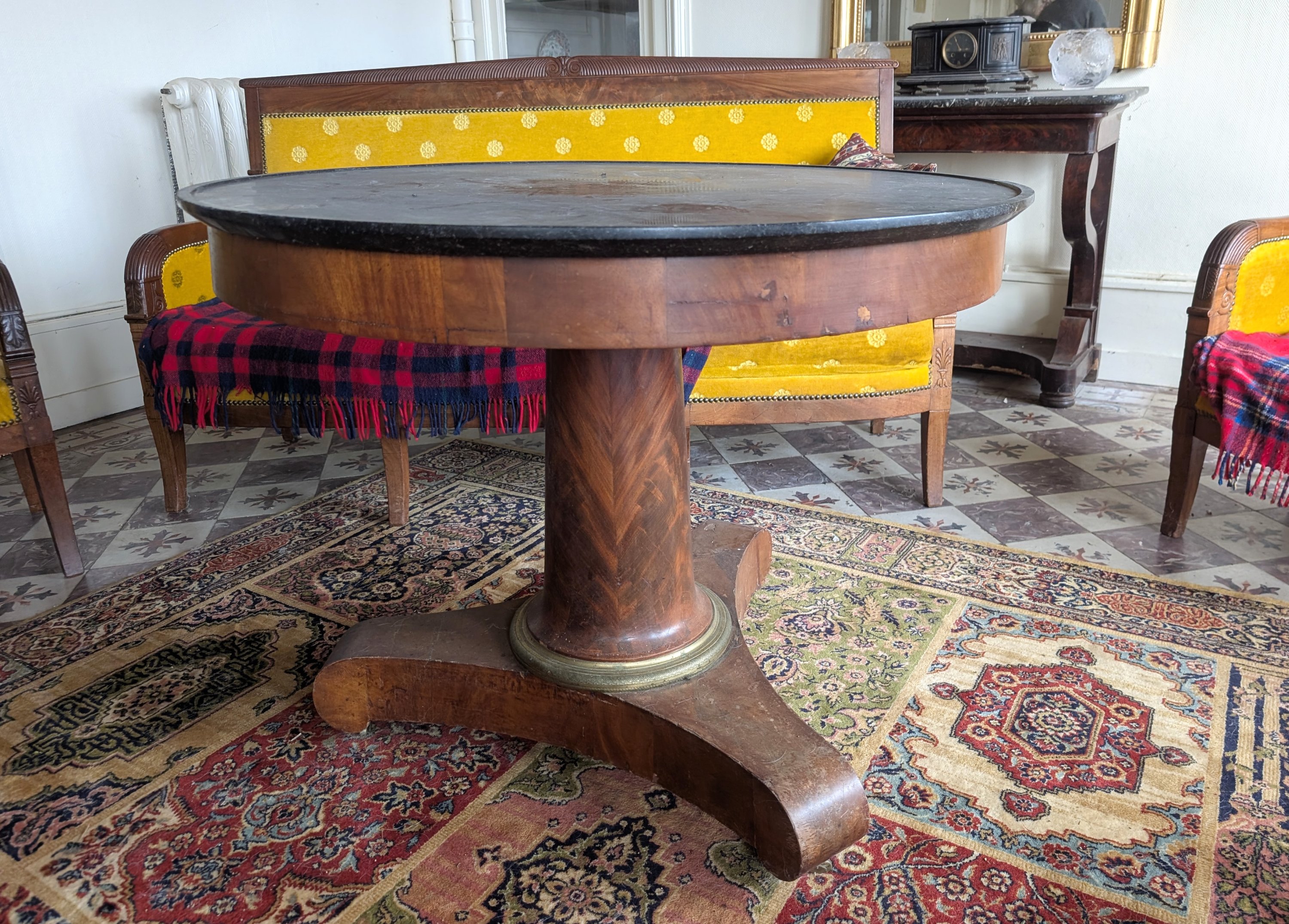 en acajou et placage d’acajou, ceinture à bandeau soutenue par une colonne à bague de bronze et reposant sur une base triangulaire aux côtés incurvés.