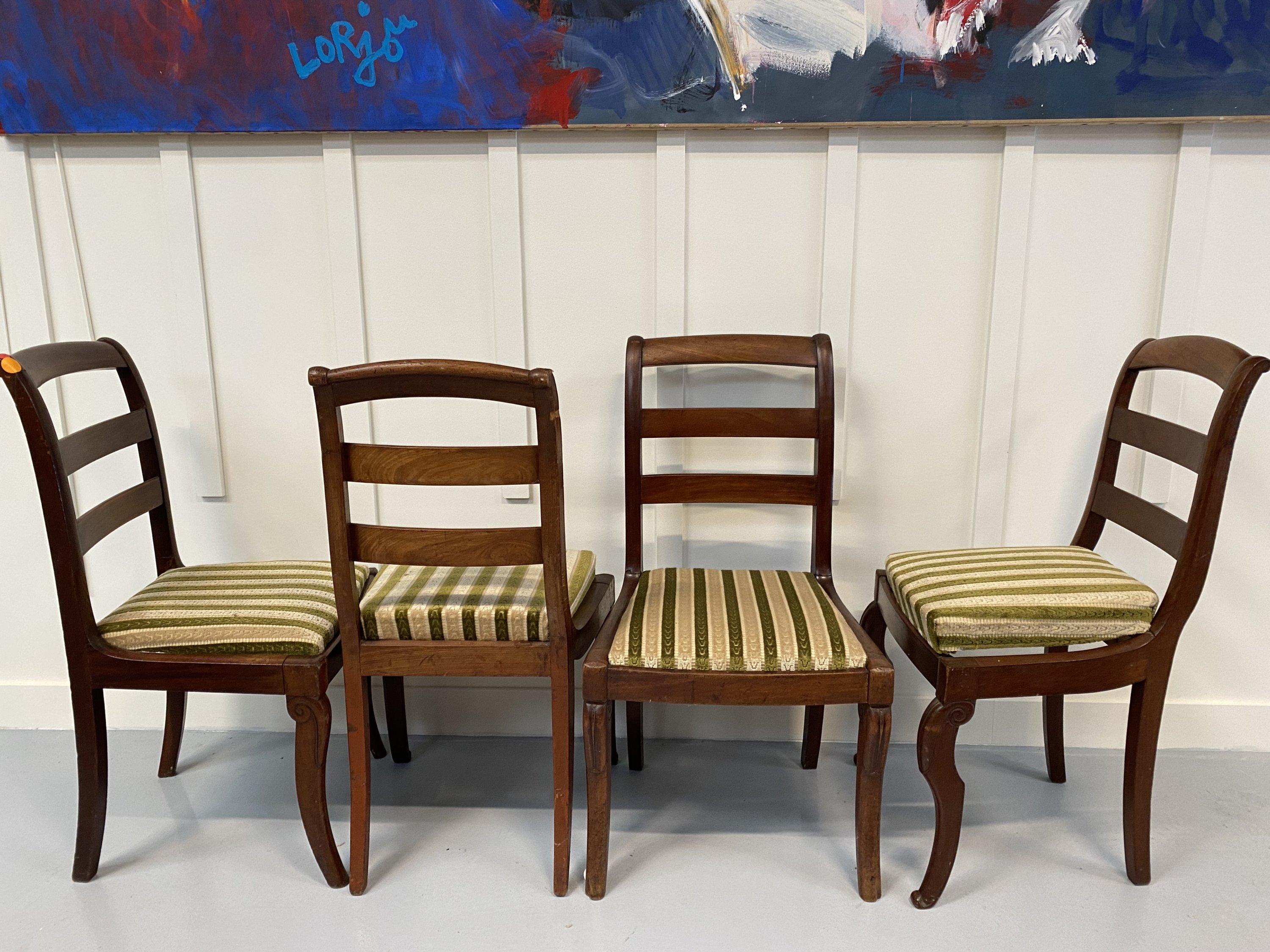 en noyer mouluré et sculpté, à dossier à barreaux renversé reposant sur quatre pieds, les antérieurs jarrets et les postérieurs sabres. Assise à galette.