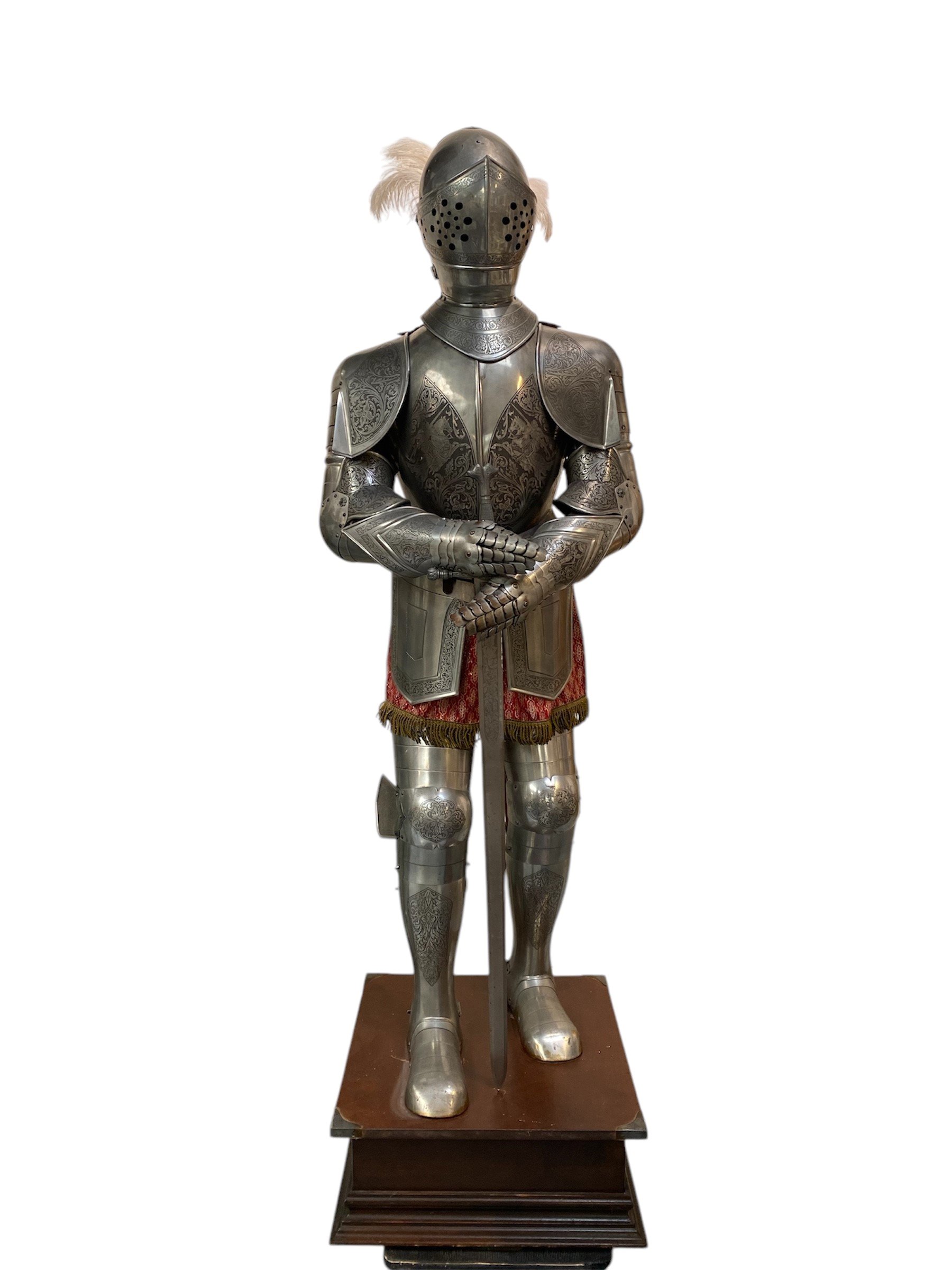 Blindage en acier poli, incisions de motifs floraux sur une grande partie de la surface.