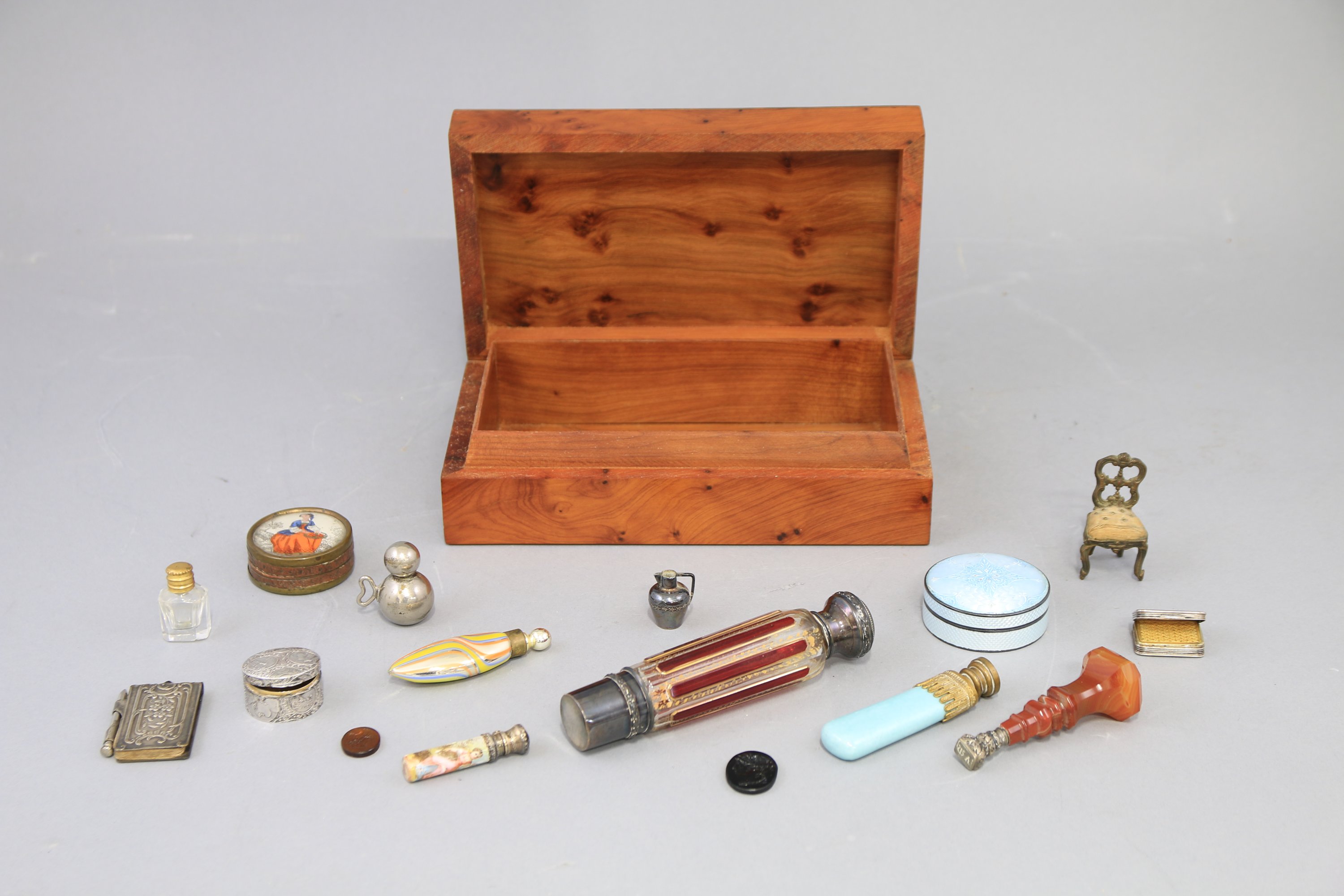 Objets de vitrine et de collection dans un coffre en marqueterie de thuya et bois clair