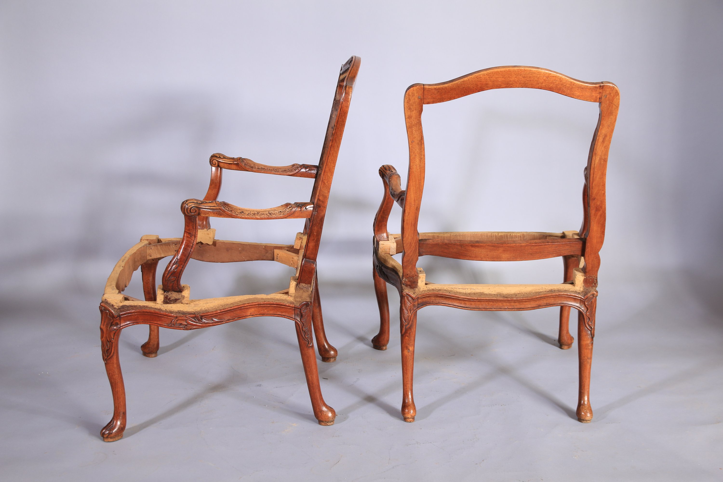 en bois naturel mouluré et sculpté, le dossier droit décoré de feuillage, les accotoirs dits à manchette reposant sur des supports mouvementés. Quatre pieds cambrés.