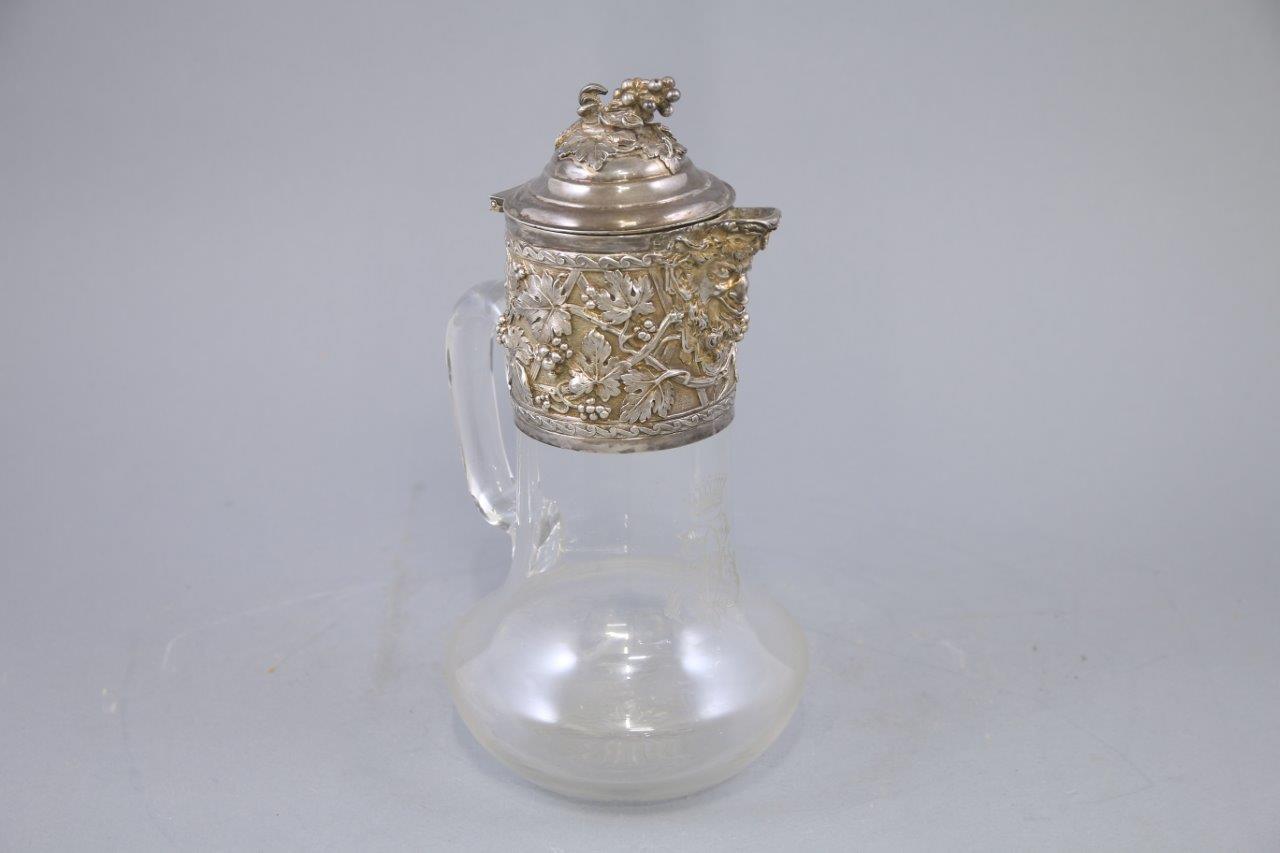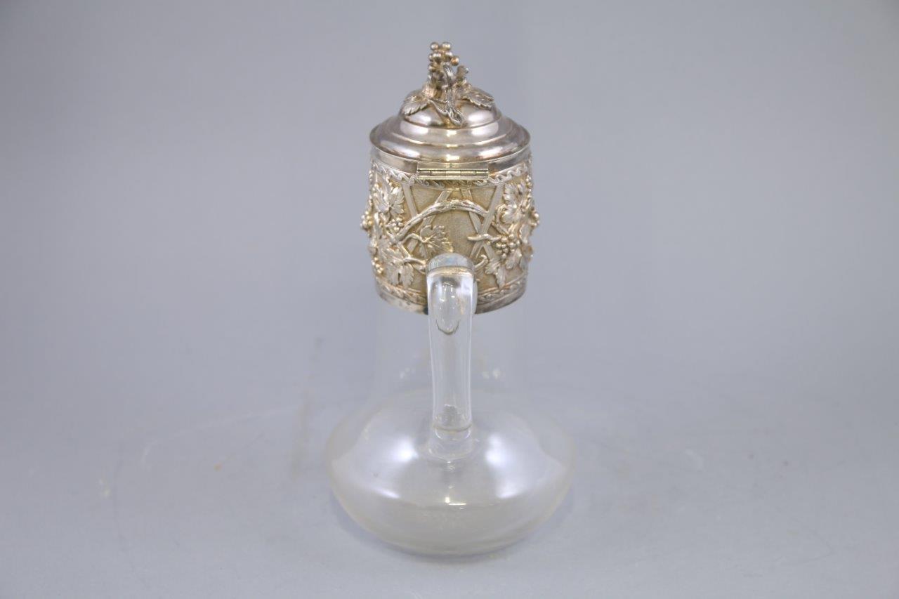 en cristal et argent ciselé d'une tête de Bacchus sur le bec verseur dans des pampres et feuillage. Le fretel en grappe de raisin, le corps du broc monogrammé LV sous une couronne comtale.