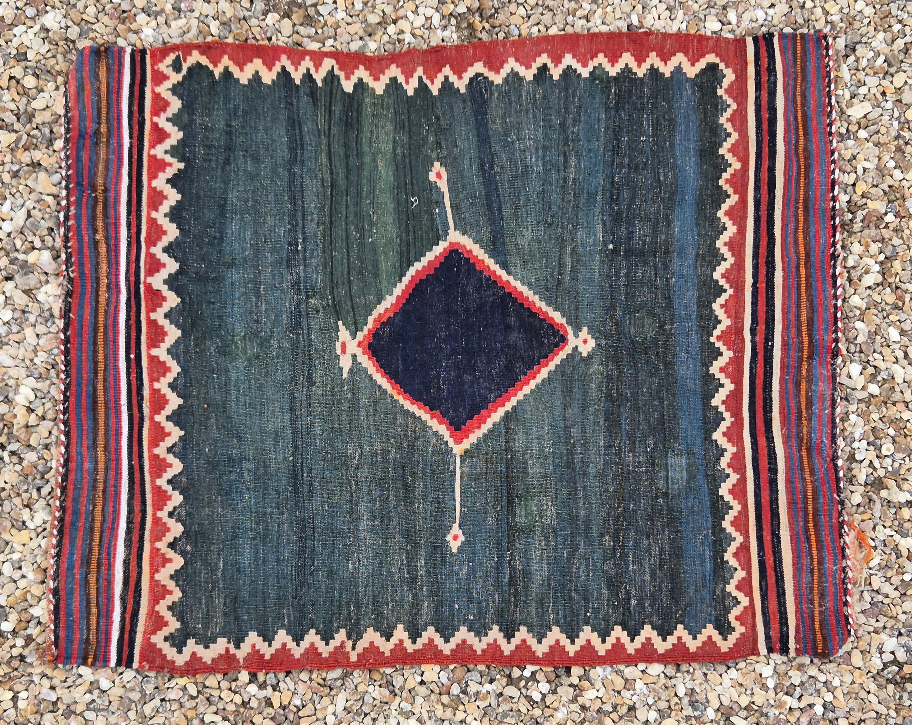 sur un fond vert abraché se détache un medaillon en forme de losange bleule tout encadré par une petite bordure crénelée ivoire et rouge