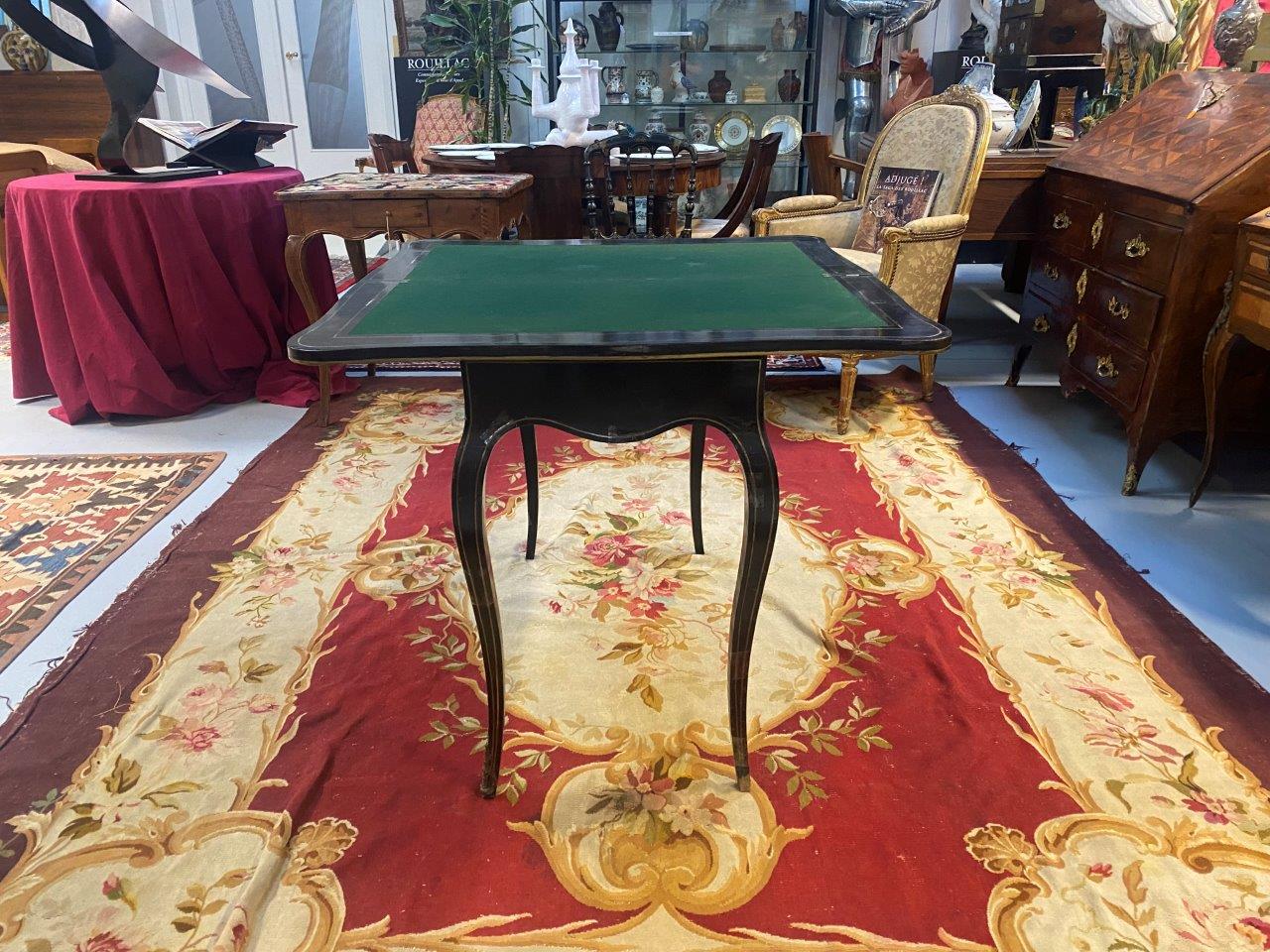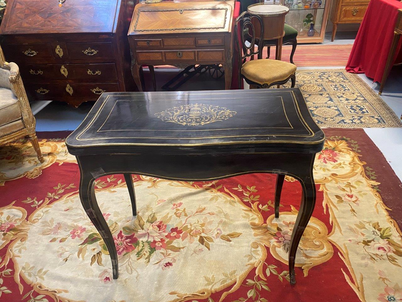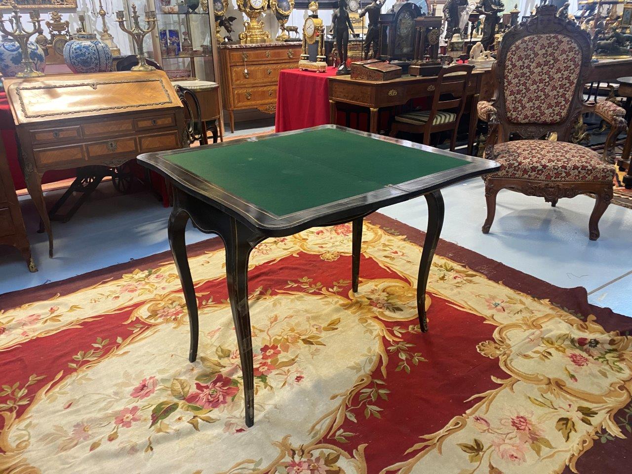 en bois noirci et inscrustation de laiton. Le plateau déployant est foncé d'un feutre vert. Elle repose sur quatre pieds galbés. Sabots de bronze.