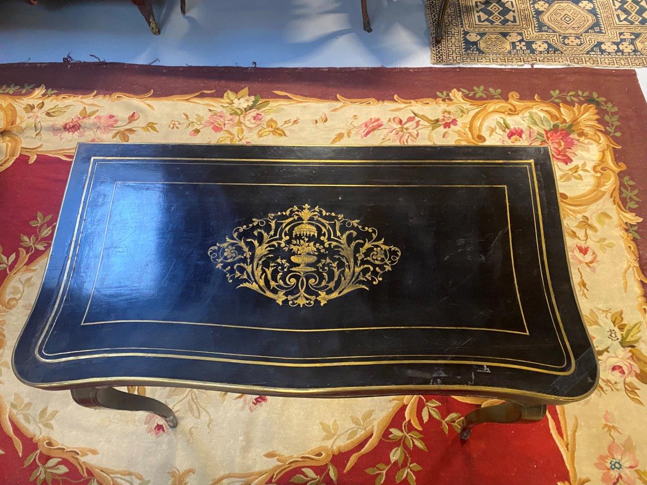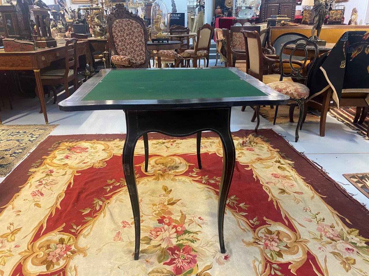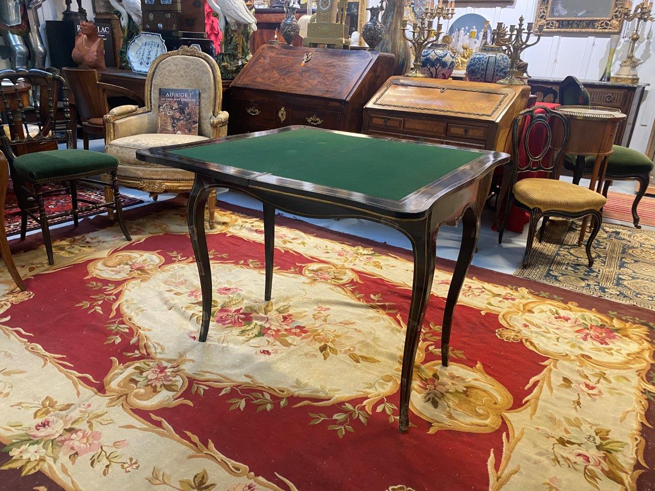 en bois noirci et inscrustation de laiton. Le plateau déployant est foncé d'un feutre vert. Elle repose sur quatre pieds galbés. Sabots de bronze.