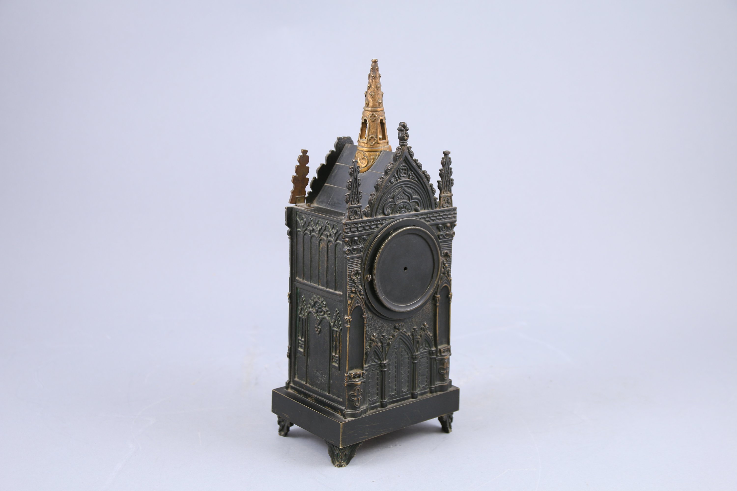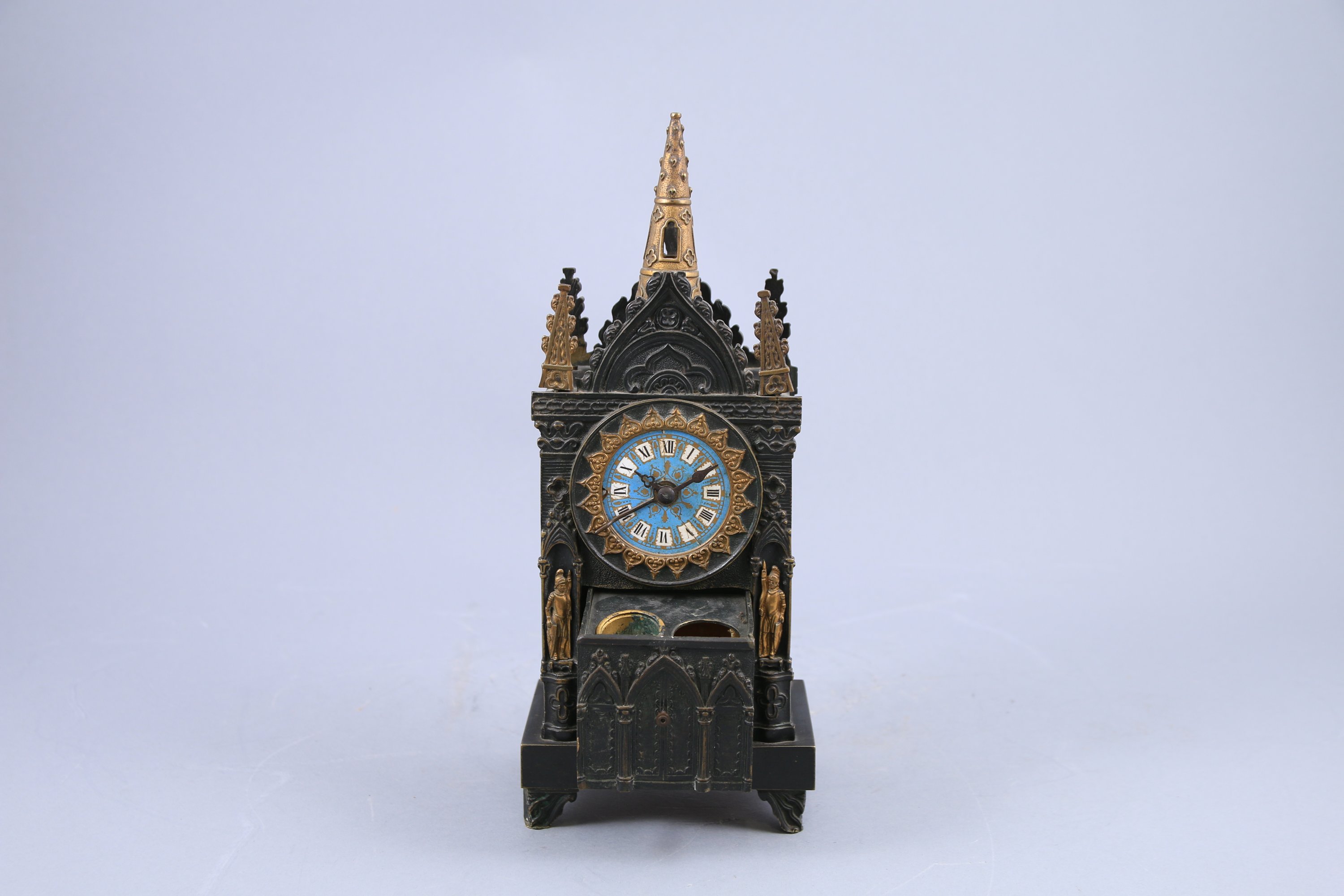 en bronze patiné et doré. De forme rectangulaire un portail à la cathédrale est orné d'une pendule-réveil au cadran émaillé turquoise avec les heures en chiffres romains. Flanqué de deux figures de chevalier armés le cadran surmonte un tiroir dans lequel figure l'emplacement de deux godets formant écritoire.
