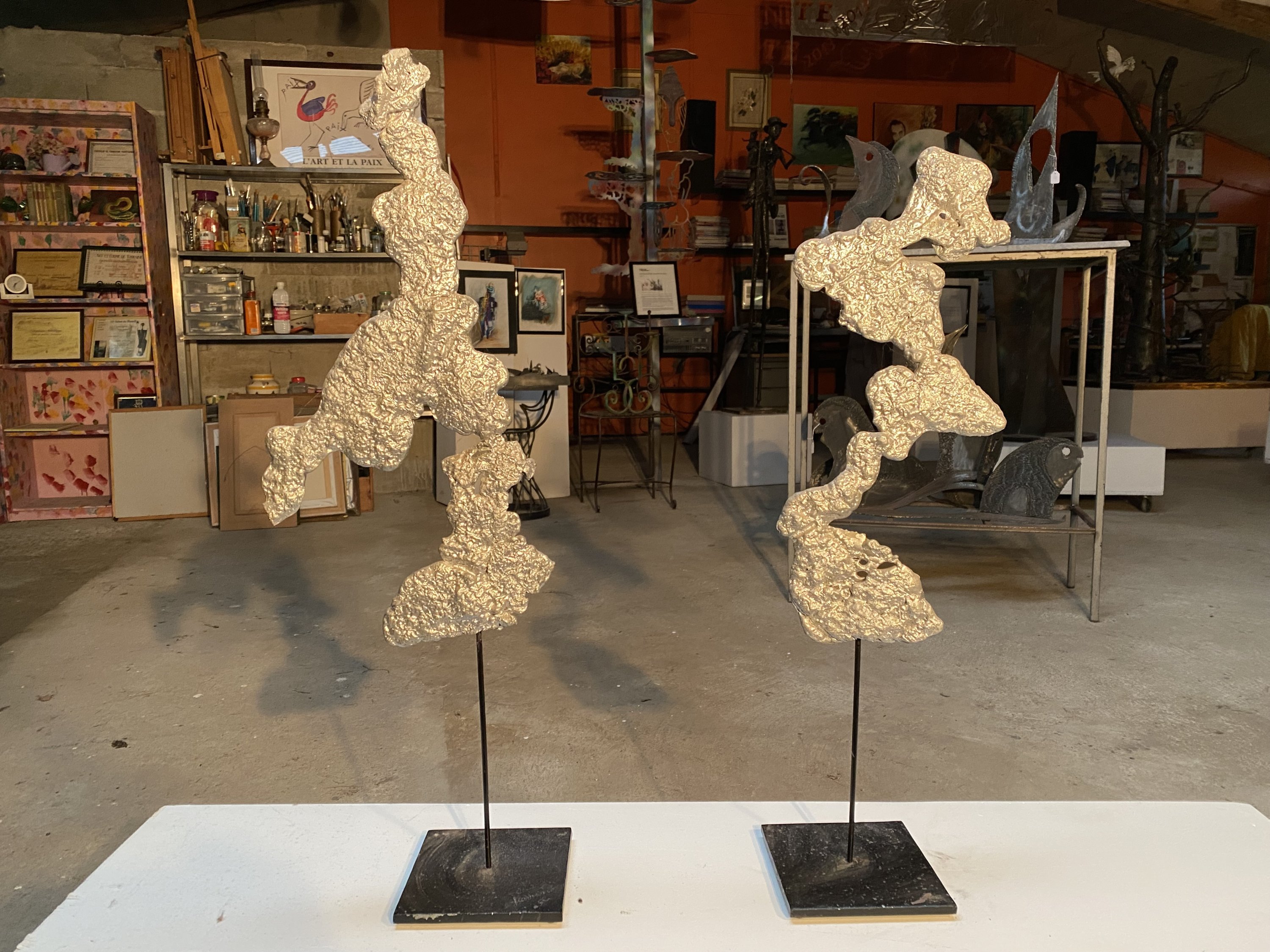Deux sculptures en aluminium. Le piétement en acier.