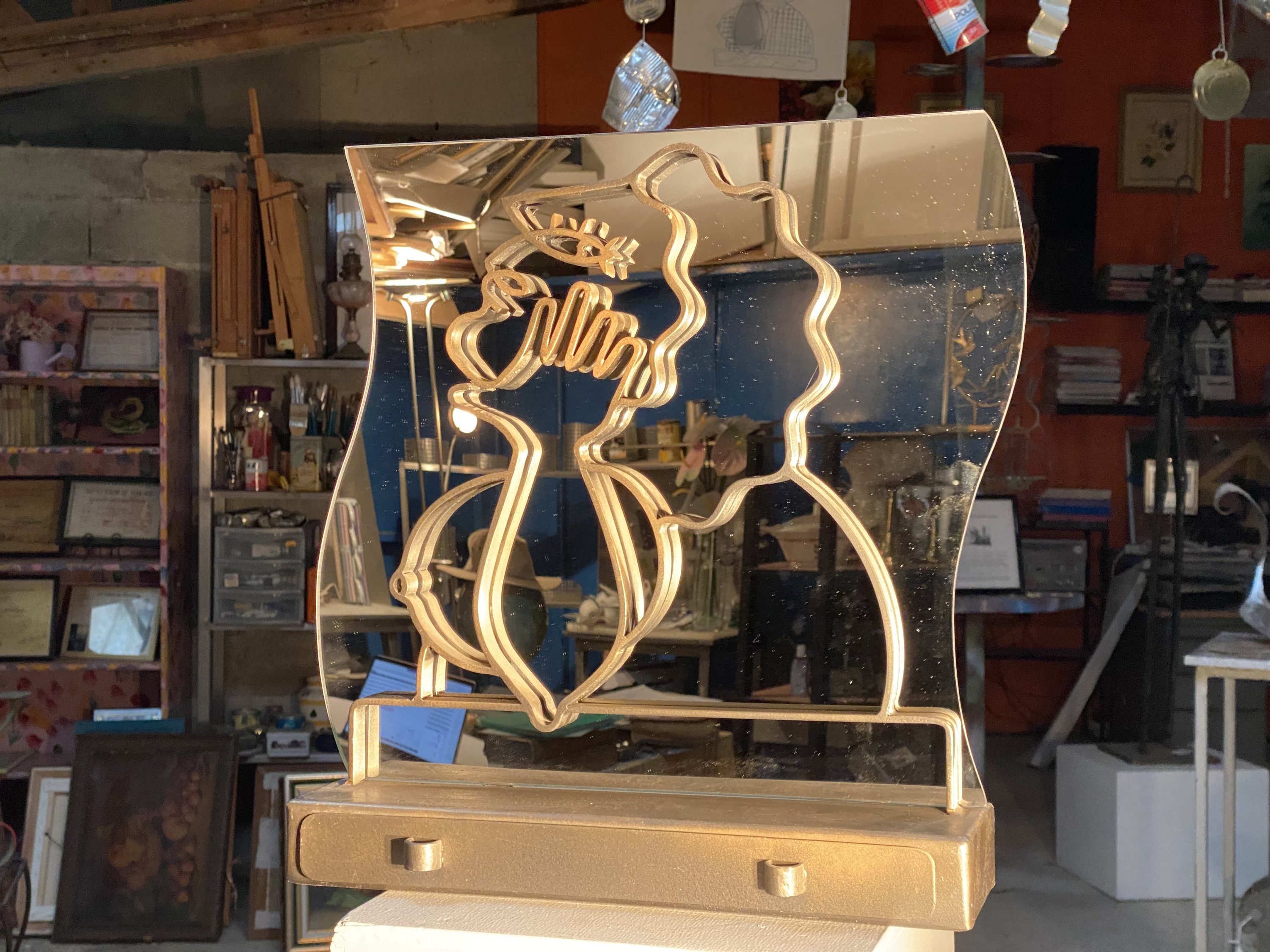 Acier et miroir. La partie inférieure ouvrant par un tiroir.
