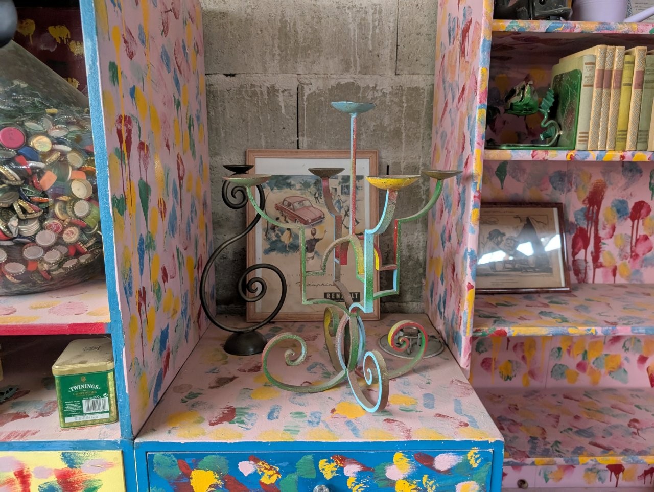en bois peint à casiers et tiroirs avec les sculptures et bibelots posés dessus.