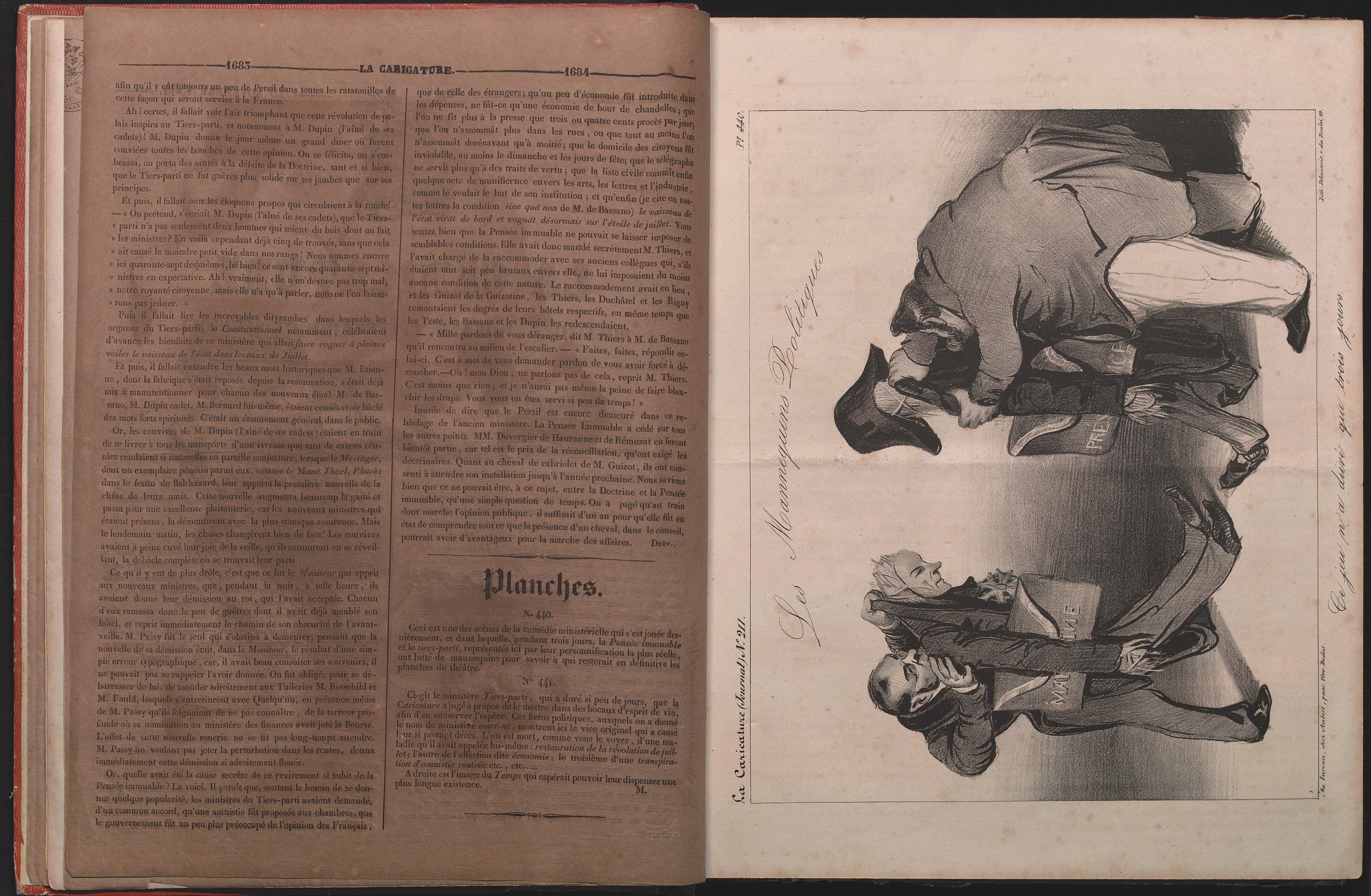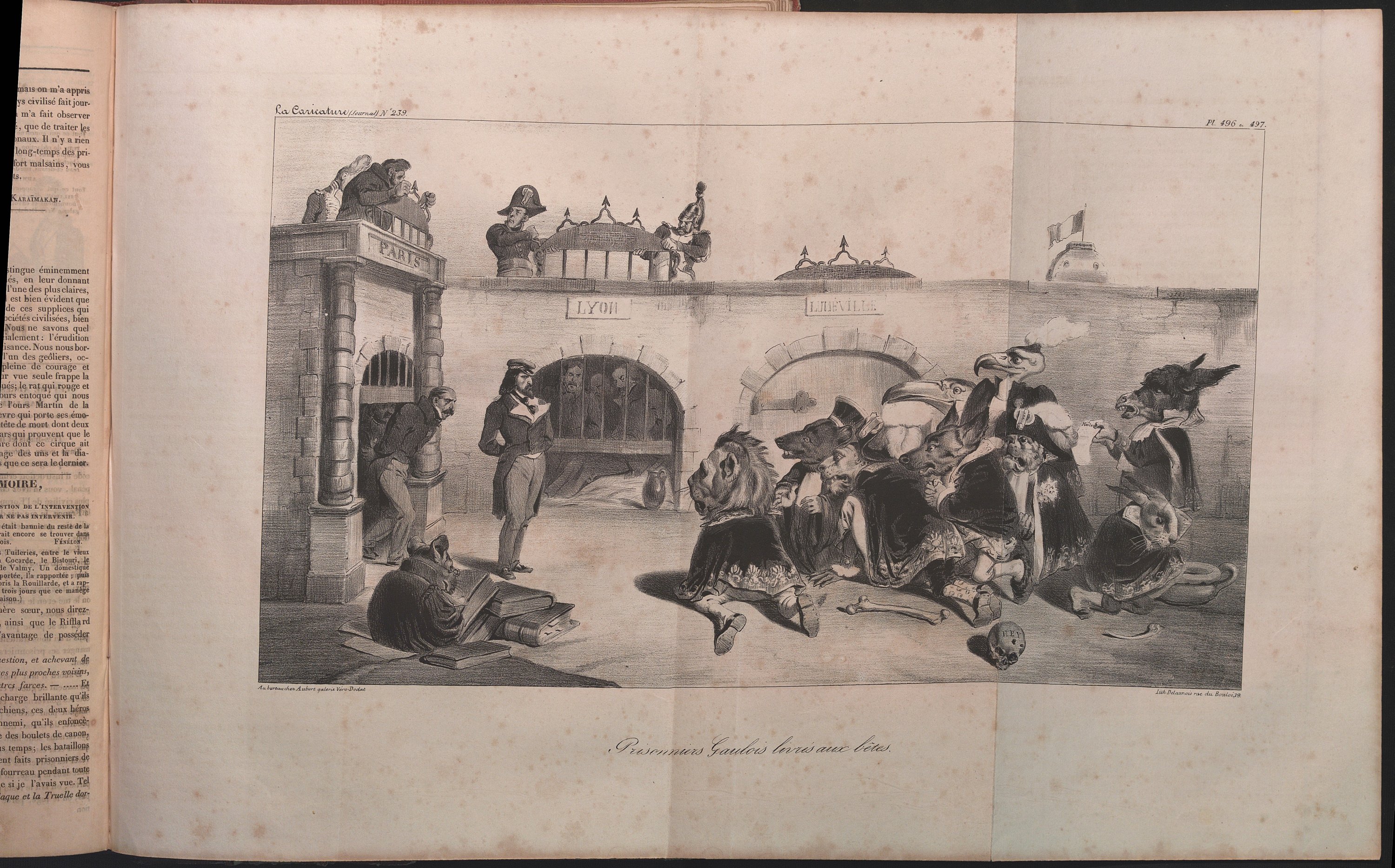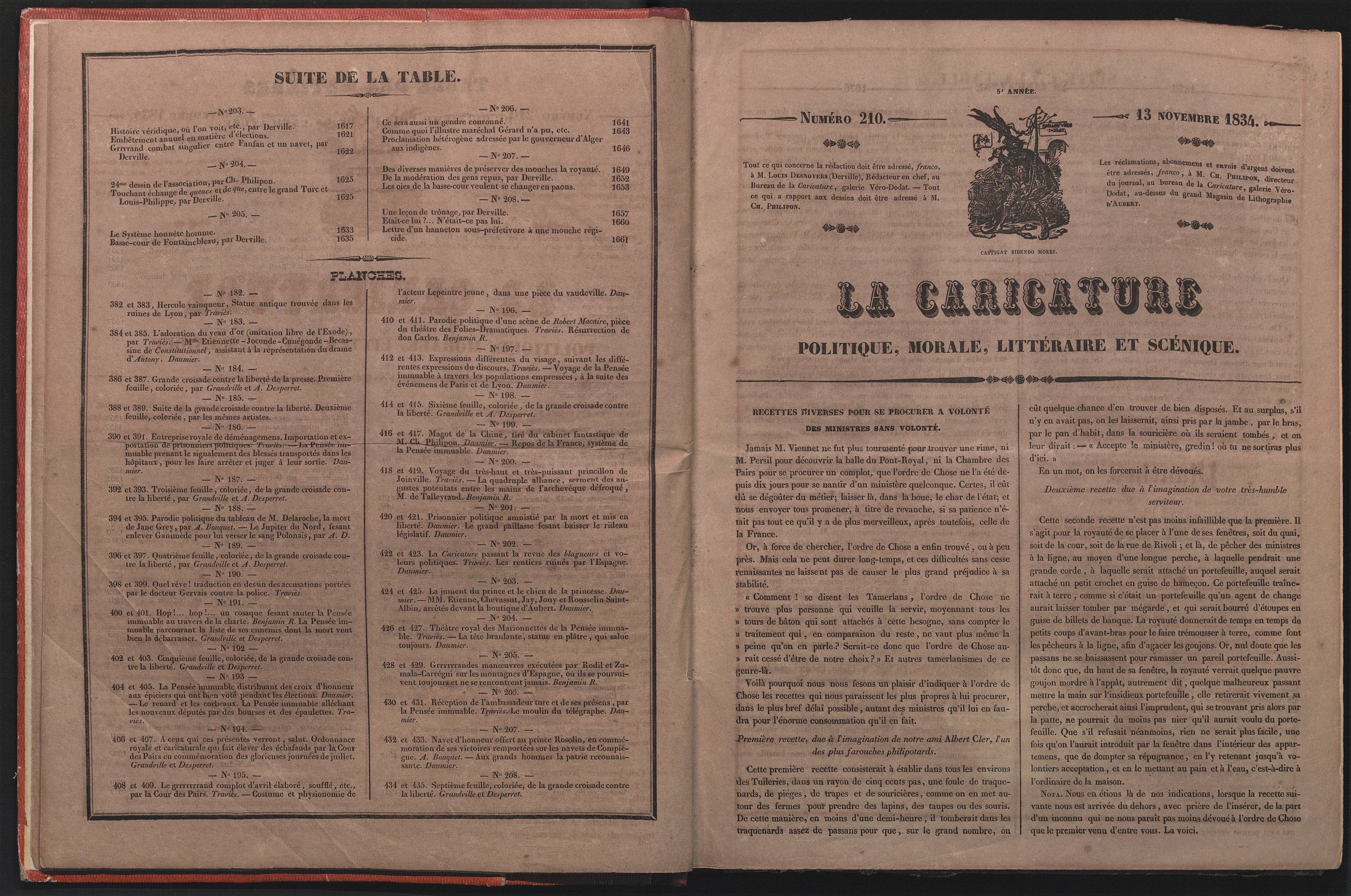 La Caricature est l’un des plus importants journaux illustrés satiriques du XIXe siècle, qui consacre deux illustrateurs de génie, Honoré Daumier et J.J. Grandville. Fondée par Charles Philipon, alors lithographe lyonnais installé à Paris, La Caricature a mené, de 1830 à 1835, un combat sans merci contre le pouvoir du roi Louis-Philippe, comptant notamment sur les contributions de Balzac, Hugo et Louis Desnoyers. Continuellement harassée par la censure royale et les nombreux procès que le pouvoir lui intentait, elle finit par disparaître en août 1835, un mois avant que les lois de septembre 1835 soient promulguées interdisant la caricature politique