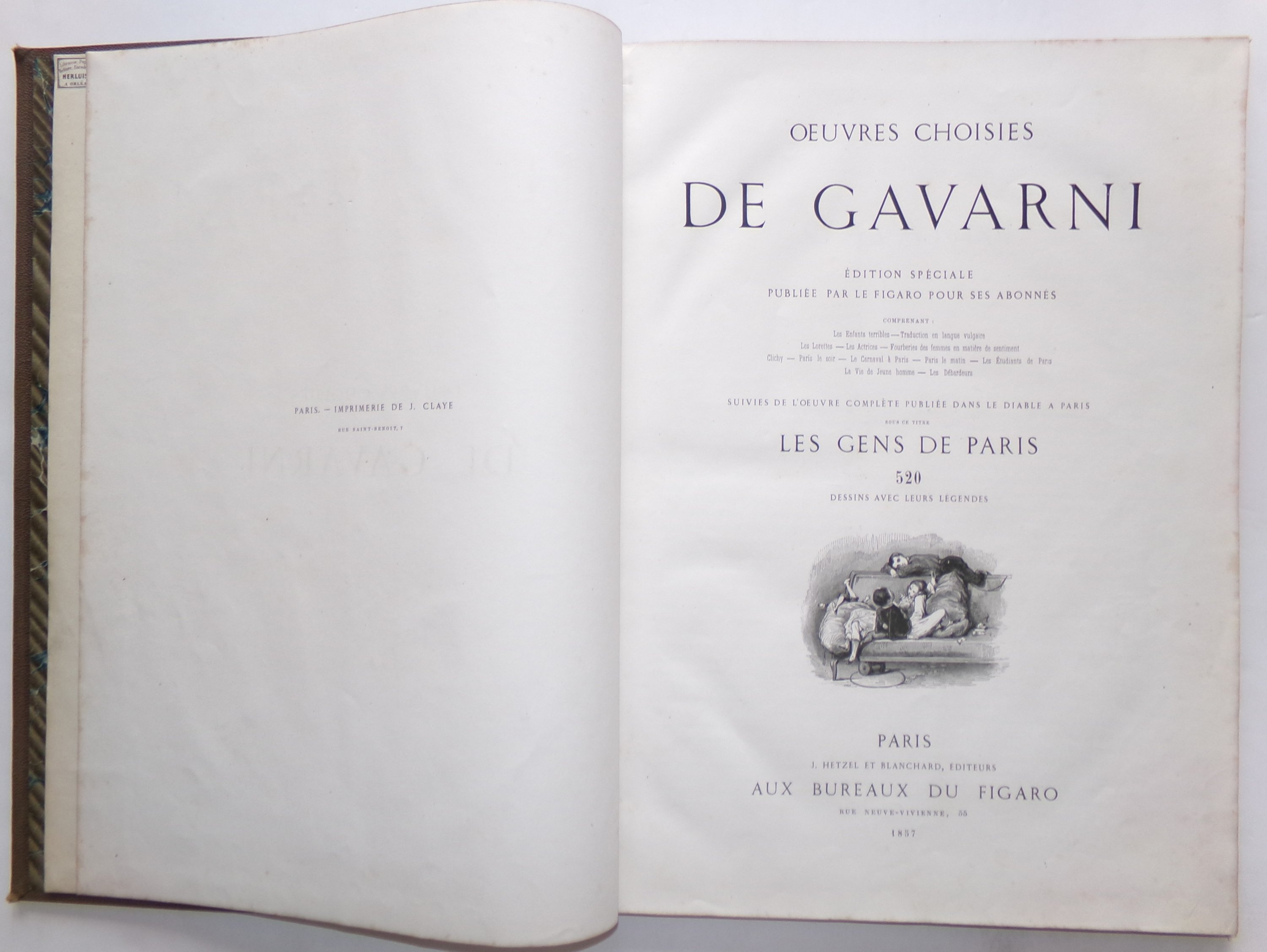 Oeuvres choisies de Gavarni. Edition spéciale publiée par Le Figaro pour ses abonnés. Paris, Hetzel et Blanchard, 1857. In-fol. rel. percaline. Album comprenant une préface de Théophile Gautier et plus de 520 gravures sur bois de Gavarni illustrant: Les Enfants Terribles, Traduction en langue vulgaire, Les Lorettes, Les Actrices, Fourberies de femmes en matière de sentiment, Clichy, Paris le soir, Le Carnaval à Paris, Paris le matin, Les Etudiants de Paris, La Vie de Jeune Homme, Les Débardeurs suivis de Les Gens de Paris (usures à la couv.) ;
