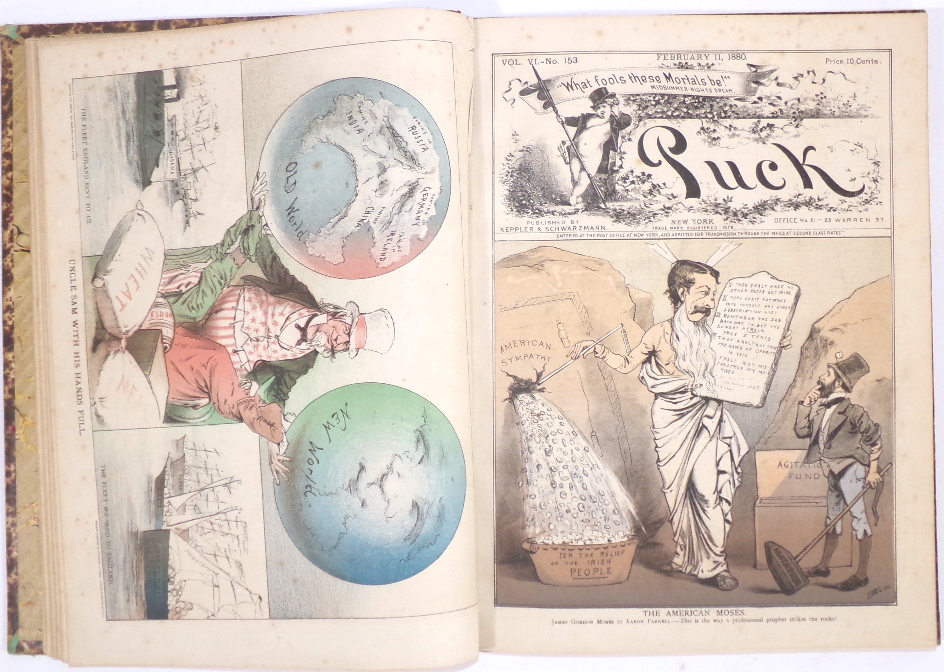 Joint: 1 vol. rel. ½ chagrin grand in-4 « Puck », hebdomadaire satirique américain, n°151 vol.6 (28 janvier 1880) au n°165 vol.7 (5 mai 1880).