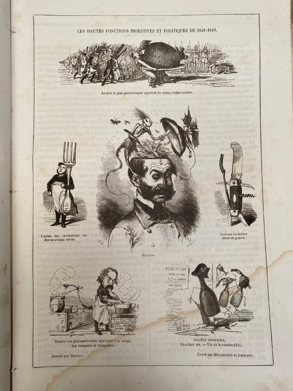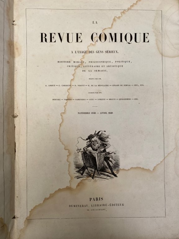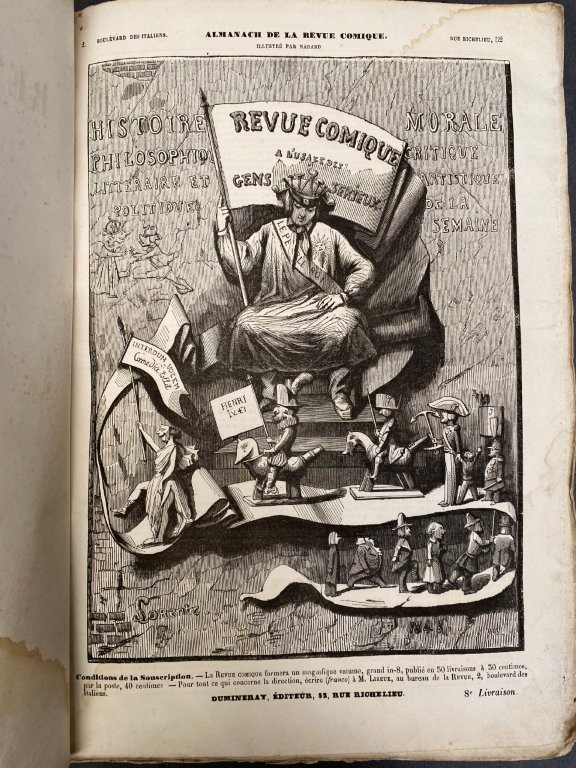 La revue comique à l’usage des gens sérieux, Histoire morale, philosophique, politique, critique, littéraire et artistique de la semaine. Novembre 1848 à avril 1849. 1er tome in-4 rel. Paris, Dumineray et au bureau de la Revue Comique. Page illustrée de la 1ère livraison, 368 pp. Dessins in-texte et h.-t. de Nadar, Achille Béguin, Bertall, Alcide-Joseph Lorentz, Nadar, Otto, Quillenbois, etc. Jules Hetzel créa cette revue pour soutenir la candidature du général Cavaignac contre Louis Napoléon. Elle prit fin sous les coups de la censure. B.E. (couv. en l’état., rousseurs éparses)