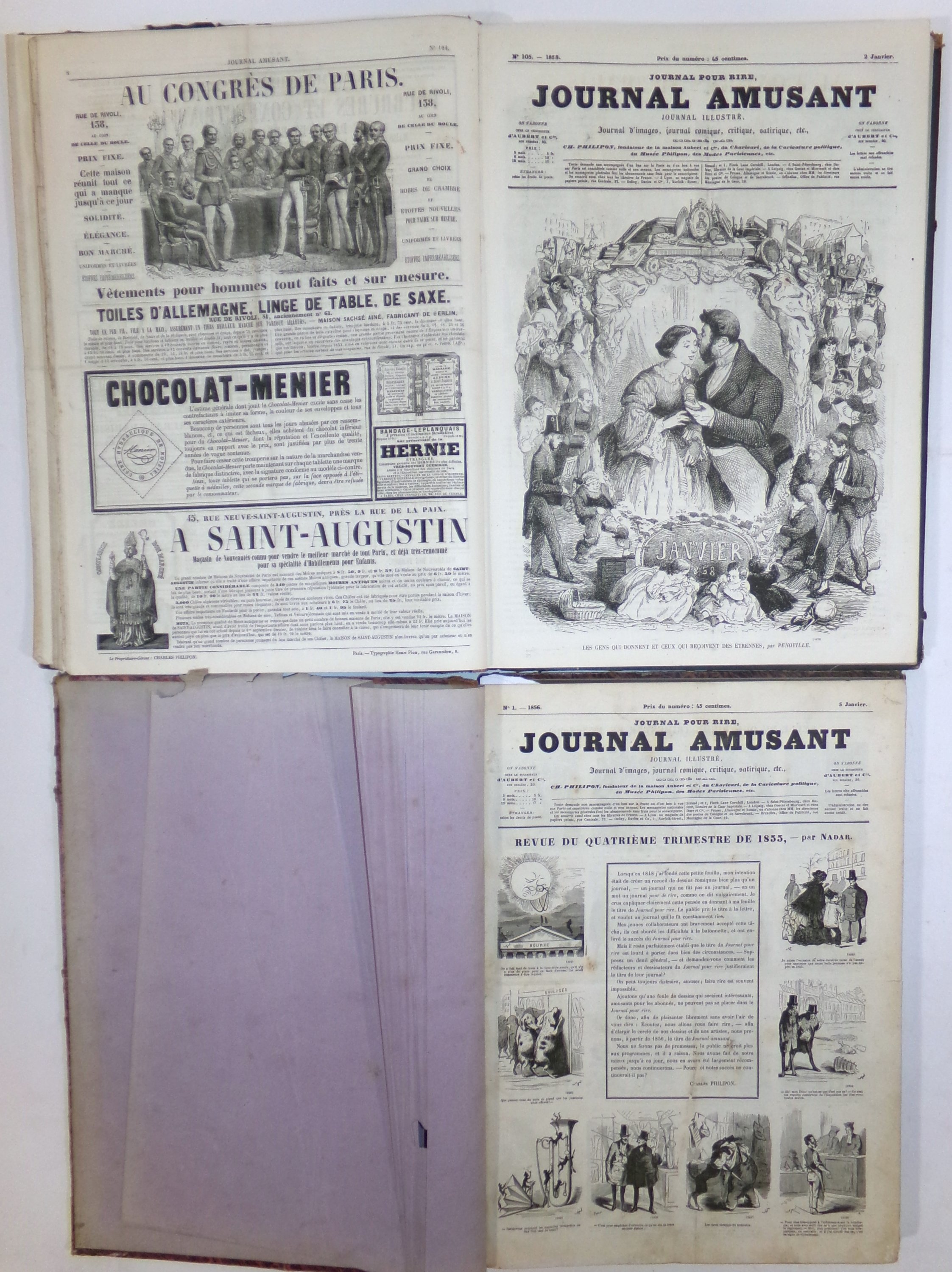 Joint: Cent gravures du musée français accompagnées d’un texte amusant par les rédacteurs de tous les journaux littéraires de Paris. Paris, au bureau du Journal Amusant. In-fol. broch. Journal d’illustrations mensuelles dirigé par Ch. Philipon: n°1 (janvier 1855) au n°21 (sept. 1856) (mque n°7), B.E. ; 1 vol. in-fol. rel. contenant Le Musée Français, n°37 (janv. 1858) au n°71 (nov. 1860), B.E. (qqs pages rest. avec du scotch, mques).