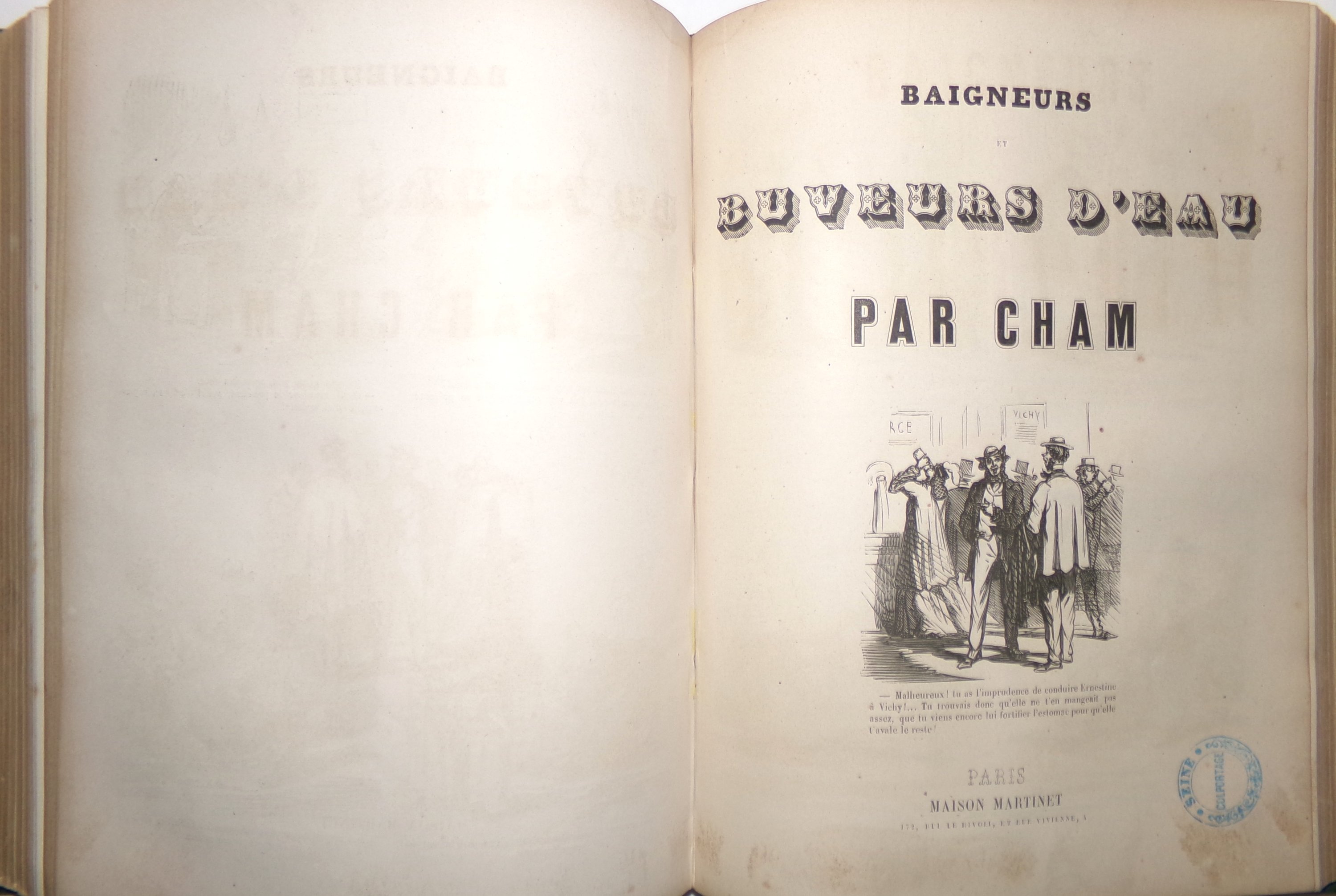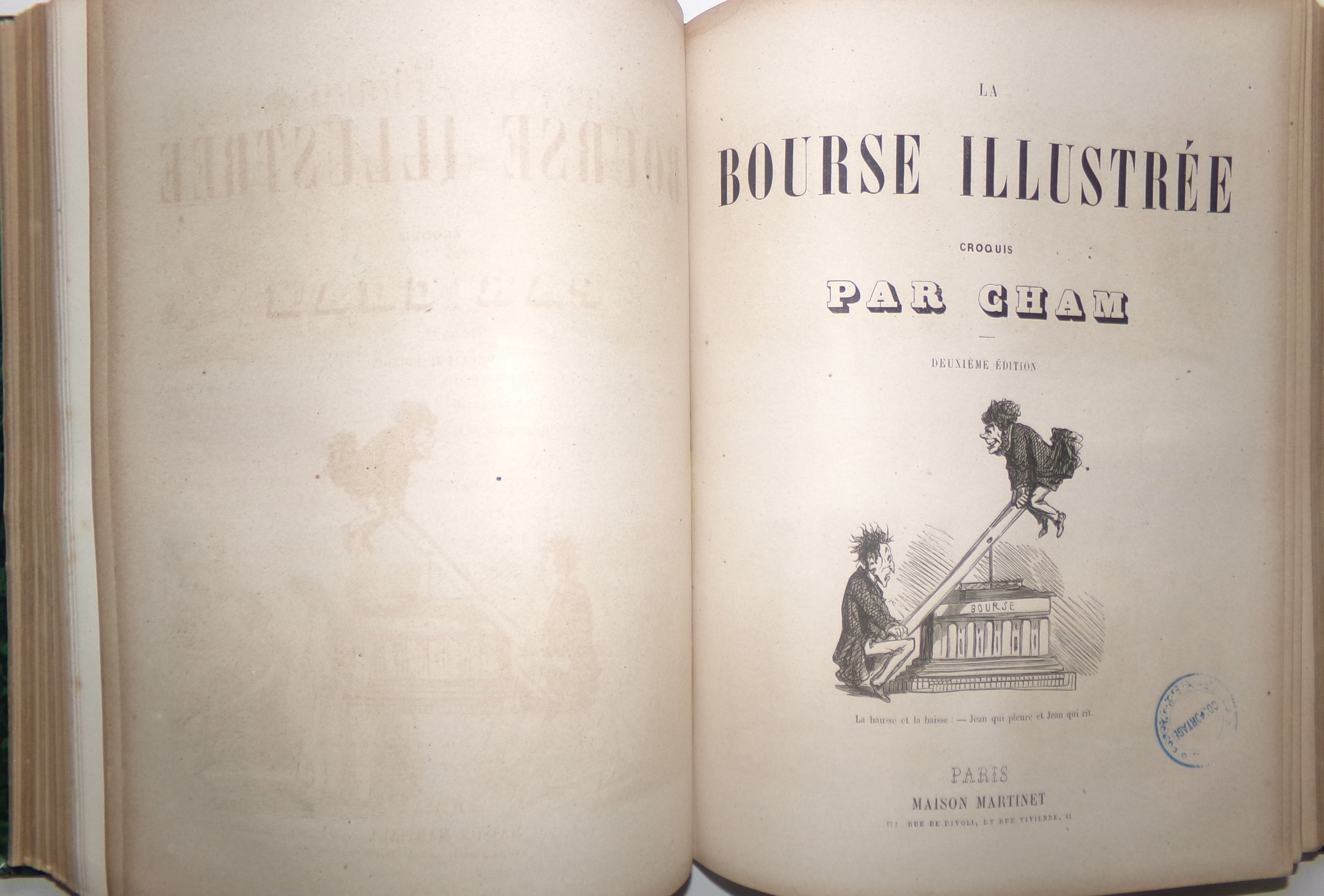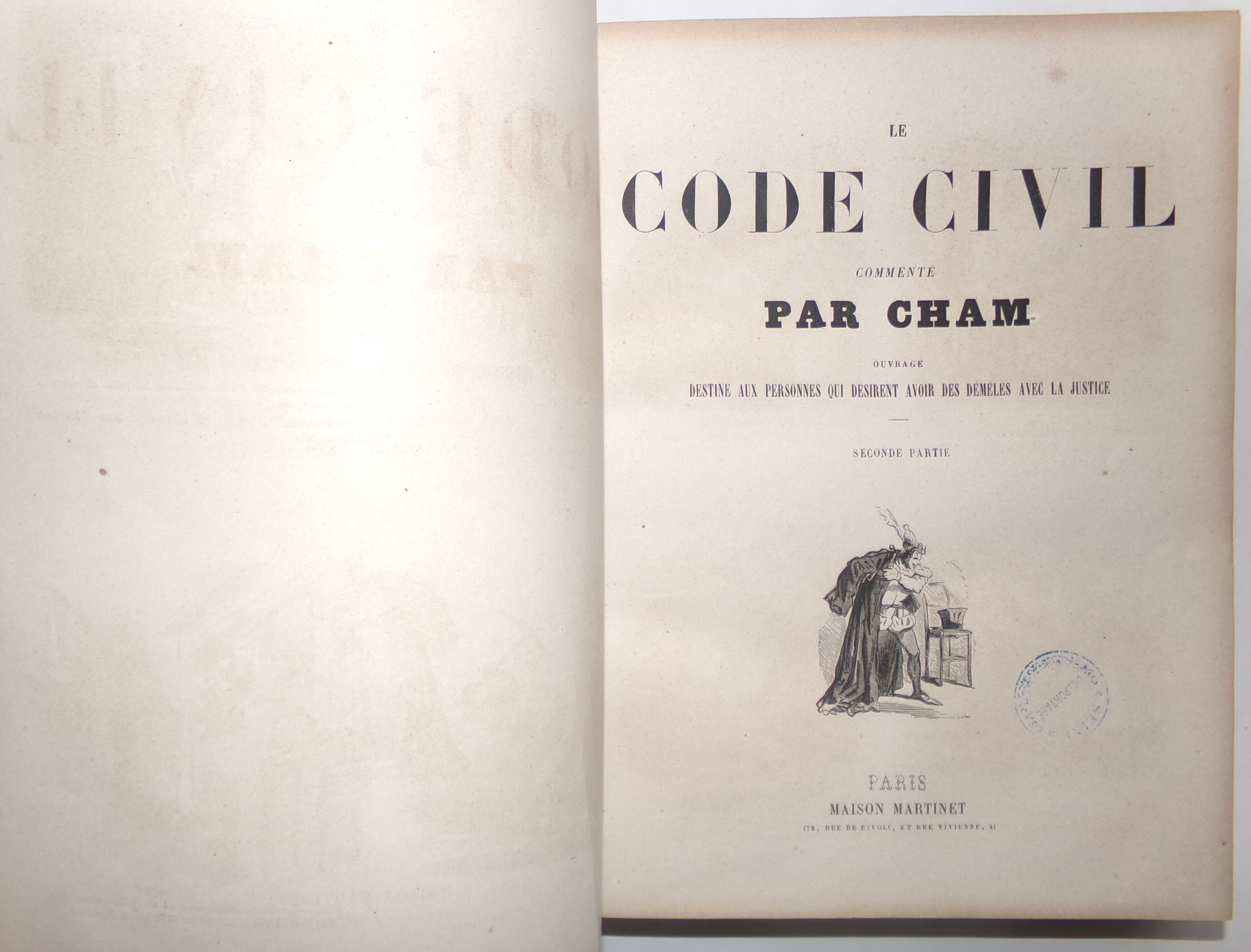 Recueil factice de 15 fascicules imprimés de caricatures en majorité croqués par Cham (14 fasc.) et par Baric (1 fasc.) en 1 vol. rel. ½ basane in-8: Le code civil commenté par Cham, ouvrage destiné aux personnes qui désirent avoir des démêlés avec la justice (3 parties) ; L’exposition de Londres (2 parties) ; Choses et autres ; Cours de physique ; Au bal de l’Opéra ; La bourse illustrée ; Les jours gras ; Baigneurs et buveurs d’eau ; Pendant la canicule ; Spahis et turcos ; Promenades au jardin d’acclimatation ; Voilà ce qui vient de paraître, revue comique de l’année par Baric. Tampon bleu de colportage de la Seine sur chaque couv., publiés à Paris par la maison Martinet et Arnauld de Vresse, vers 1861-1863 ;