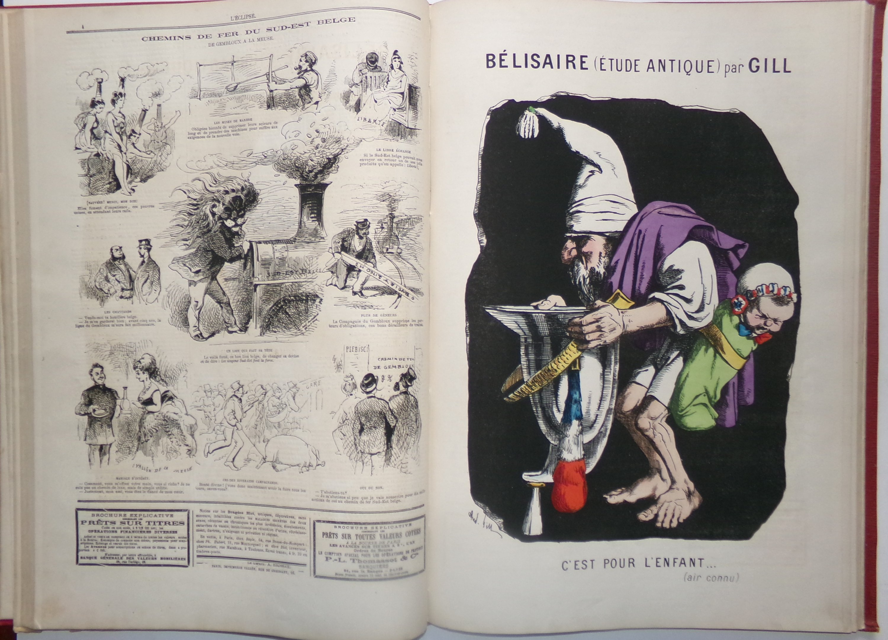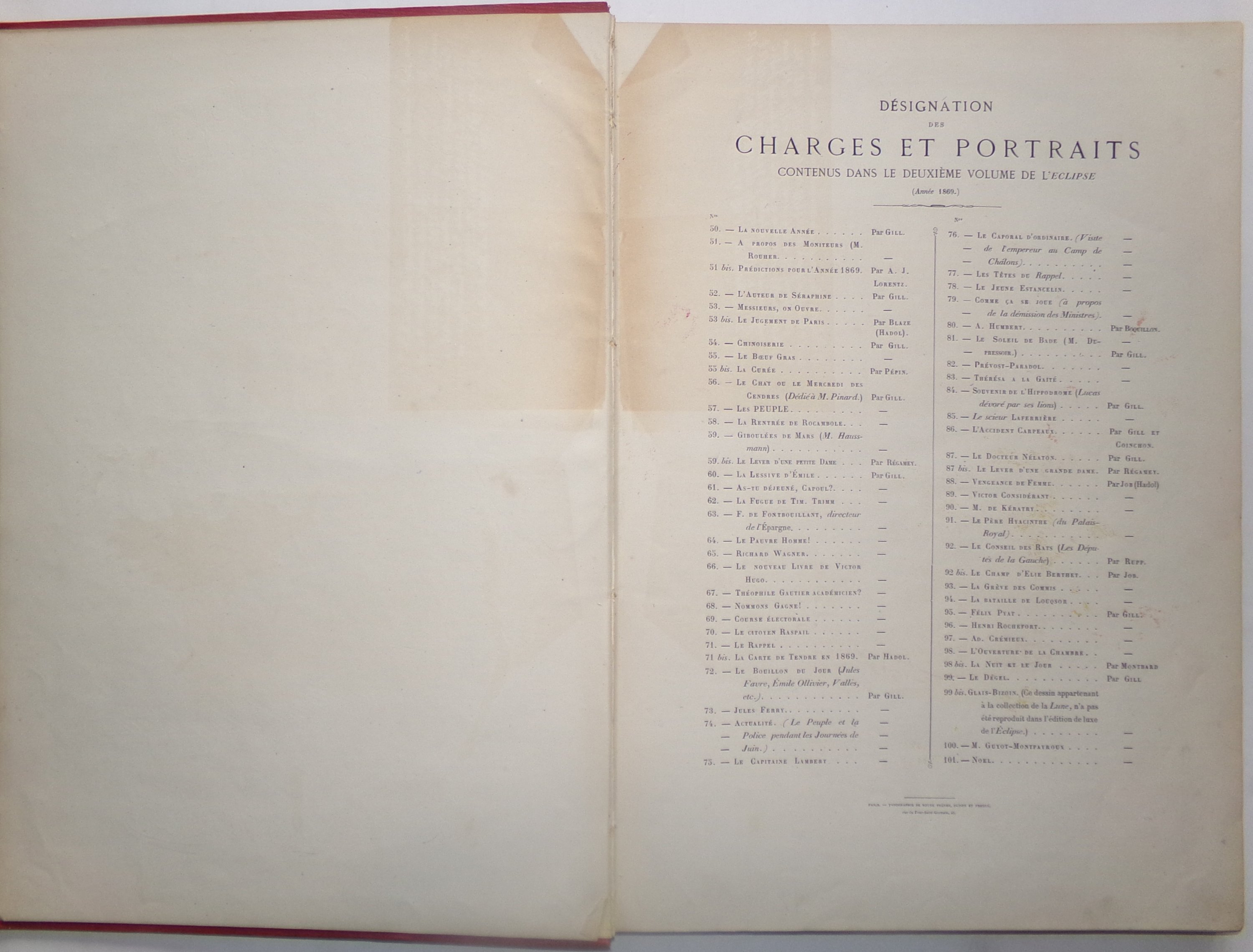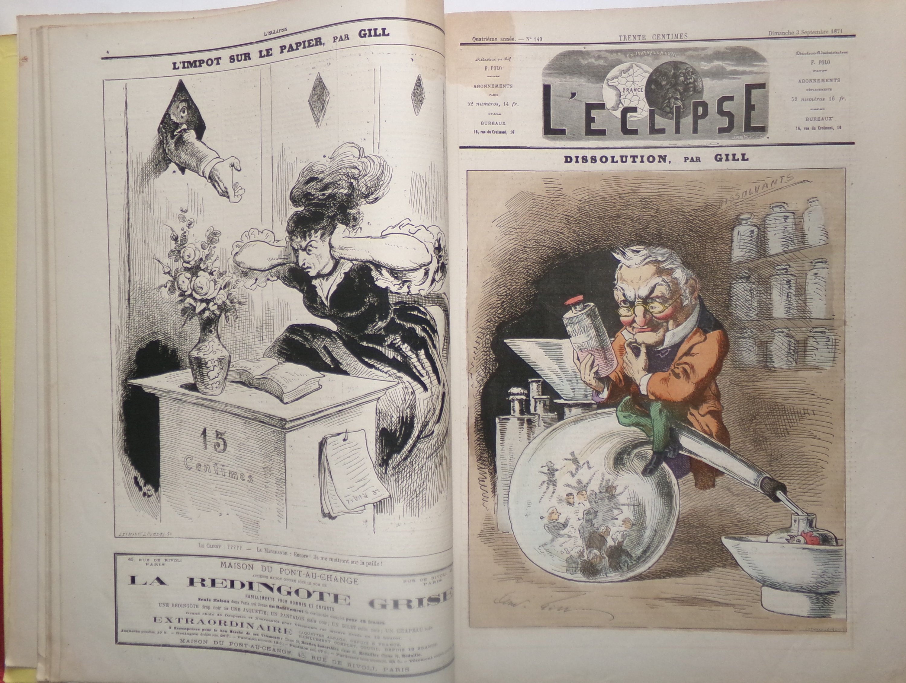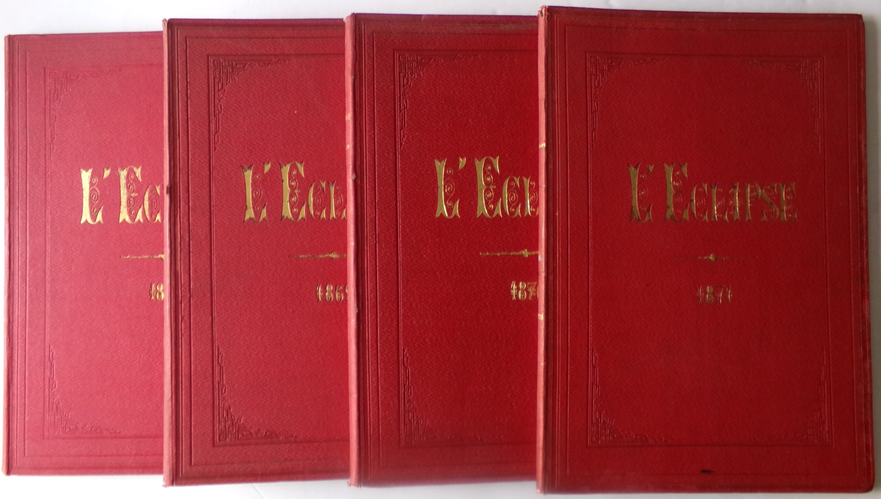 (1 vol.) n°102 (2 janvier 1870) au n° 139 (18 septembre 1870) suivi des suppl. n°1 à 5 (du 18 sept. 1870 à juin 1871, l’Eclipse ne parut pas, mais elle publia durant ces neuf mois d’interruption, 5 feuilles supplémentaires) y compris suppl. du n°119, n°103bis, 105bis, 106bis, 114bis, 116bis, 128bis, 129bis, 132bis, 133bis, 134bis, complet ;