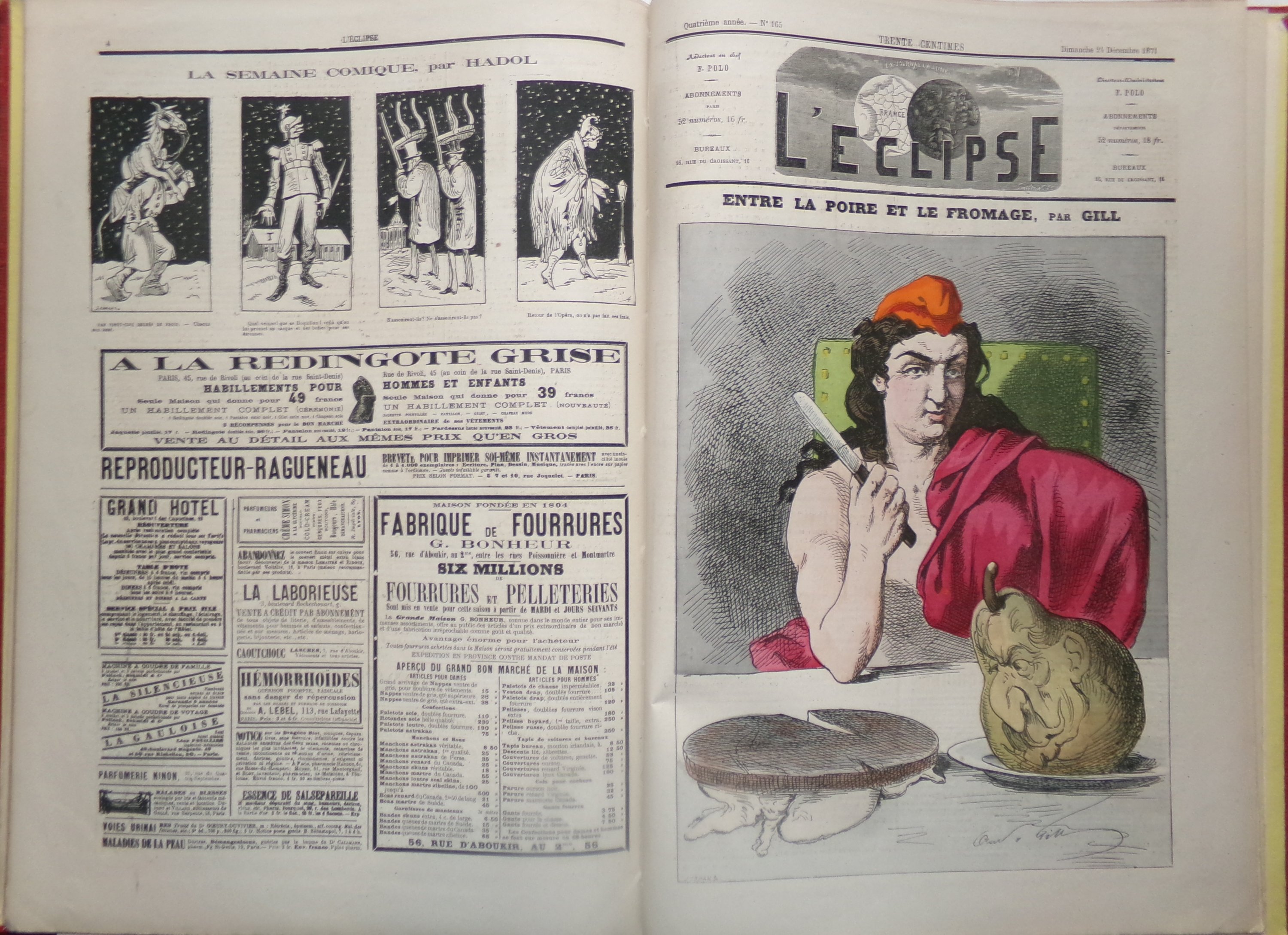 Dirigée par François Polo, « L’Eclipse » forme la continuation de « La Lune », interdit par la censure en décembre 1867. La boutade « La Lune devra subir une éclipse » détermine le nom du successeur de « La Lune »: « L’Eclipse ». Le premier numéro paraît le 26 janvier 1868. Illustré essentiellement par André Gill, « L’Eclipse » connut de nombreuses censures et interdictions de publication: du 4 octobre 1868 au 14 août 1870, l’administration n’interdit pas moins de 22 numéros de l’Eclipse. Cette censure réagissait souvent au dernier moment, si bien qu’il fallait composer une nouvelle caricature dans la hâte. Les exemplaires recomposés portent en général le numéro du fascicule suivi de la lettre « b » pour bis. Les caricatures touchaient aussi bien des personnages de la vie politique que ceux de la vie artistique et littéraire. En 1876, deux ans après la mort de François Polo, la vente du journal s’essoufflant, il fut décidé d’en réduire le format. Gill n’y trouvant pas son compte et rêvant de grandes compositions, commença une nouvelle aventure avec « La Lune rousse » dont le premier numéro parut le 10 décembre 1876.