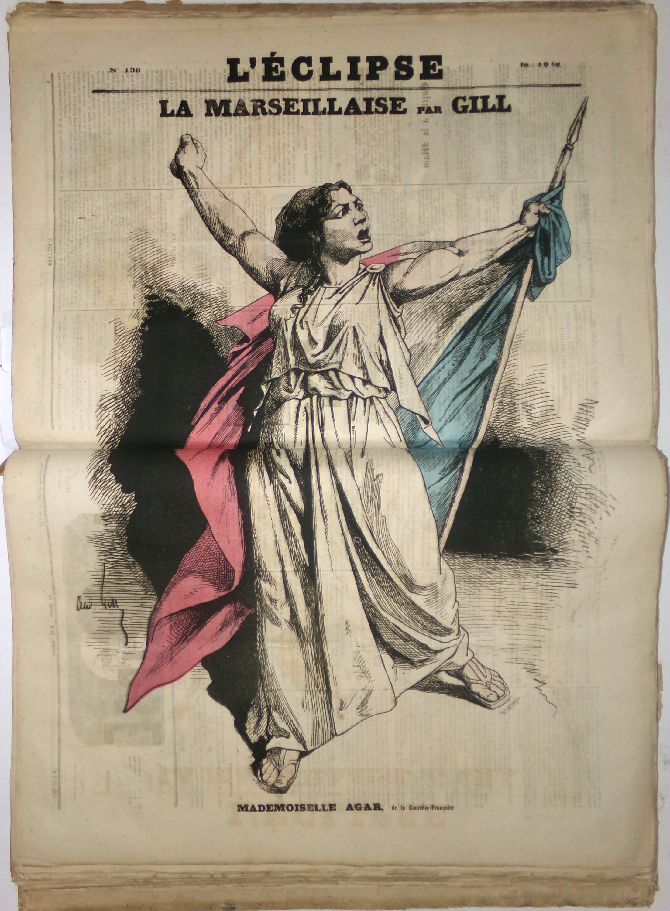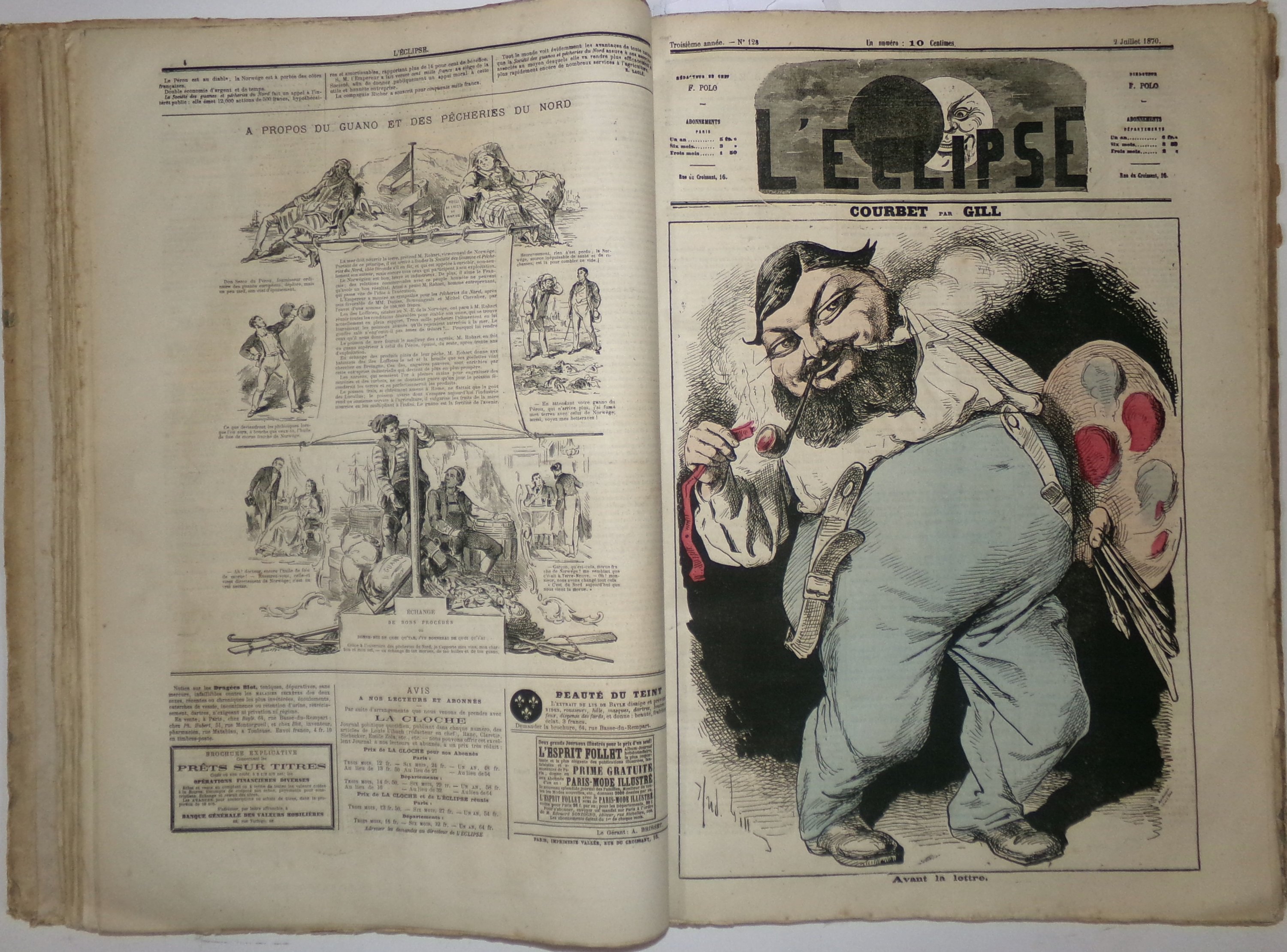 (1 vol.): n°102 (2 janvier 1870) au n° 139 (18 septembre 1870) suivi des suppl. n°1 à 5 (du 18 septembre 1870 à juin 1871, l’Eclipse ne parut pas, mais elle publia durant ces neuf mois d’interruption, 5 feuilles supplémentaires) ; du n°140 (juin 1871) au n°166 (31 décembre 1871) y compris suppl. du n°119, n°103bis, 105bis, 106bis, 114bis, 116bis, 128bis, 129bis, 132bis, 133bis, 134bis, 149bis, 151bis, 156bis, 158bis, 160bis et 164bis. Couv. et pages de titre de l’éditeur. T.B.E. (légères rousseurs, qqs déchirures et petits mques en marge).