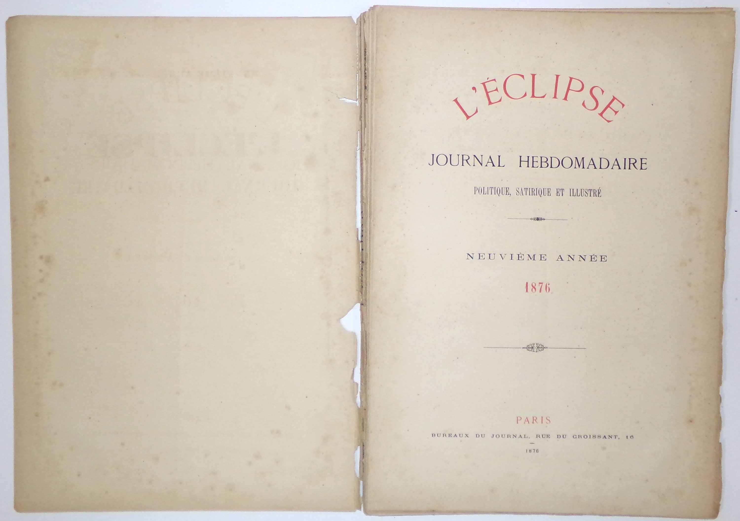 (1 vol.): n°375 (2 janvier 1876) au n°400 (25 juin 1876) ; B.E. (rousseurs, qqs déchirures). Couv. de l’éditeur (en l’état, déchirures) et page de titre.