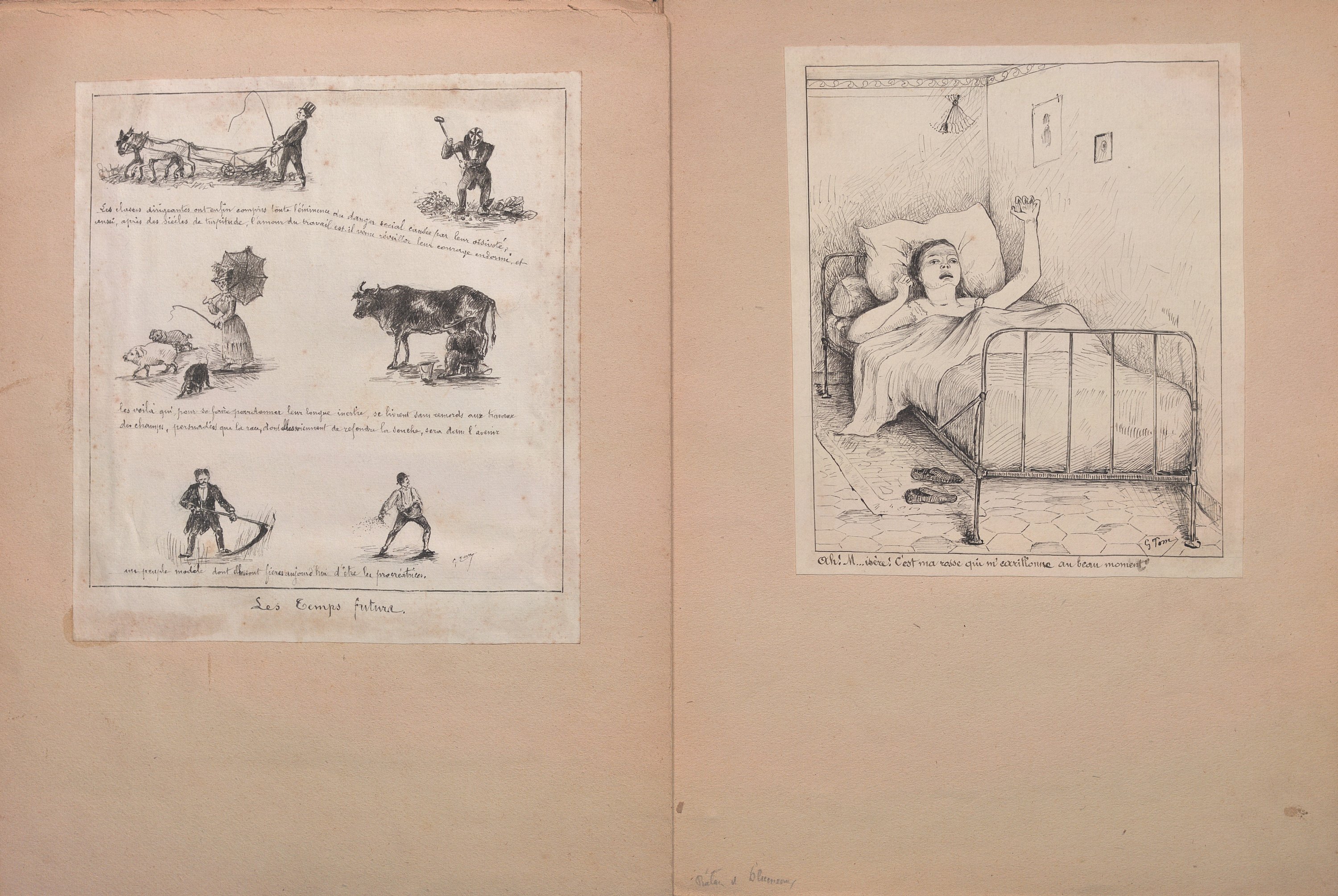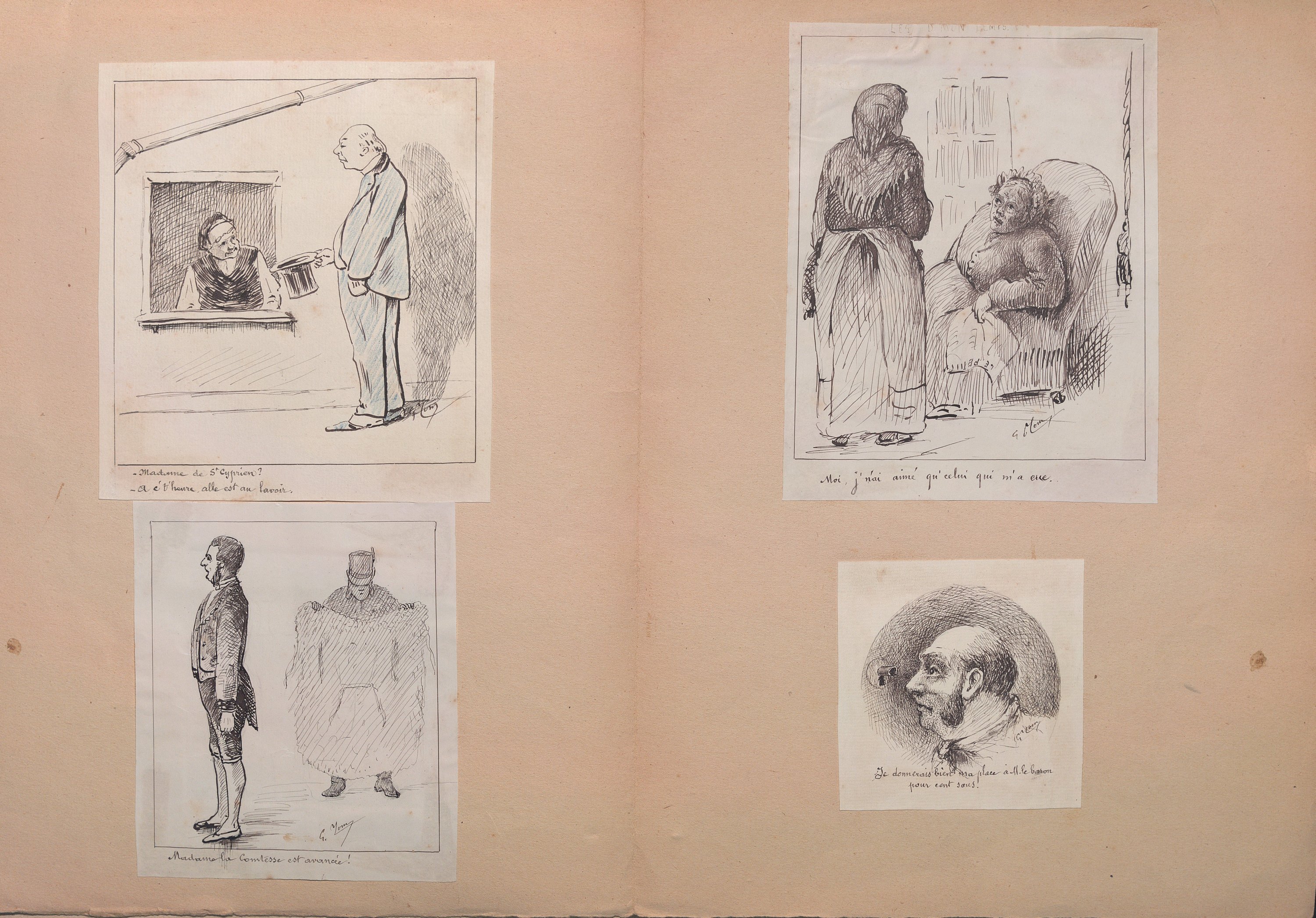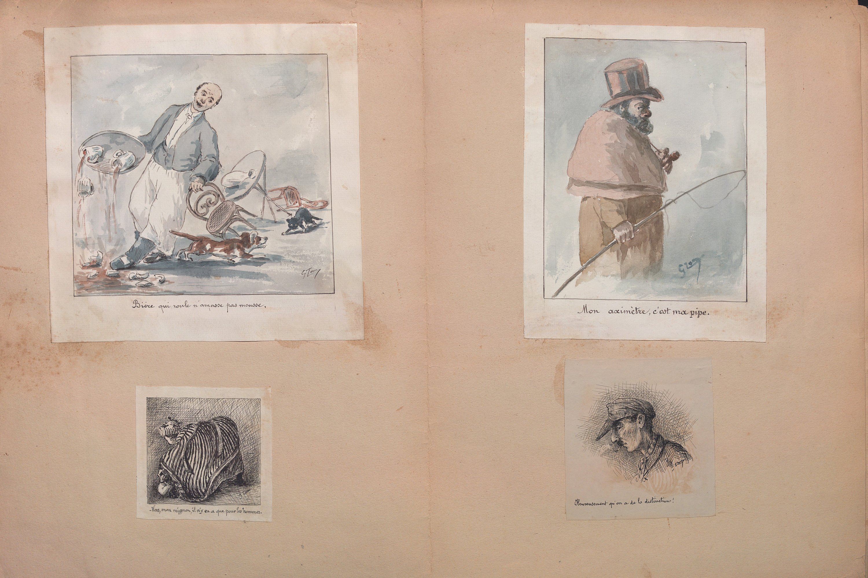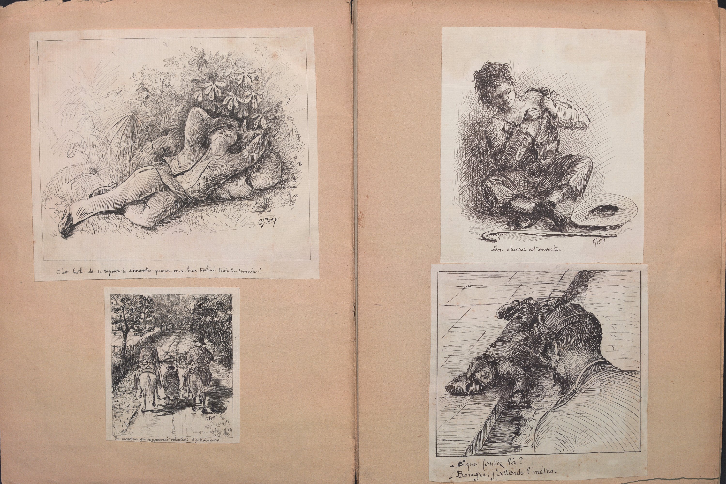 43 dessins originaux humoristiques et divers, encre et aquarelle, formats divers, contrecollés sur feuillet épais 38 x 28 cm, tous signés G. Tom ou G. Thomas, légendés dont La Lot & Garonnaise.