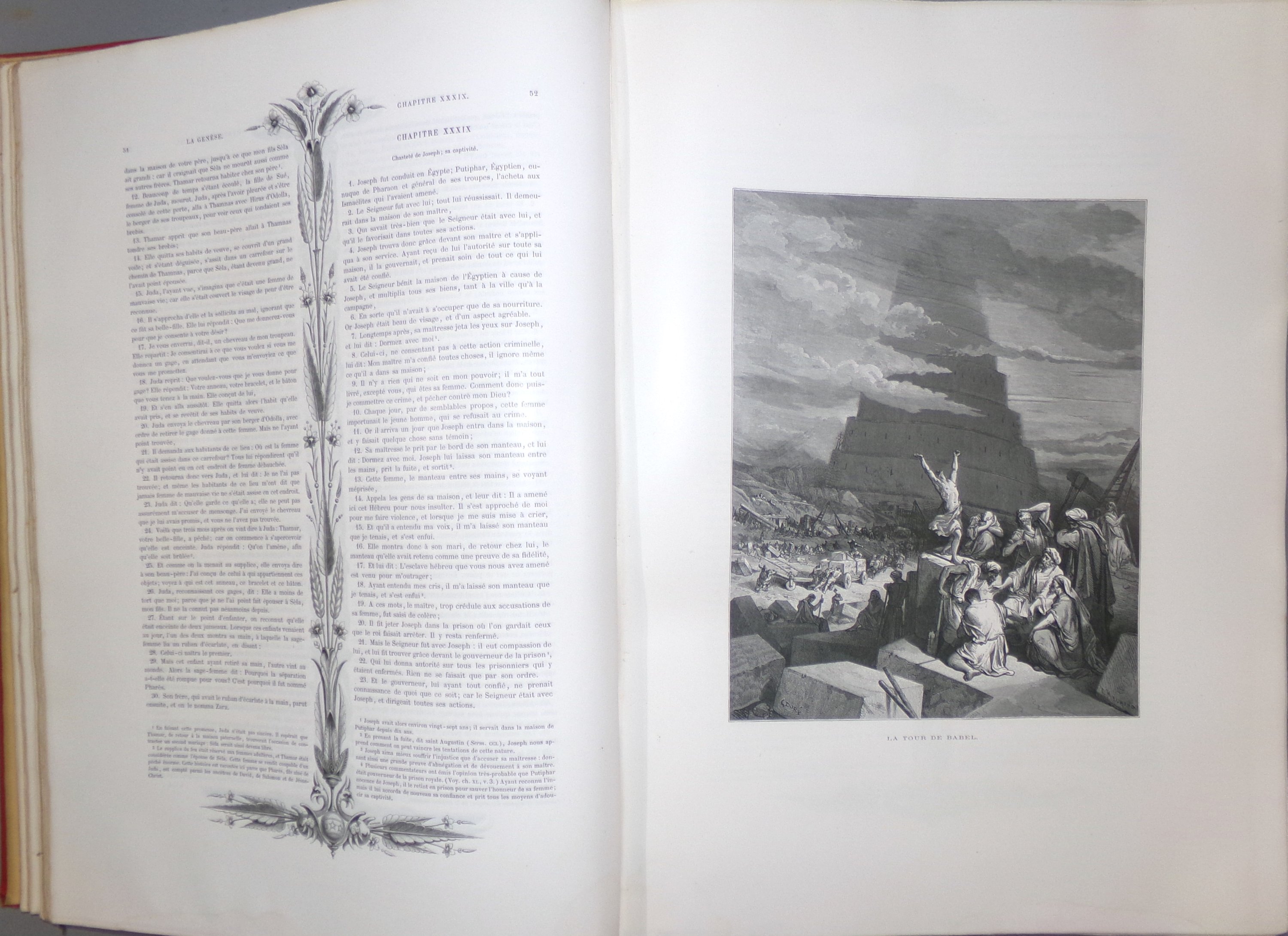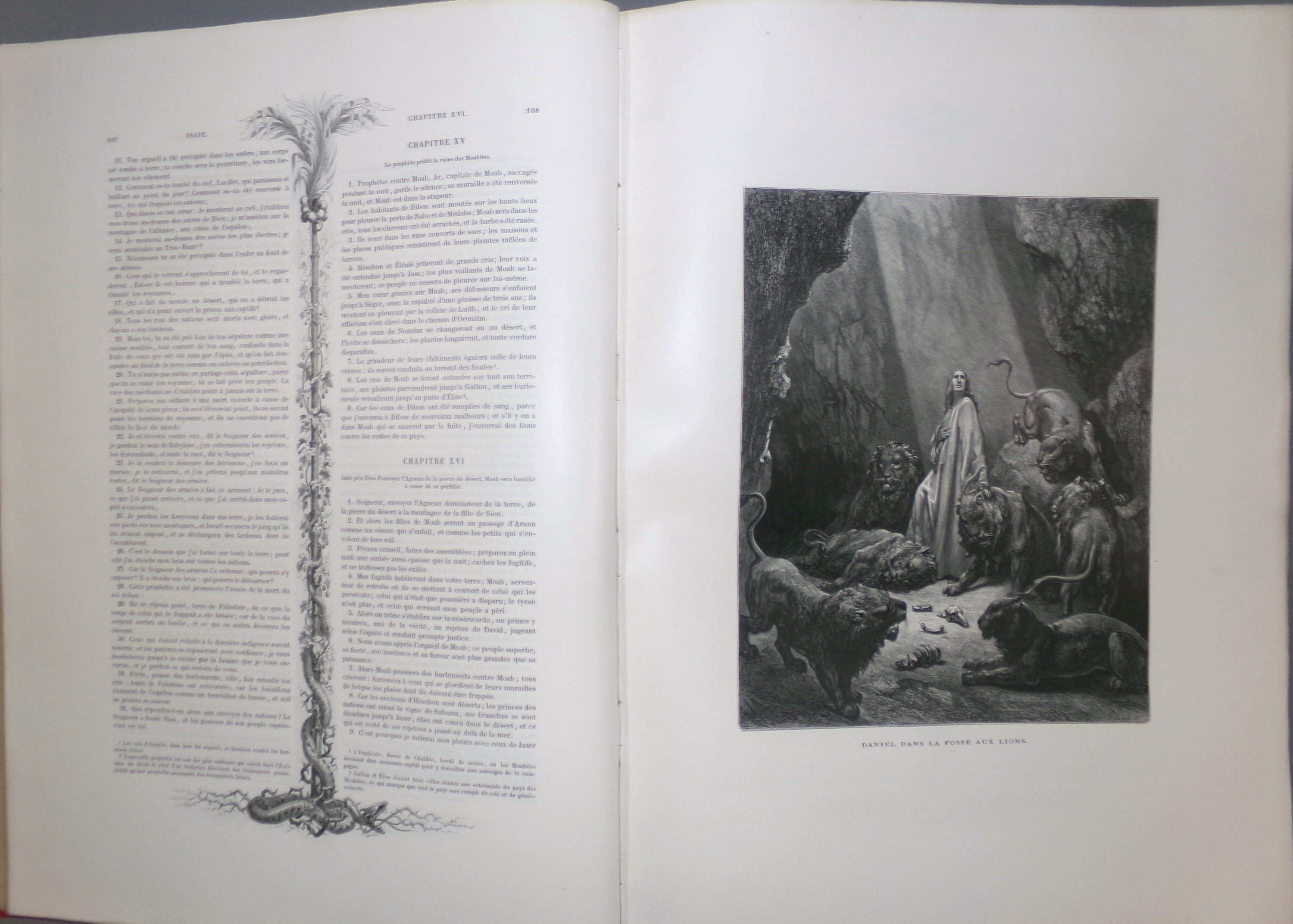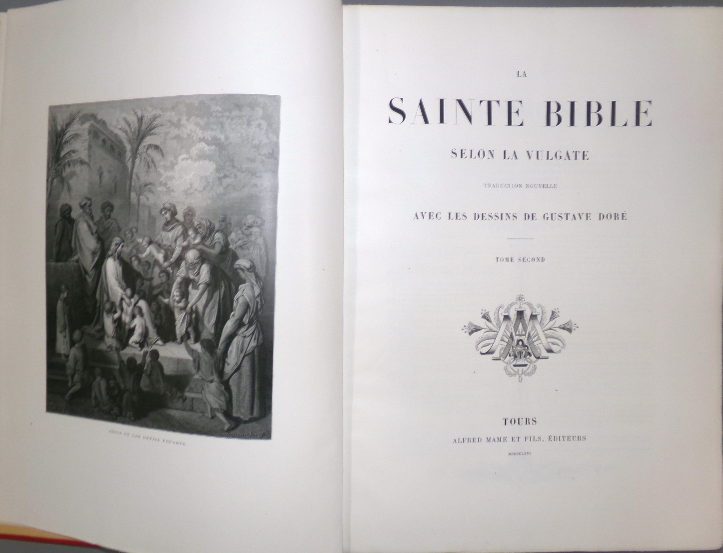La Sainte Bible. 2 tomes en 2 vol. Tours, Mame, 1866. Fort in-fol. percaline rouge couv. éditeur. Ornementation du texte par Giacomelli et planches de Gustave Doré.