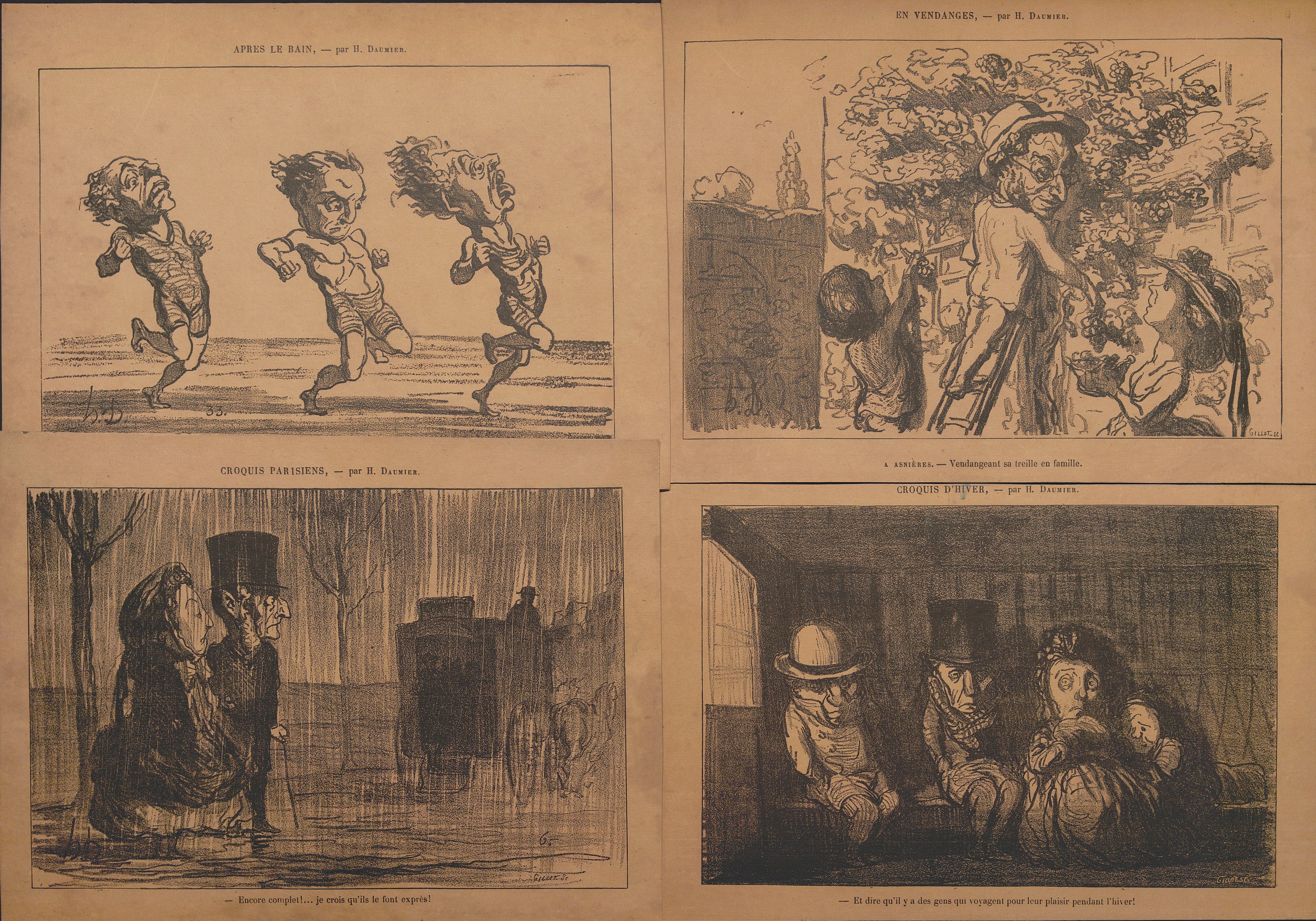 48 caricatures d’après Honoré Daumier, extraites des journaux d’époque comme le Charivari, contrecollées sur carton fort, env. 21 x 28 et 26 x 28 cm ;