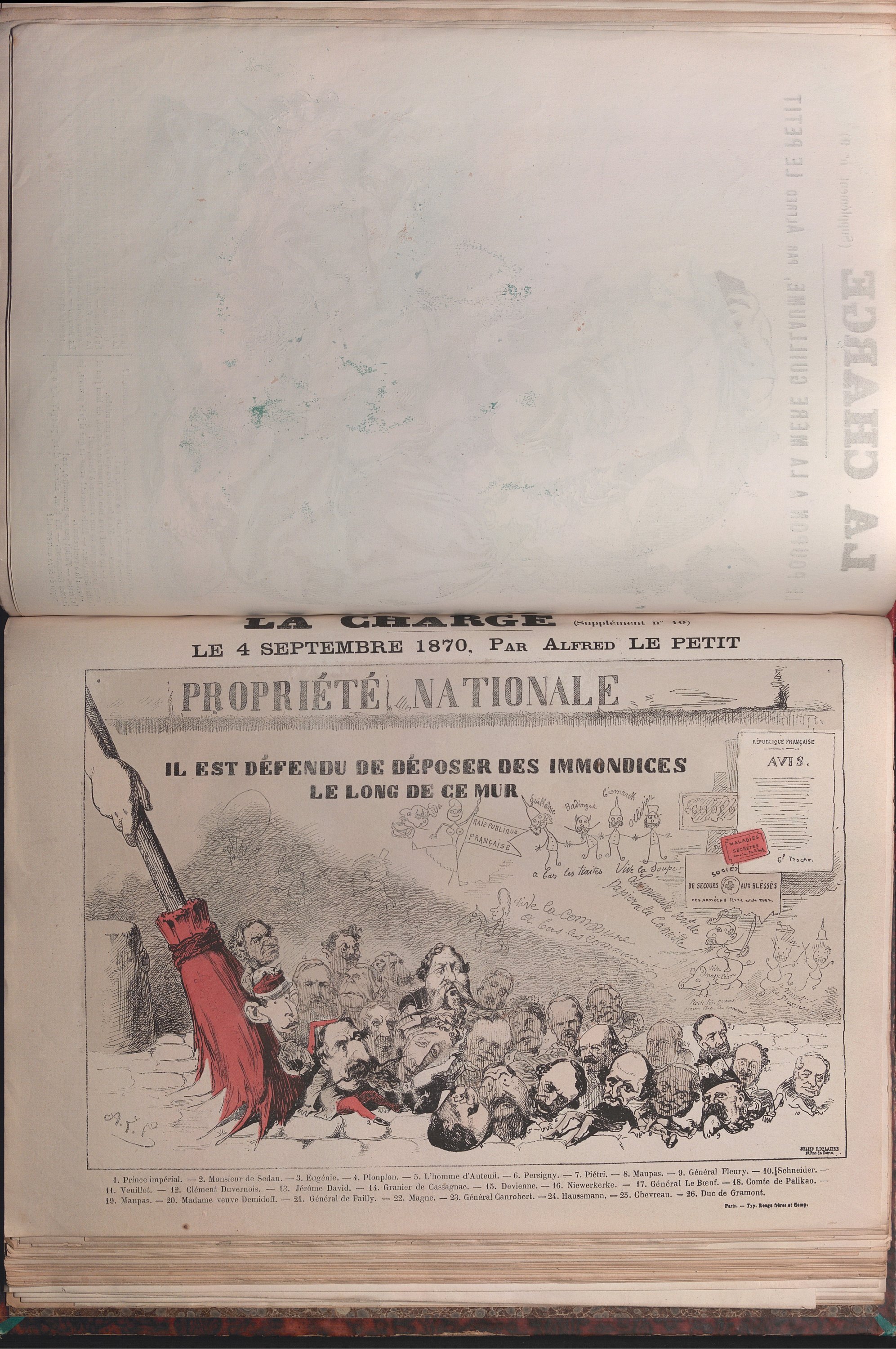 « Avec l’effondrement de l’Empire, l’avancée des armées prussiennes sur la capitale française, la proclamation de la République à Paris le 4 septembre 1870, le journalisme satirique imagé reconquiert son champ d’action originel: la rue. La feuille volante domine par rapport à la caricature incluse dans un journal. Parmi les quelque 4 000 publications parues entre septembre 1870 et l’écrasement de la Commune, fin mai 1871, de nombreuses feuilles volantes ont pu atteindre le tirage-record de 50 000 exemplaires. Pour les satiristes ces événements sont naturellement l’occasion de régler leurs comptes avec le régime déchu. Leur discours en image ne se borne pas à évoquer les 20 années de règne dictatorial, il dénonce aussi le maintien de l’appareil militaire et administratif bonapartiste » [La caricature entre République et censure, 2019]