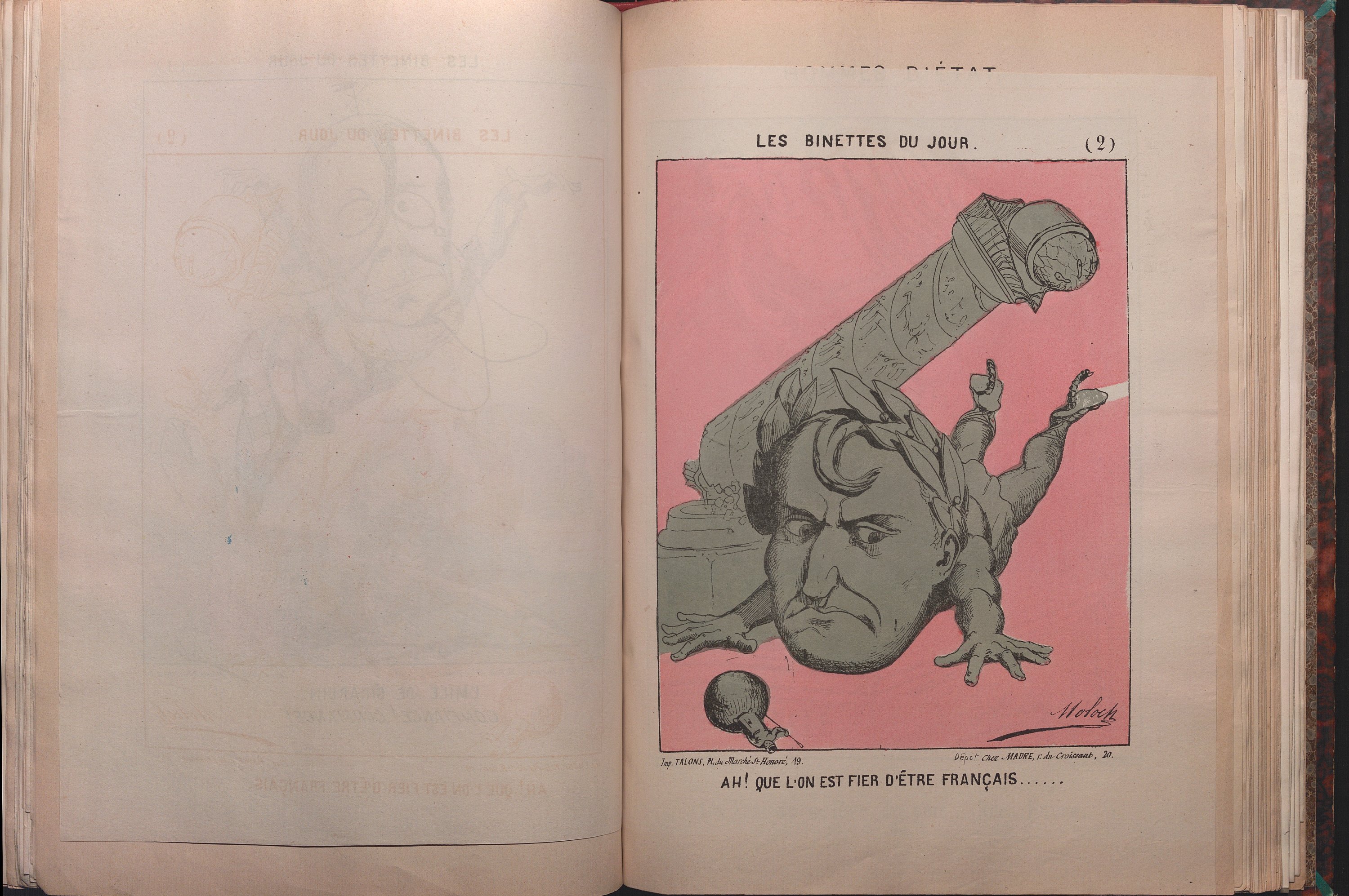 Alphonse Hector Colomb (1849-1909) dit Moloch: série L.L.EX.EX. Les automédons, page de titre et n°1 au n°24 (complet) ; Hommes politiques, Vox populi ; série Les Prêtres, n°9, 21, 25 et 27 (sur 29 pl.) ; série Les Silhouettes de 1871, n°2, 5-13, 15-26 (sur 26 pl.) ; série Les Prêtres, n°2, 5, 12 ; Actualités, Comment votre Excellence ne déduit donc pas de ces 3 500 000 ; Actualités, Son Altesse Royale le Duc d’Aumale ; Les Binettes du jour, n°1 et 2 (complet) ; Hommes d’Etat, la grande colère du père Jules Favre ; série Badingoscope, n°1 (sur 7 pl.) ;