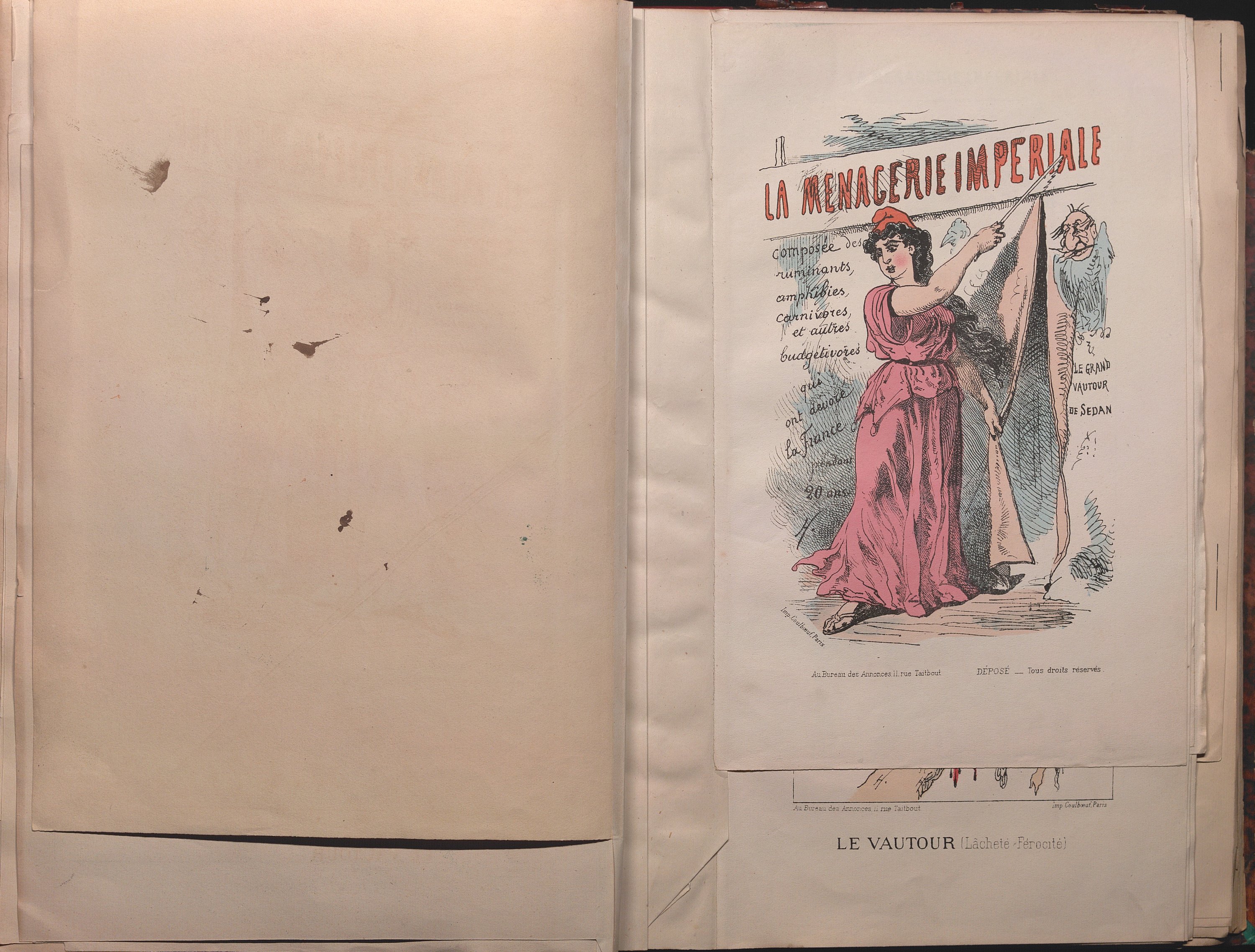 Recueil factice de 257 feuilles volantes, in-4 et in-fol., lithographiées à rehauts de couleurs d’époque, en un vol. in-fol. relié ½ chagrin sur onglets, 1870-1871.