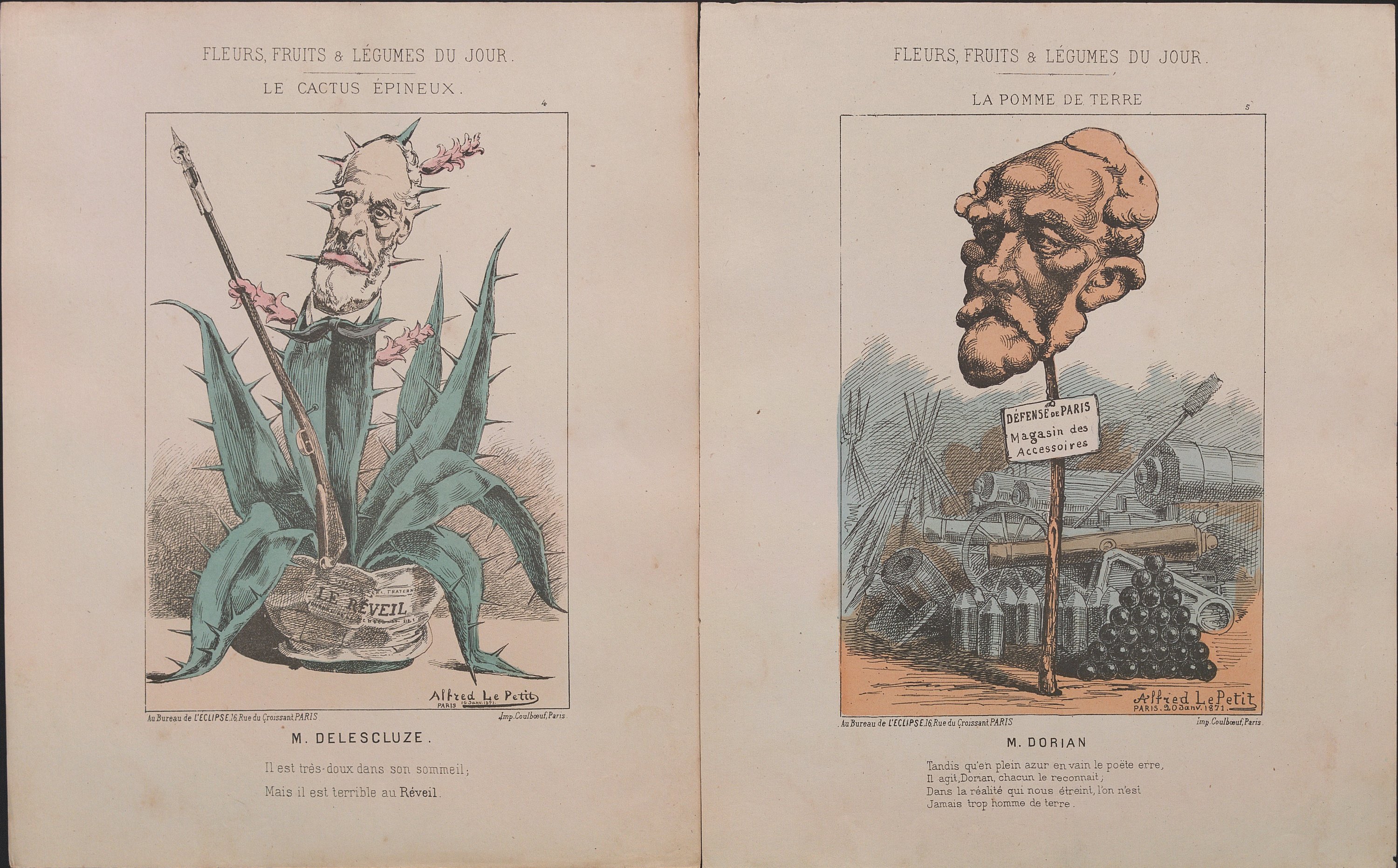 Suite complète de 32 planches datées de janvier à juin 1871. 31 caricatures figurant en fleur, fruit ou légume chaque personnalité dont Gambetta, Edmond About, Félix Pyat, Jules Ferry, Henri Rochefort, Adolphe Thiers, Victor Hugo, Emile Littré, etc.