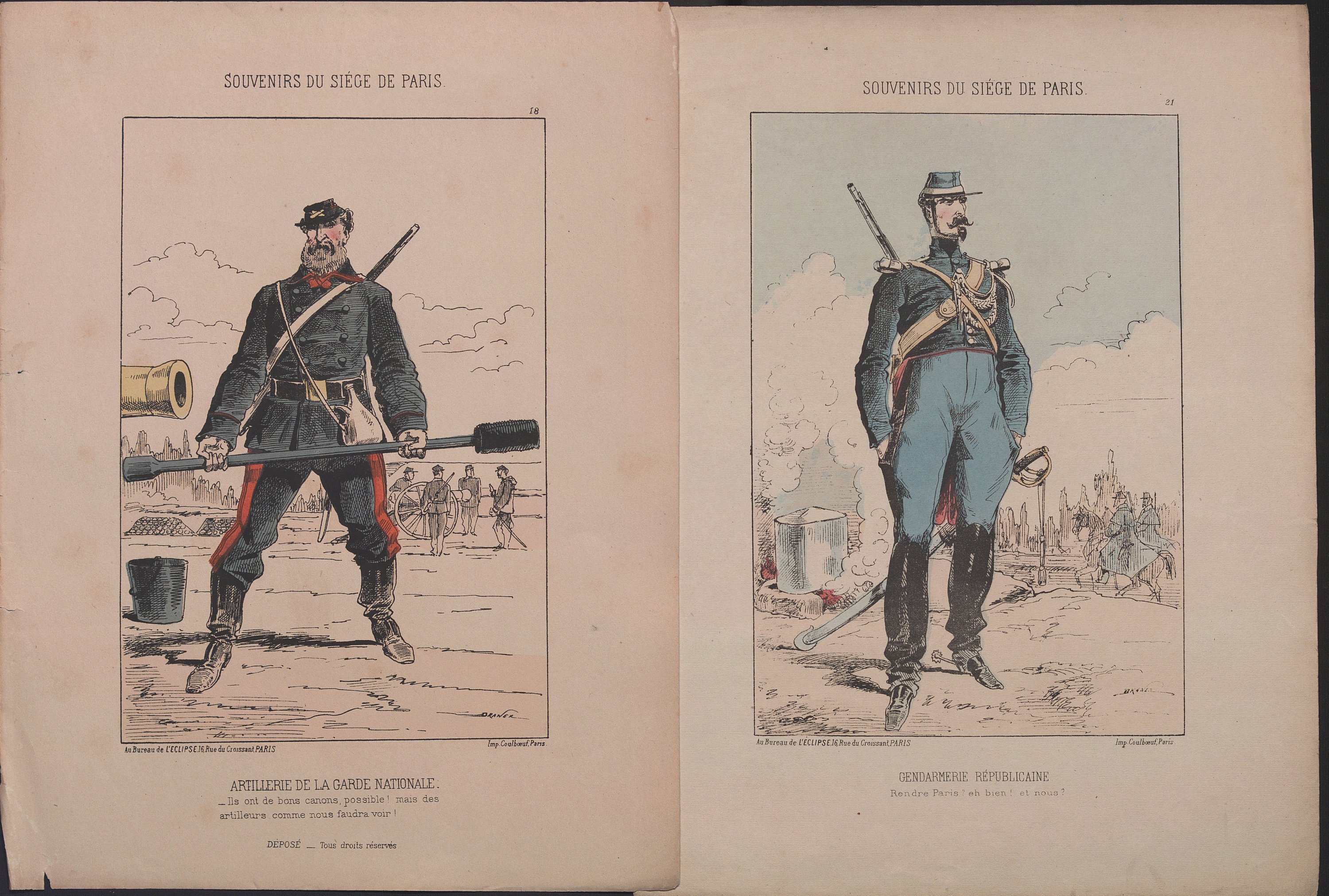 31 ex. série Souvenirs du siège de Paris, Les défenseurs de la capitale, page de titre et n°1 au n°31 (mque 10, 12, 19-20), + 4 ex. en double, 33 x 25 cm