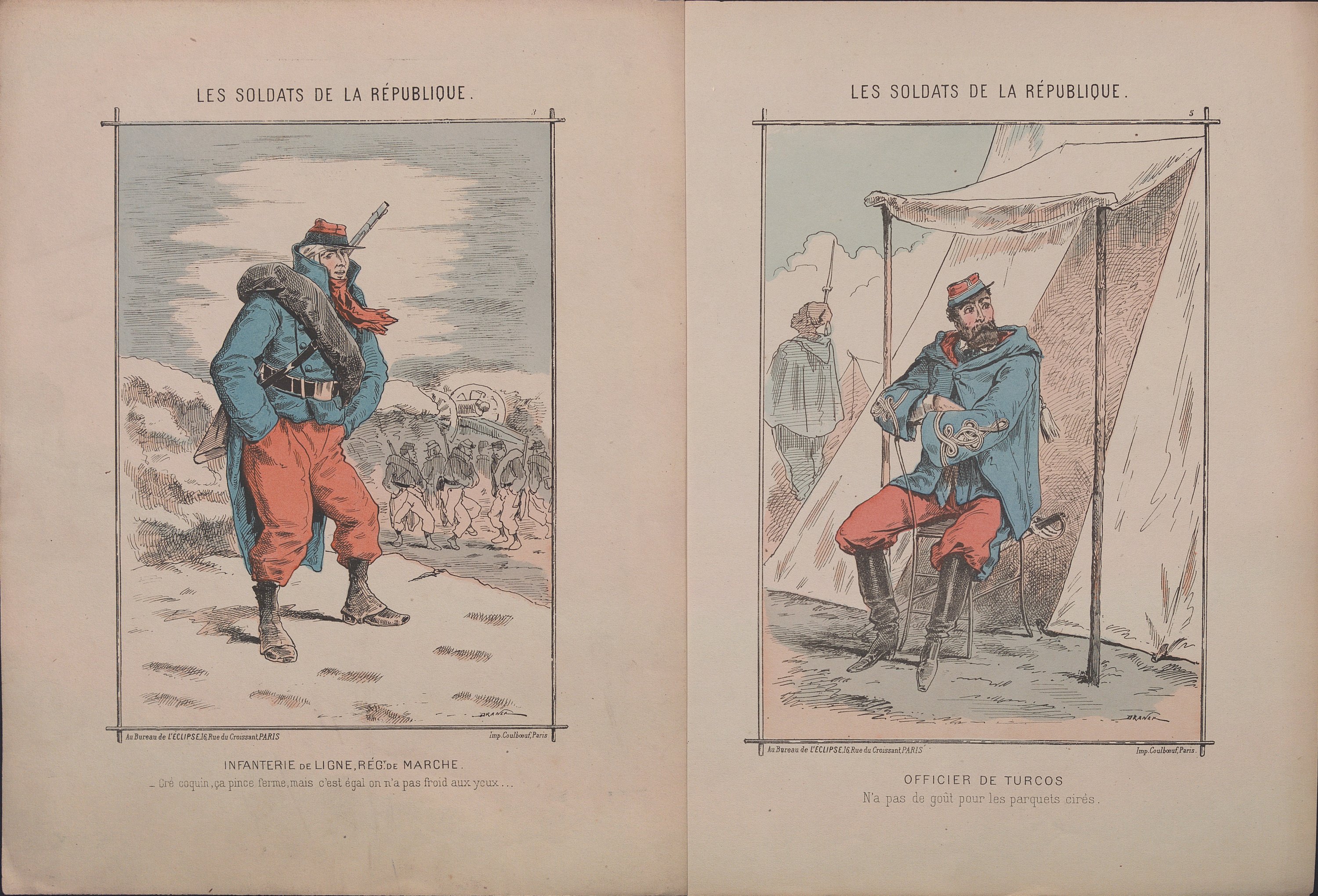 39 ex. série Souvenirs du siège de Paris, Les soldats de la République, n° 1 au n°31 (mque 21, 24), + 10 ex. en double, 32,5 x 24,5 cm