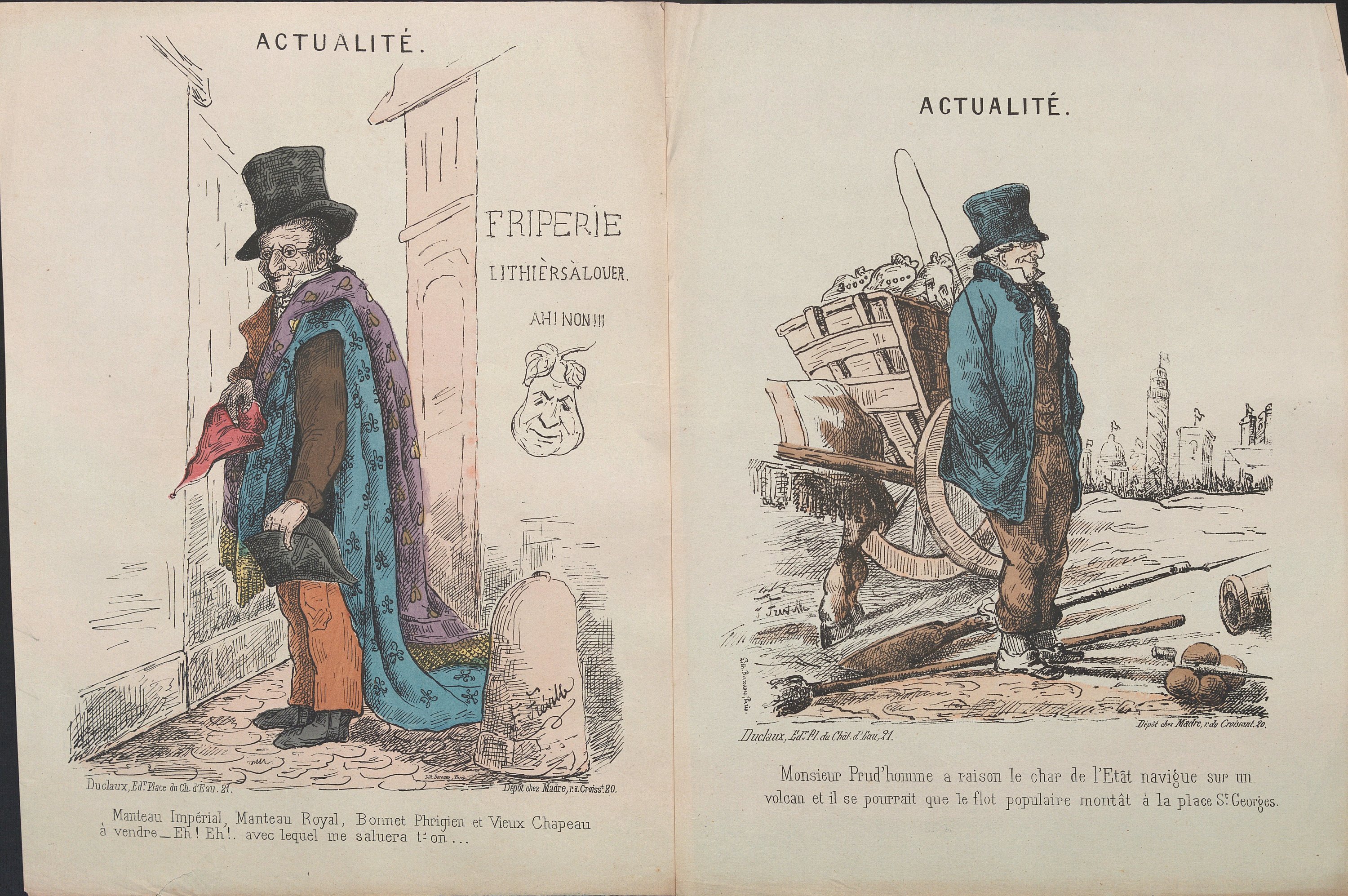 Florentin Fréville (1832-1876), soudeur, communard, garde national au 55e bataillon fédéré, 4 feuilles volantes, 32 x 25 cm: Actualité Manteau impérial, Manteau Royal ; Bonnet phrigien et vieux chapeau à vendre (petite déchirure en marge) ; Actualité Monsieur Prud’homme a raison le char de l’Etat navigue sur un volcan ; Actualité Allons donc? arrêter la République, vous ne connaissez pas la liberté ; Actualité Citoyen Pape C’est à la liberté que reste le pouvoir intemporel ;